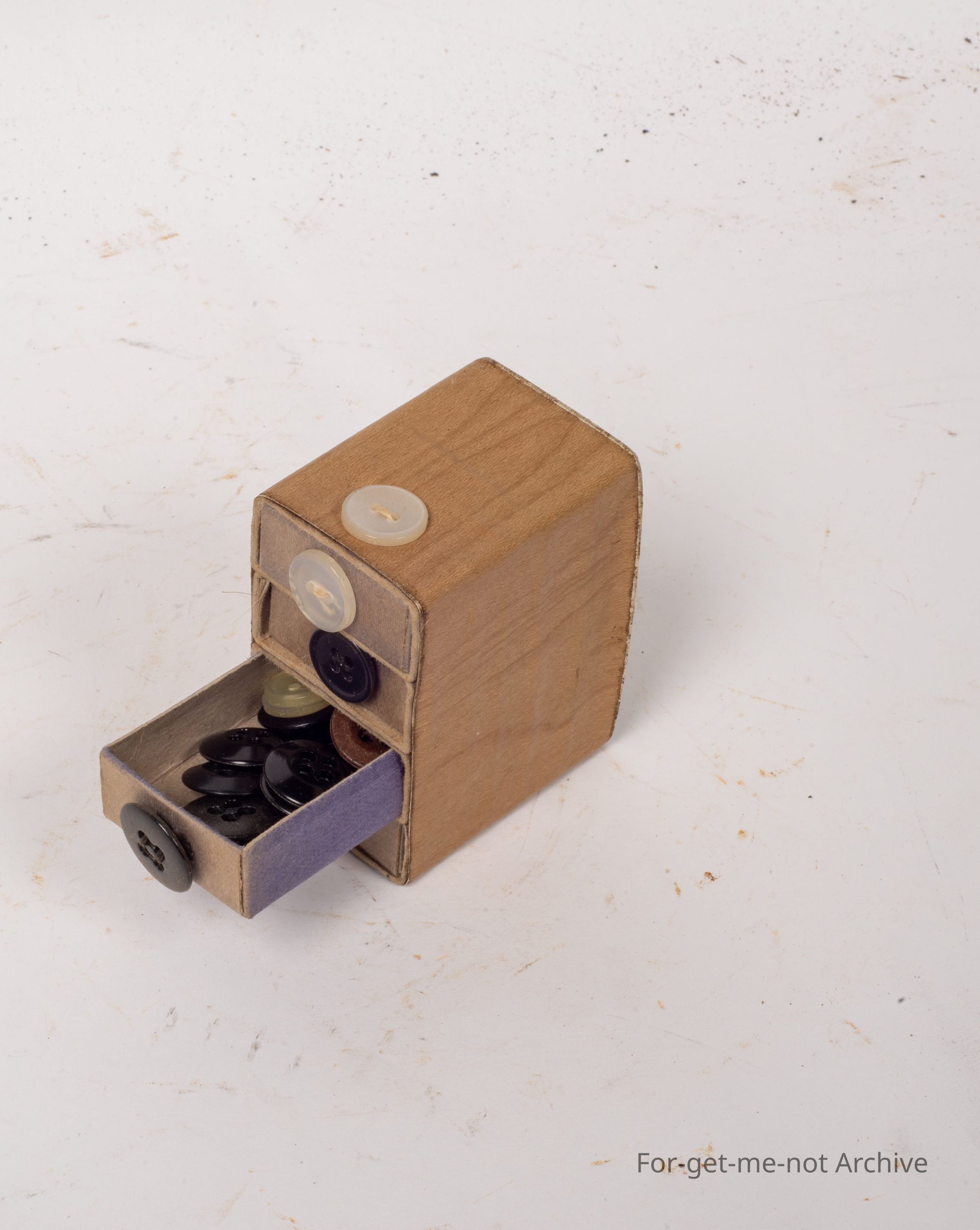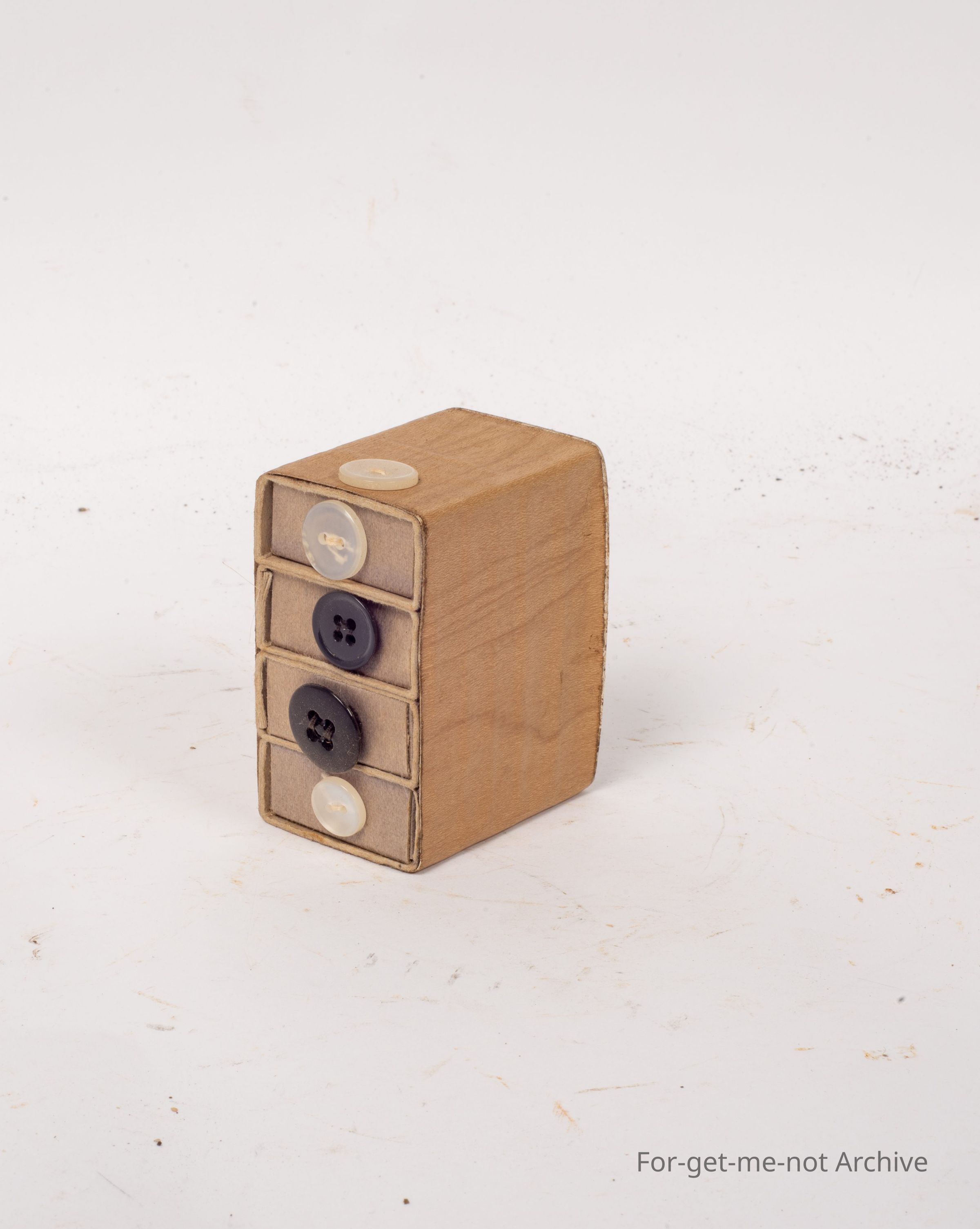 This is a little chest of drawers made from 4 matchboxes. A button is stitched onto each matchbox and one on the top to indicate where the top is. Each matchbox holds, replicas of the button represented on the front of the box. Early craft piece, in very good order.Collection