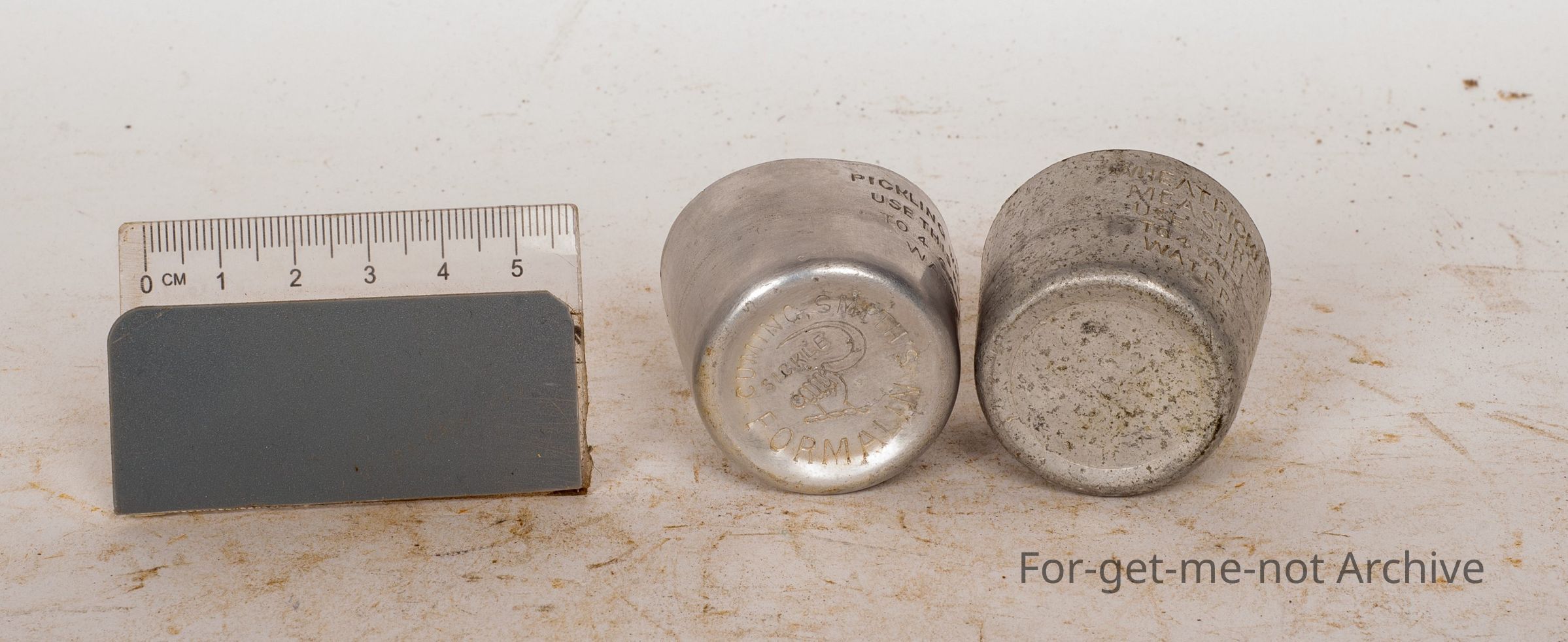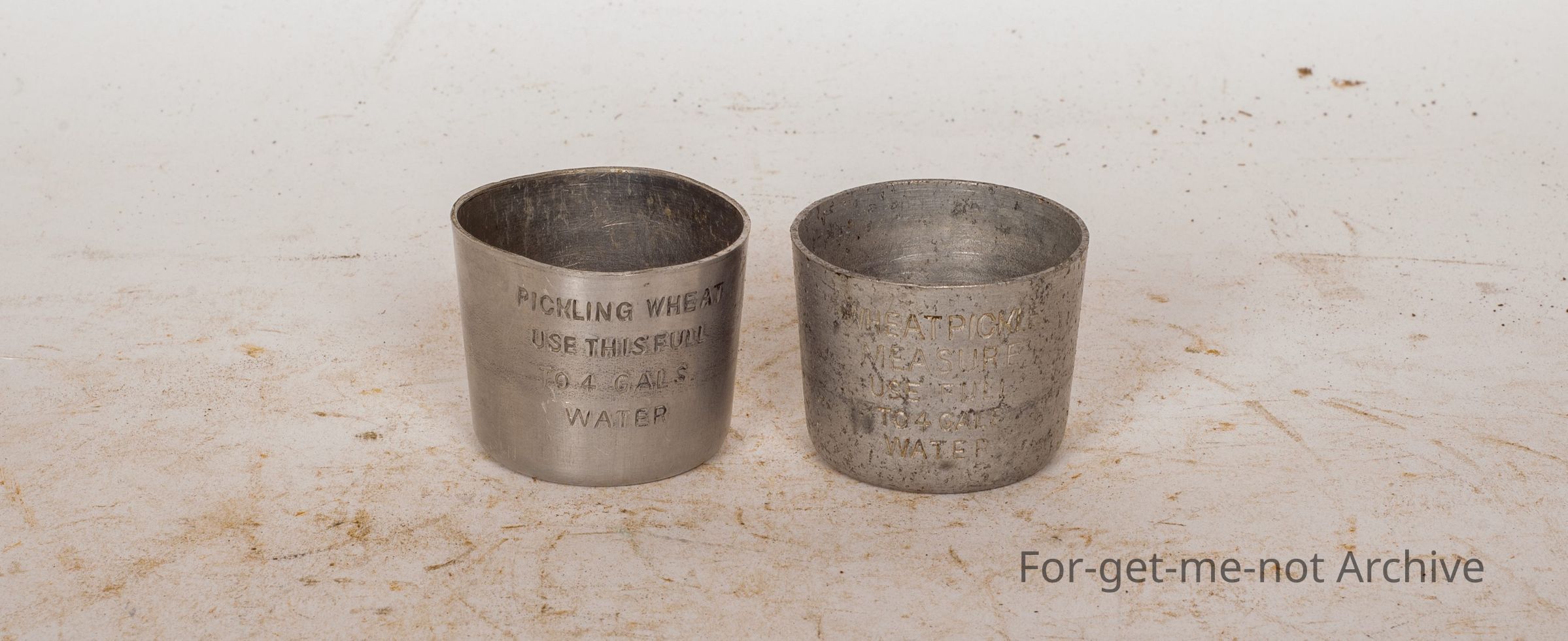 These are 2 measuring, caps for pickling wheat. The text says, pickling wheat, use this full to 4 gallons of water, wheat pickle measure, use 4 gallons to 1 fill Cumming Smith sickle brandCollection