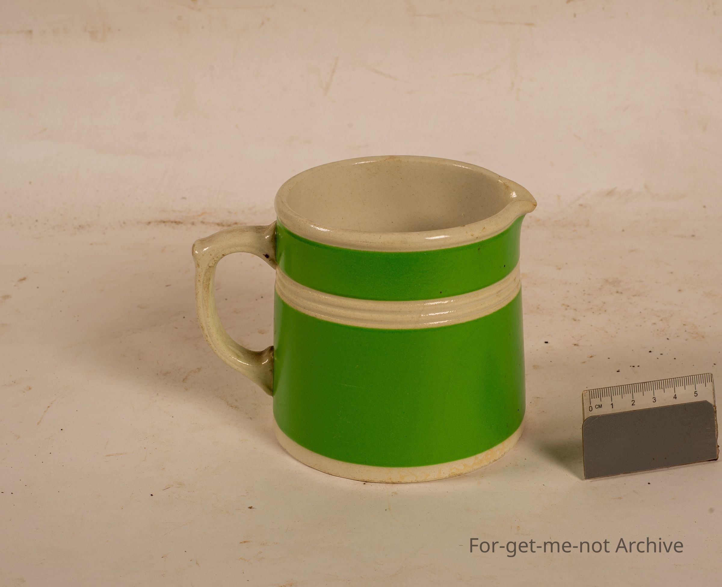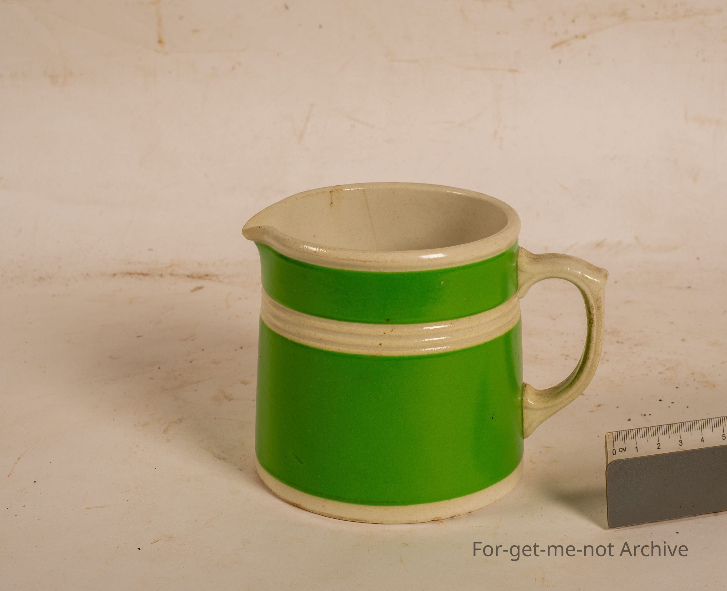 This is another milk jug or measuring jug. This one produced by Fowler Sydney, green glaze, white stripe, excellent condition.