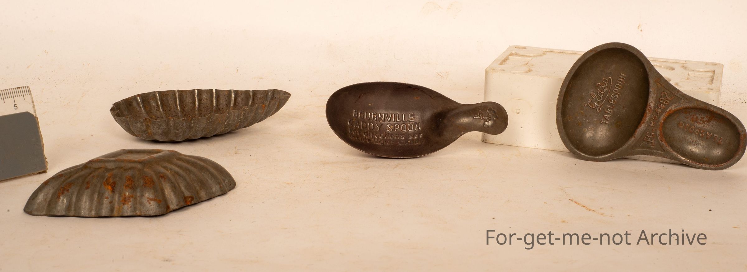 2 measuring spoons, one for Glaxo, a tablespoon on one end, teaspoon on the other. The second measuring spoon is advertising Bournville, caddy spoon, which is chocolate. Those 2 are in lovely order. The other 2 little tin pieces are just little patty cake frames, very decorative, fluted. Terrific piecesCollection