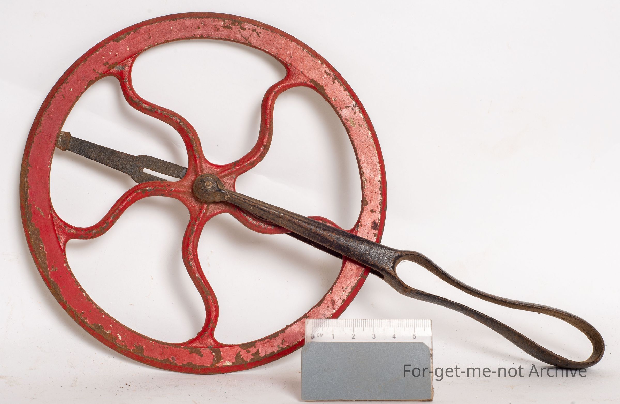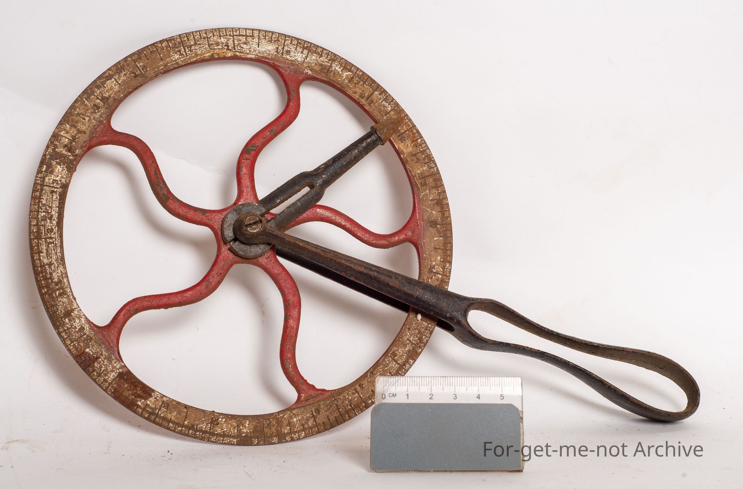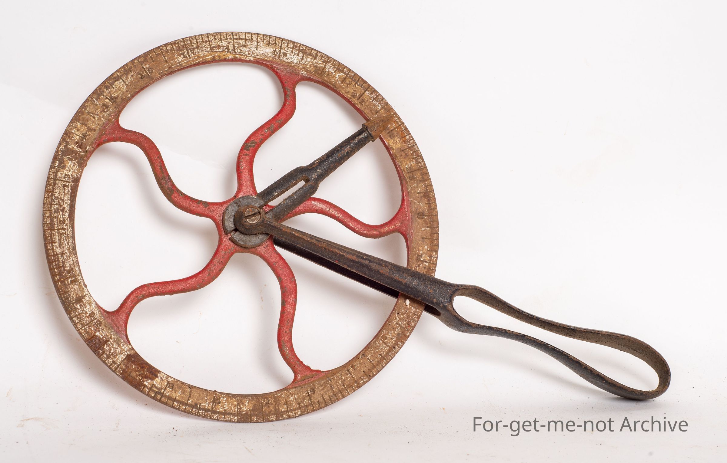 This is the tool used by realwrights or blacksmiths to determine the outer perimeter of a wheel. This one is in glorious condition. All the calibration is still very evident. The measuring, wheel or arm is still intact.Collection