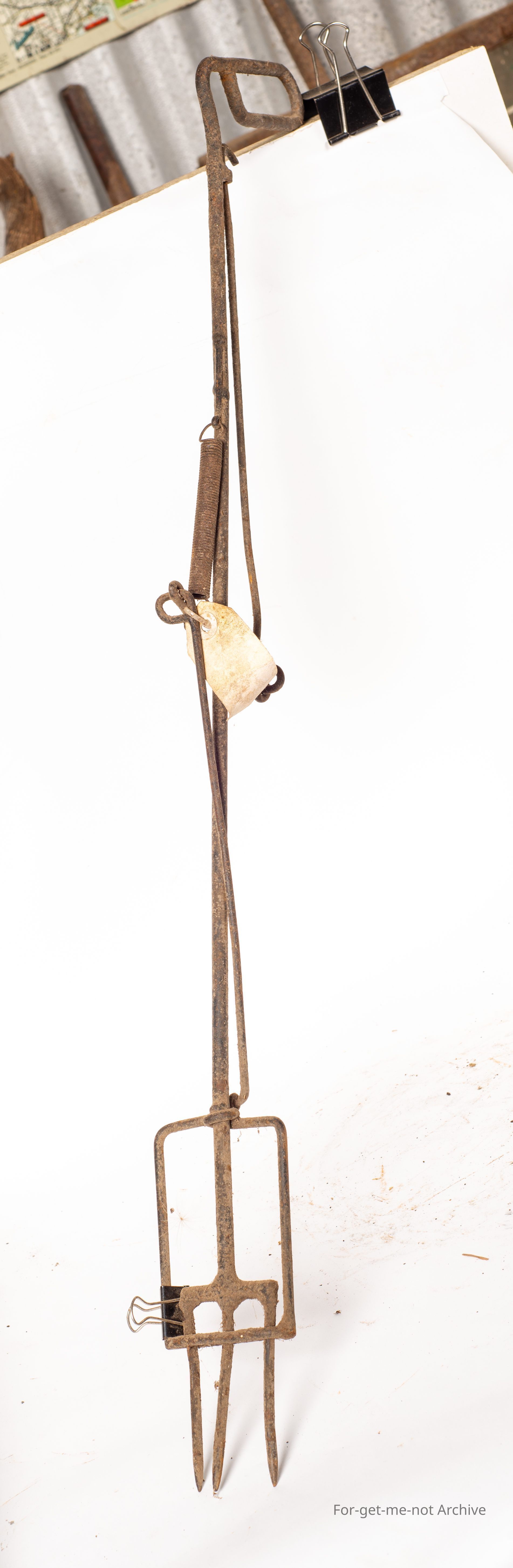 This is a mechanized fork with a pusher when you pull the little trigger. The story is they were used by bait wires for, dingoes, foxes, etcetera. You spear them into the bucket of baits. Got a piece on the 3 prongs. Pulled the trigger and it was pushed off without handling the poison. Interesting tool.Collection