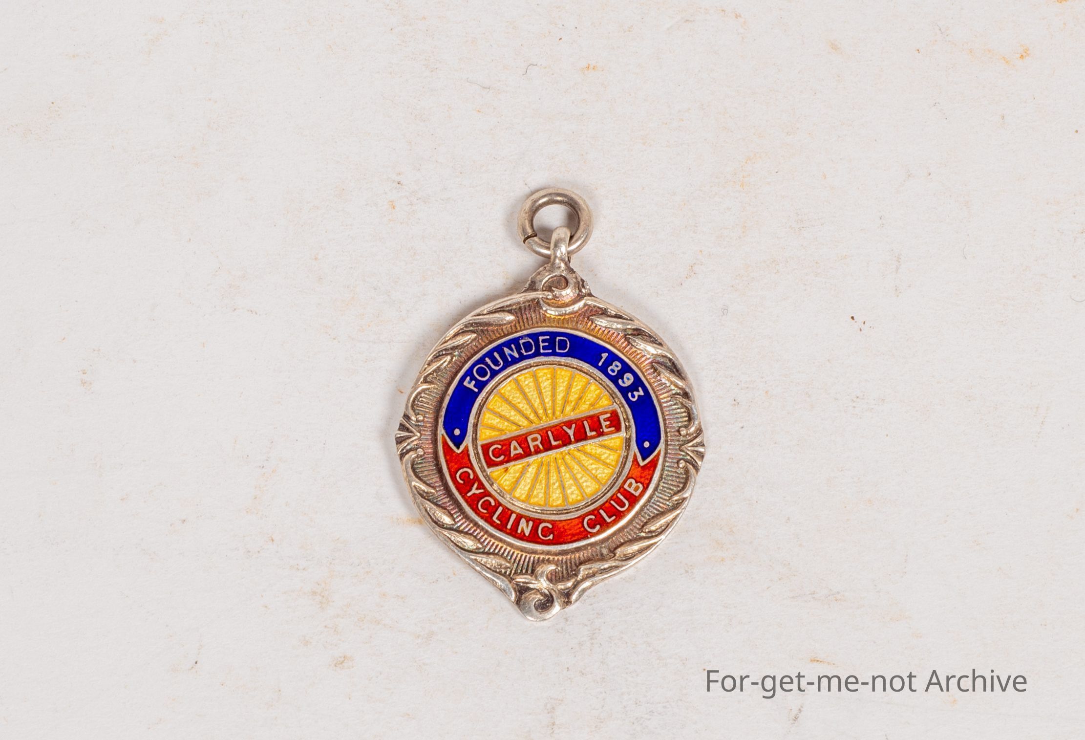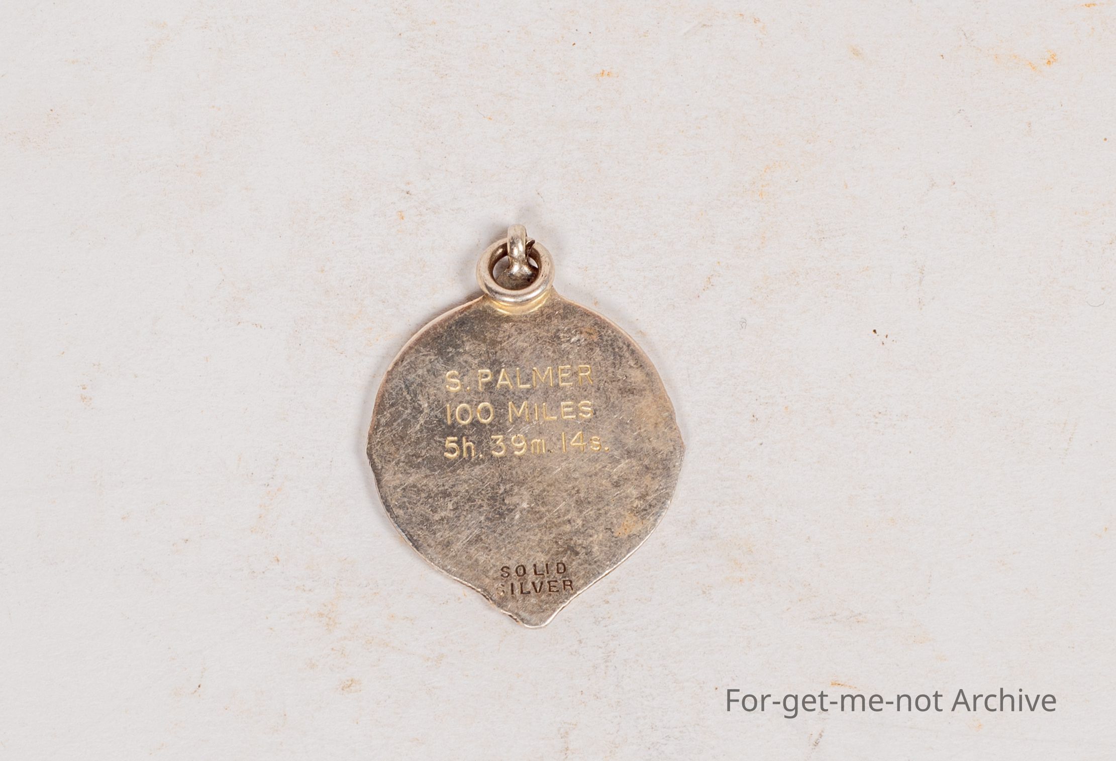 Another medallion, bicycle related, Description. Carlisle Cycling Club, founded 1893. This is has been presented to s Palmer, 100 Miles, done 5 hours, 39 minutes, 14 seconds. S Palmer was a girl. This is of solid silver.Collection