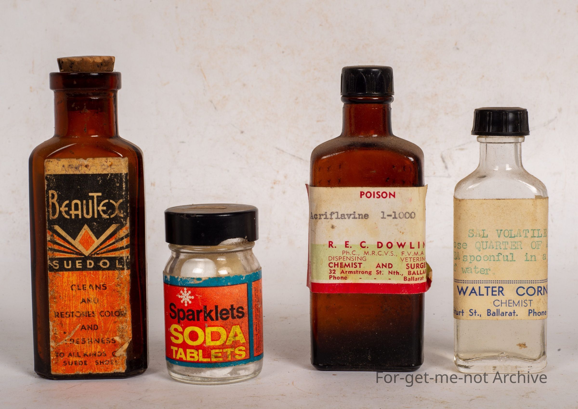 This is another group of 4 chemist bottles. First one, Aquaflavin, produced by R E C Dowling chemist Ballarat. The next one is sparklets. Soda tablets. This is something to do with a soda Syphon. A bit different These buckets. Next bottle, Sal vital. Chemist Walter Cornell, Sturt Street, Ballarat.Collection