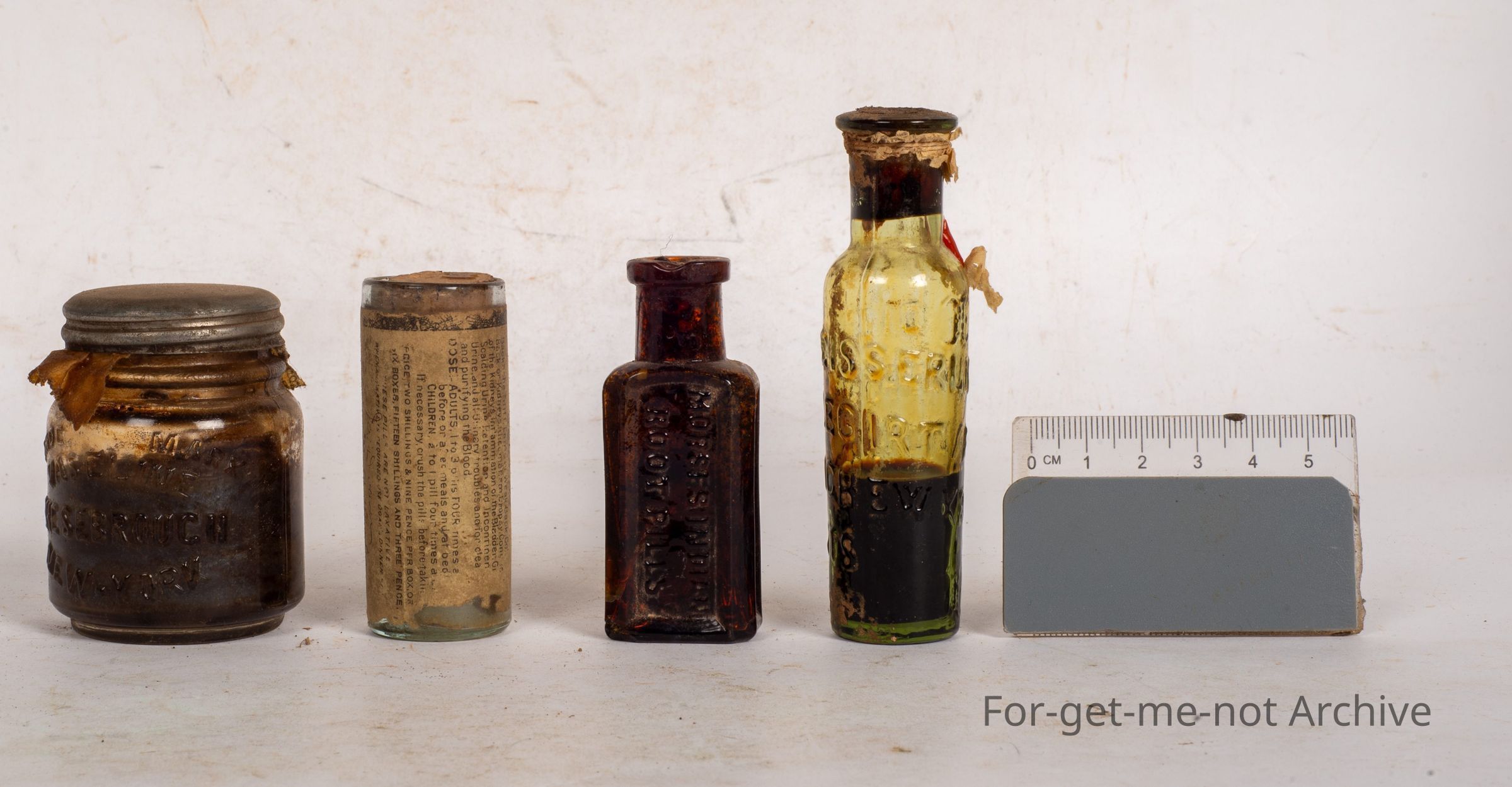 A group of 4 chemist bottles. The first one, the ointment. Apply frequently, Ballarat UFS Medical Association, Dana Street. ( Very early the bottle seems recycled with label pasted on , very early UFS Ballarat ) Next one, little brown bottle, Indian root pills. The next one, Doan's Backache and Kidney Pills, kidneys and bladder. Pretty old bottle. Next one is written in some language I don't understand. It's meant to be a very early,Collection