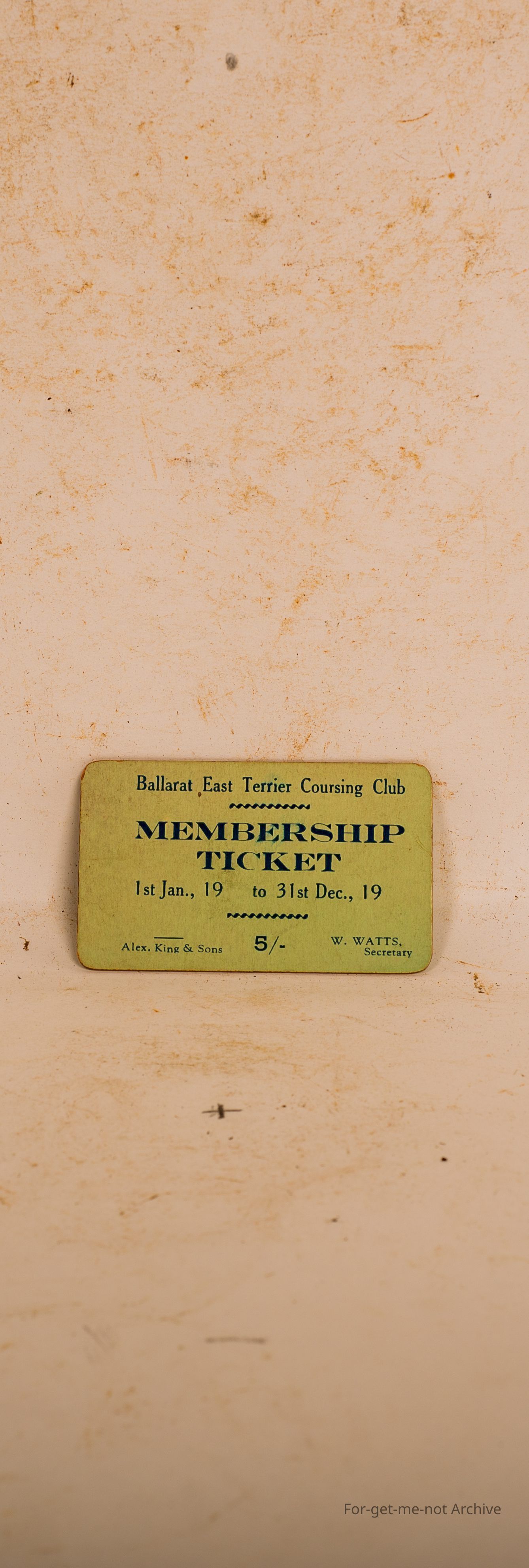 Small cardboard membership ticket for the Ballarat East Terrier Coursing Club. From 1919, quite a rare piece.