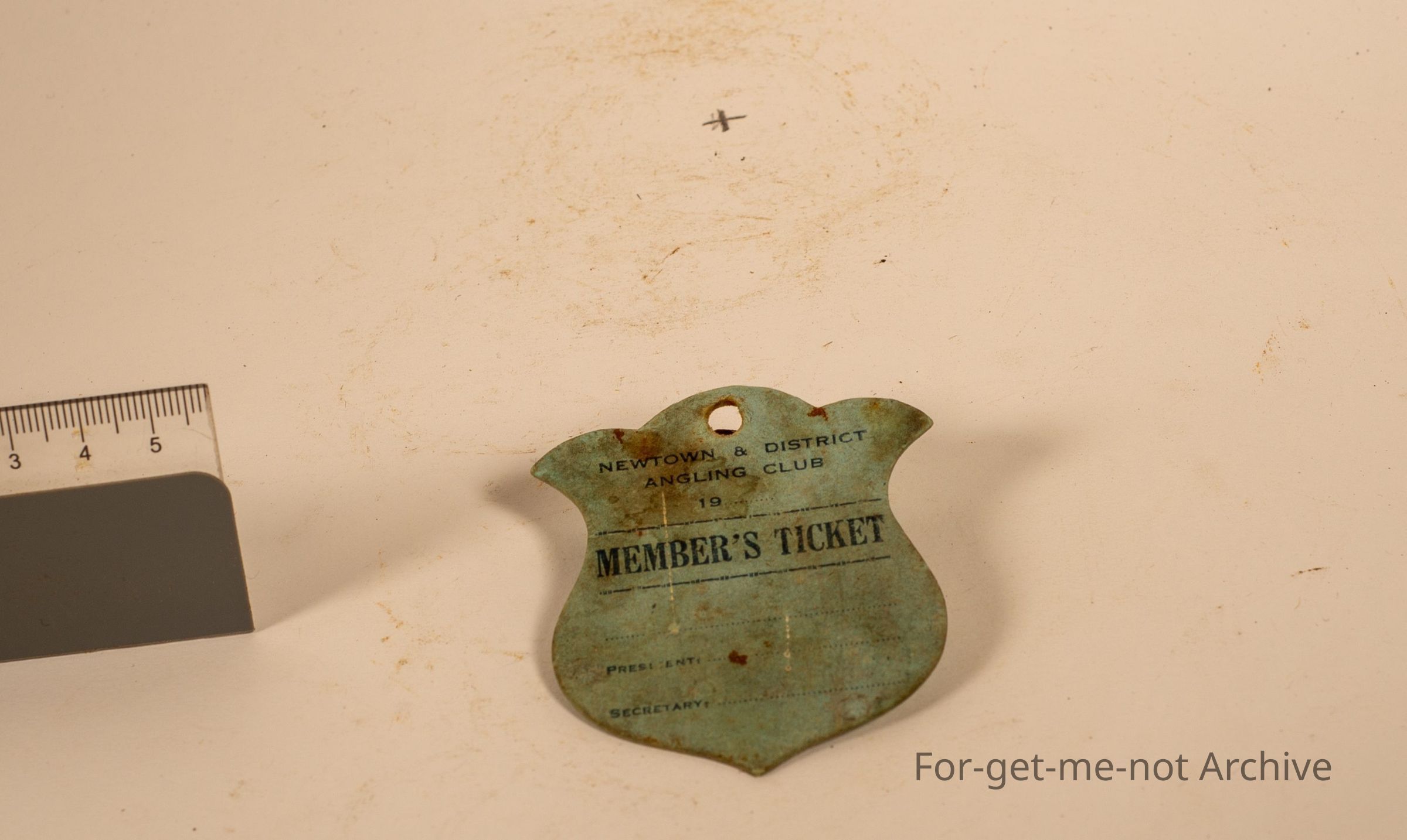 Membership ticket for Newtown and District Angling Club Members ticket in the shape of a shield. A rare piece, not in good condition.