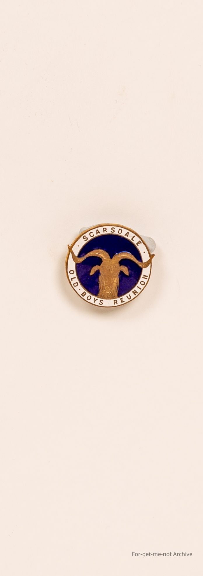 A badge from Scarsdale Old Boys Reunion with the image of a goat on the centre