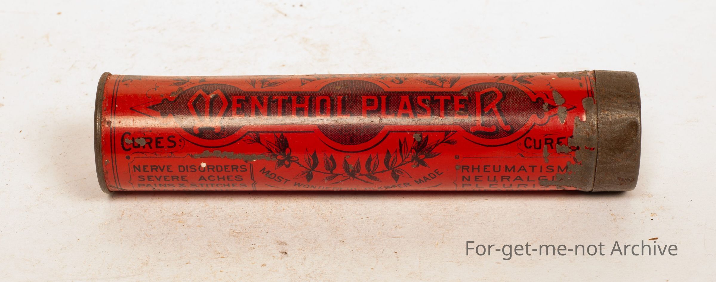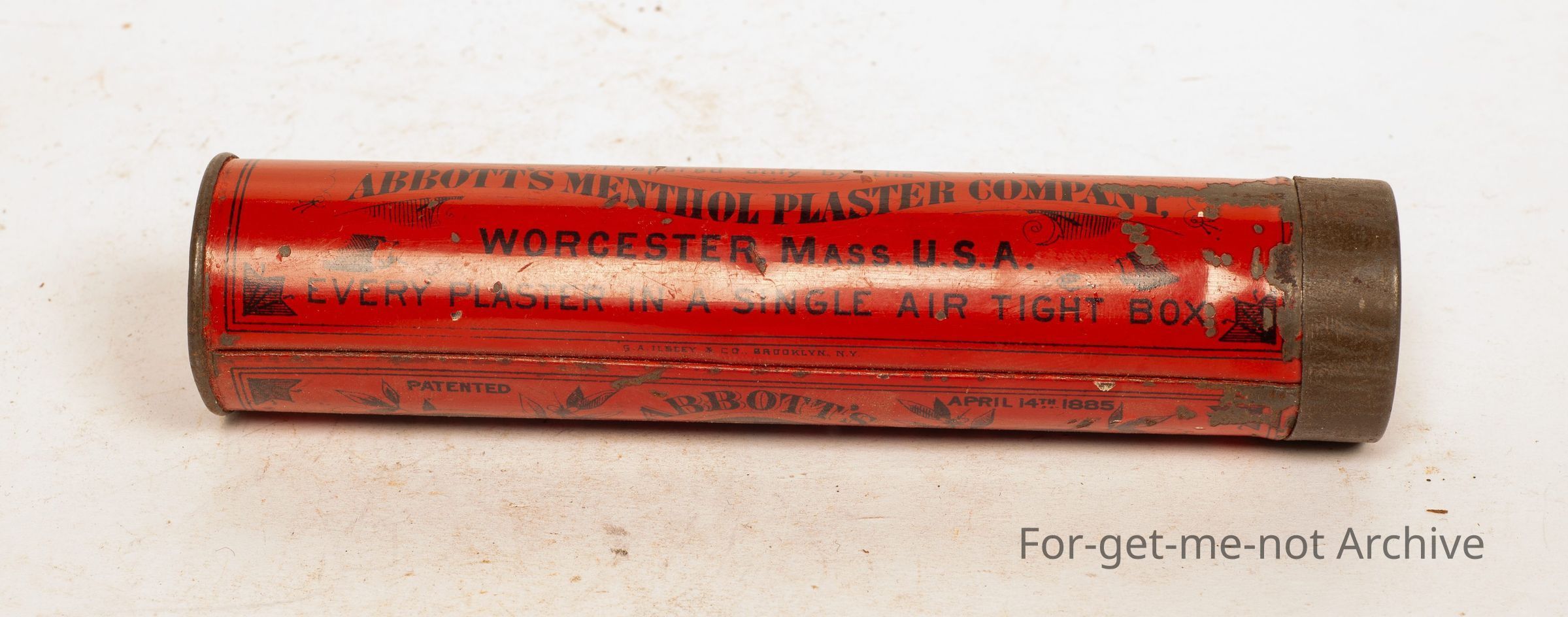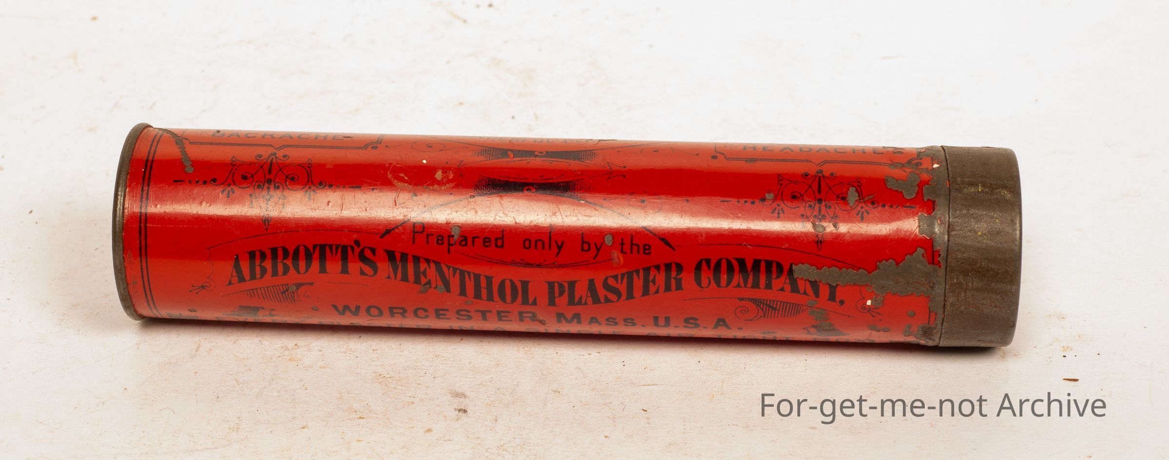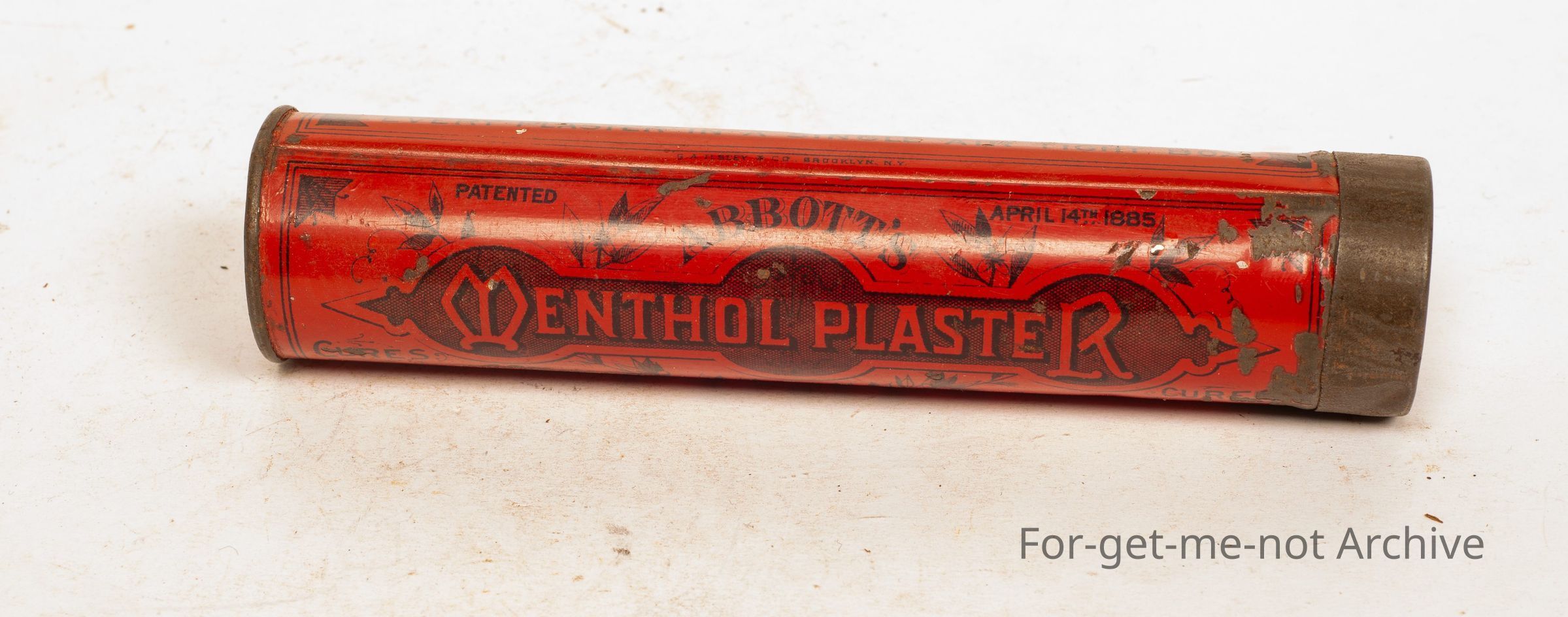 Is a tin of Abbott's Menthol plaster. For severe aches, pains, stitches, backache, rheumatism, etcetera. A bit of a cure all made in Massachusetts, USA. This chin, considering its age, is in pretty good nick. Patented 1885.Collection