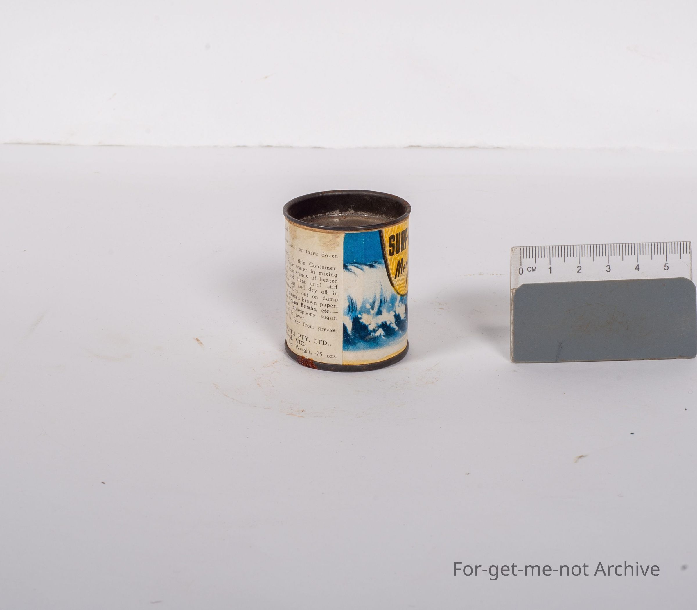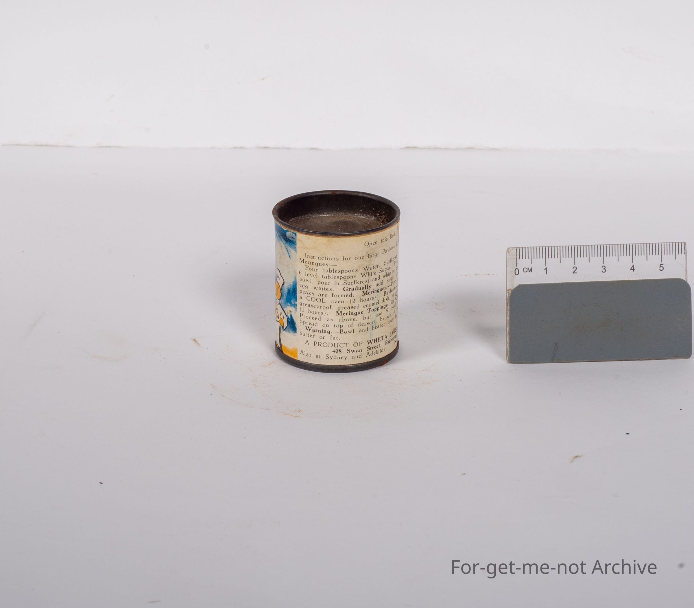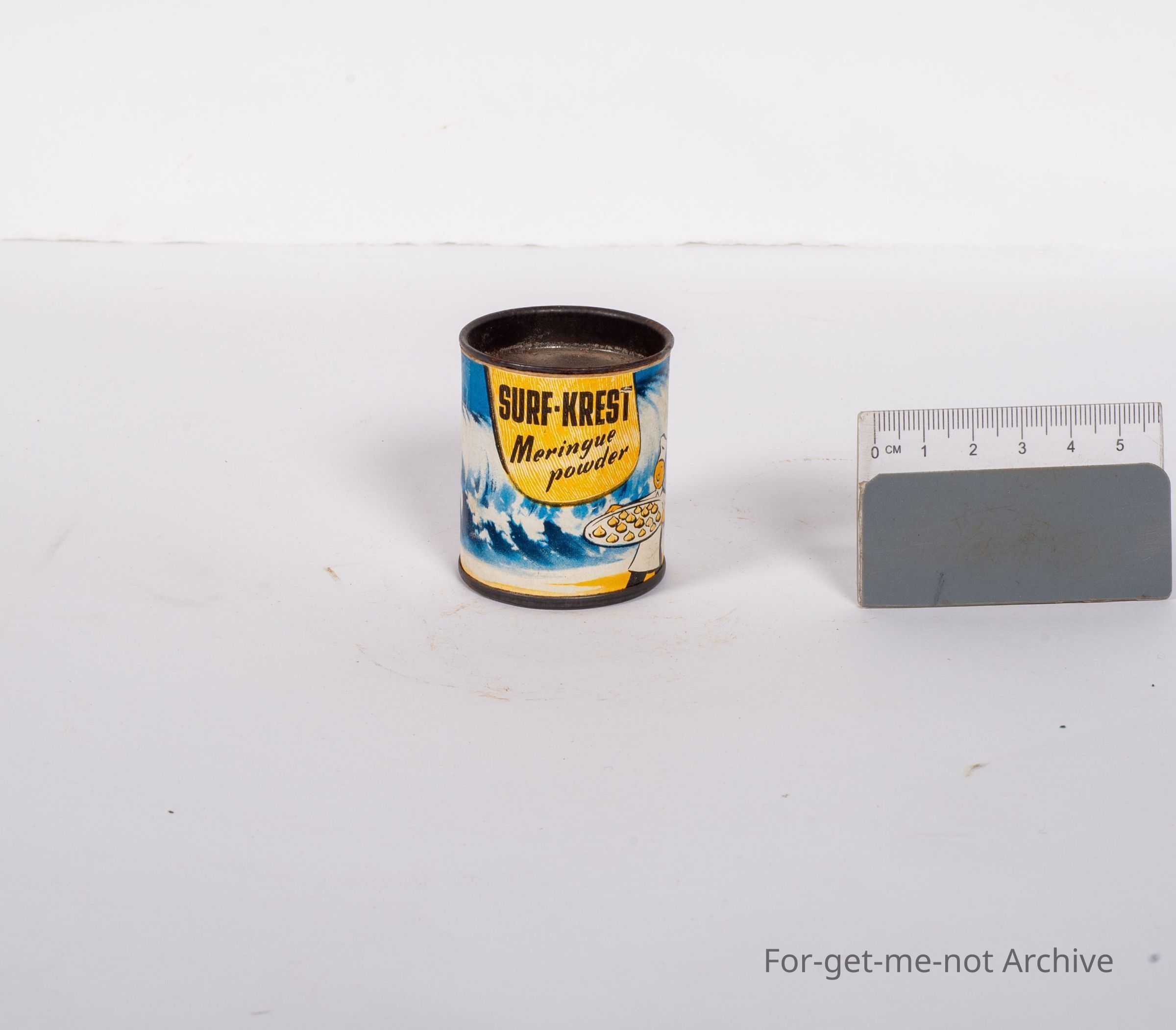 This is a very small tin. The contents are Surf Crest Meringue Powder. Has an image of a cook with a big tray of meringues. A product of Rita Australia packed in Swan Street, Richmond.Collection