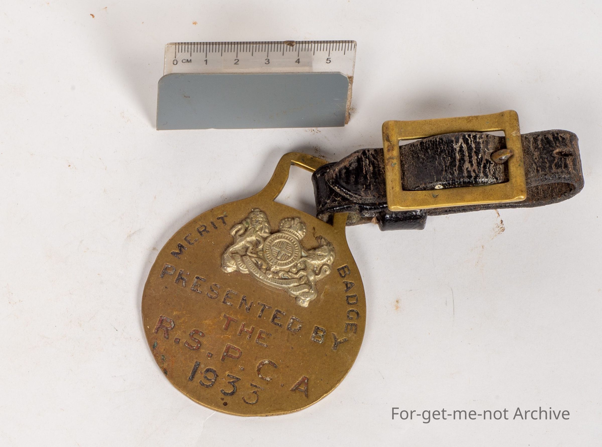 This is a plaque, presented by the RSPCA 1933, coat of arms on it. It's a merit badge for, the care taken, looking after livestock or animals in beautiful order, little leather strap,Collection