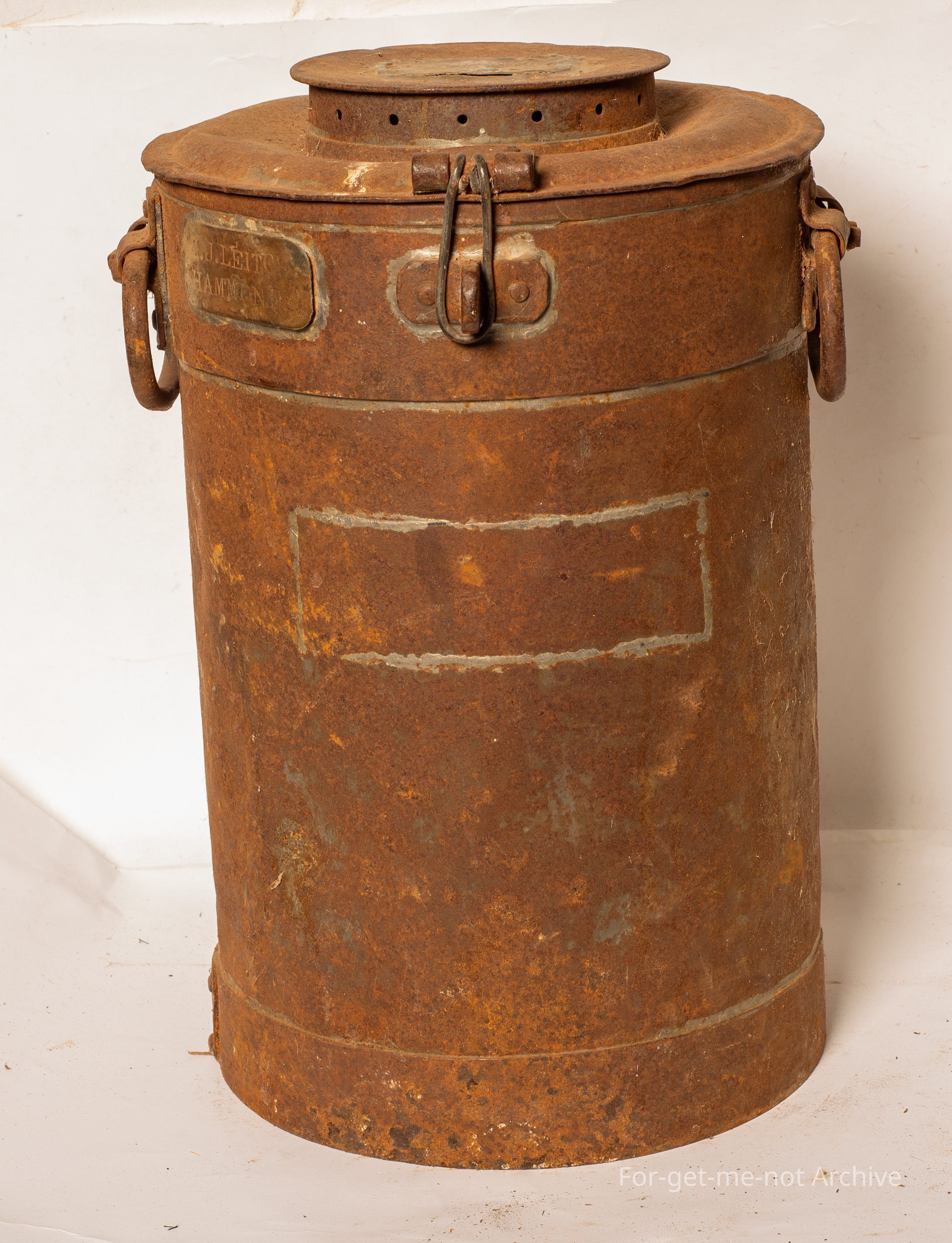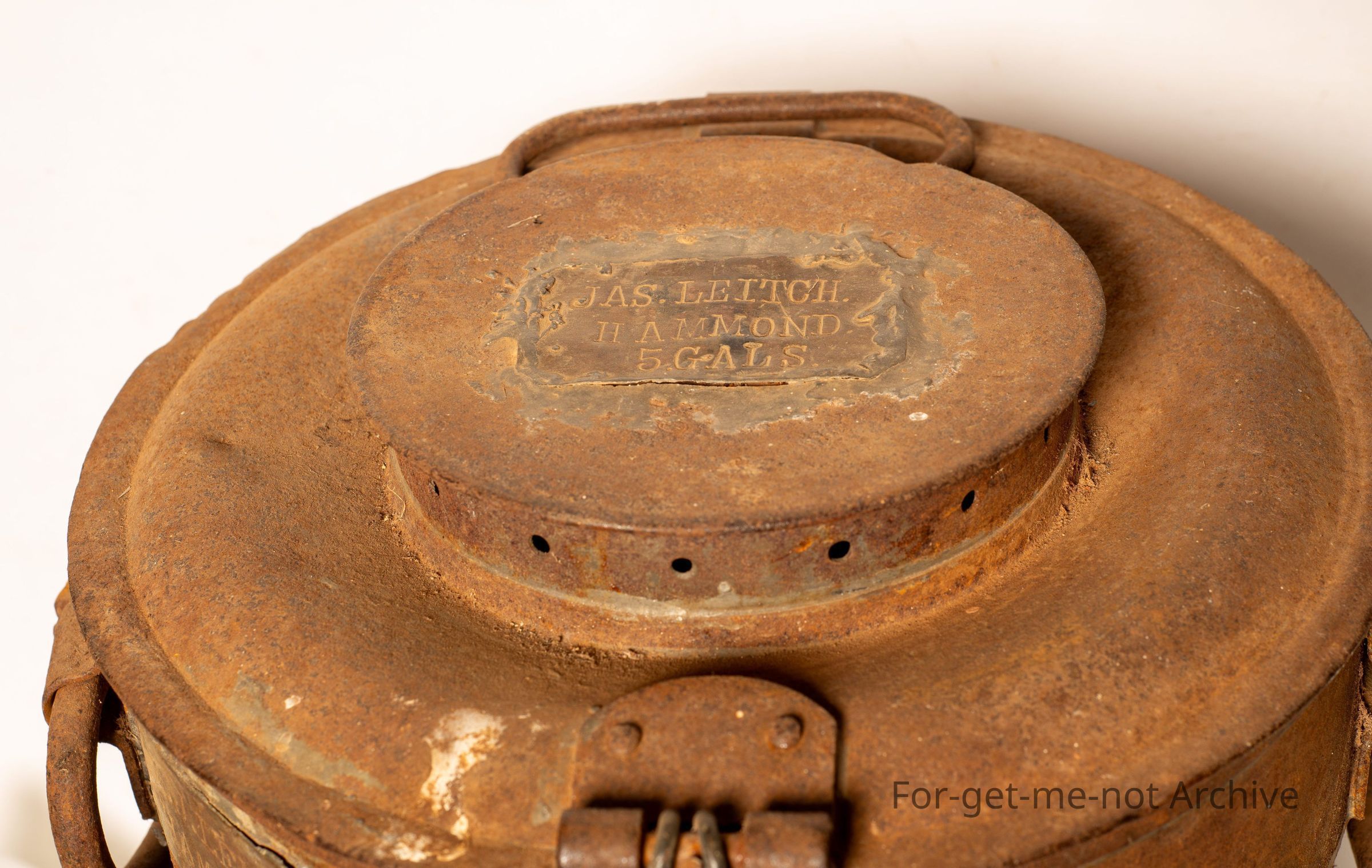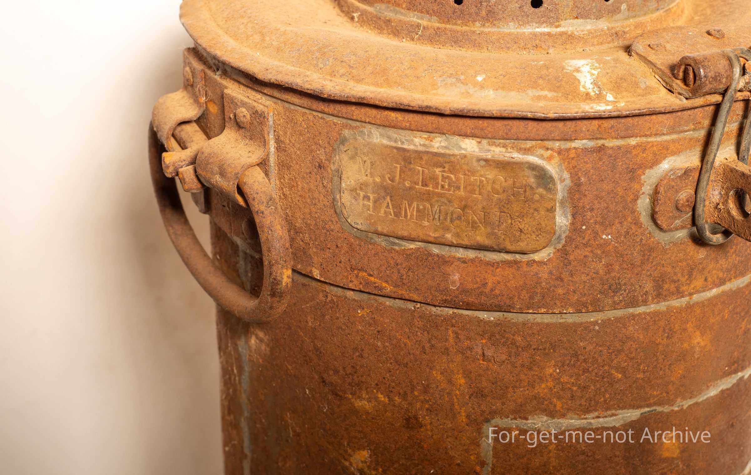 Metal, milk or cream can. This one is almost definitely manufactured by Simpson from Adelaide. Comes from an abandoned town in South Australia called Hammond. The previous owner Leech. The previous owner's, surname was Leech.Collection