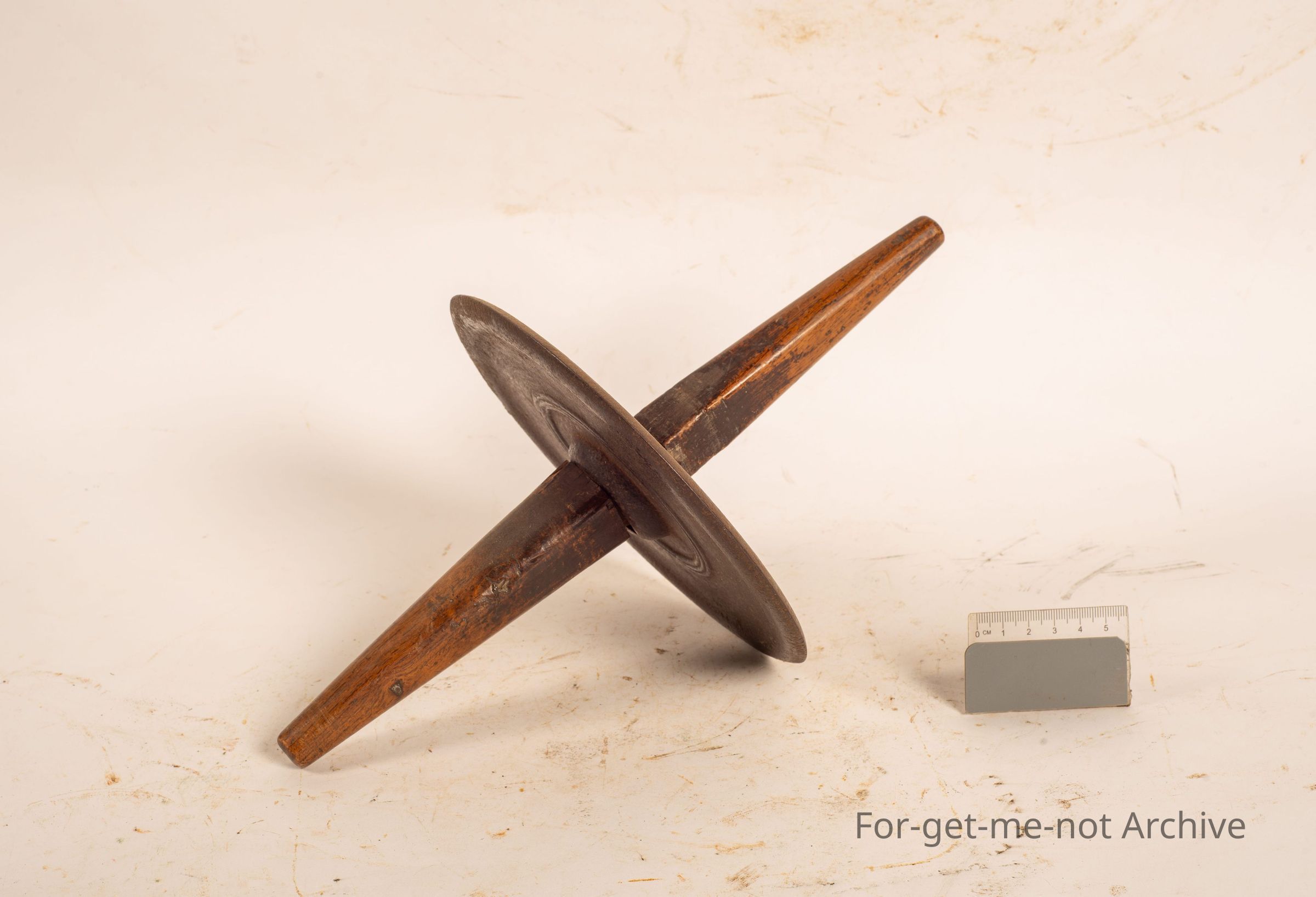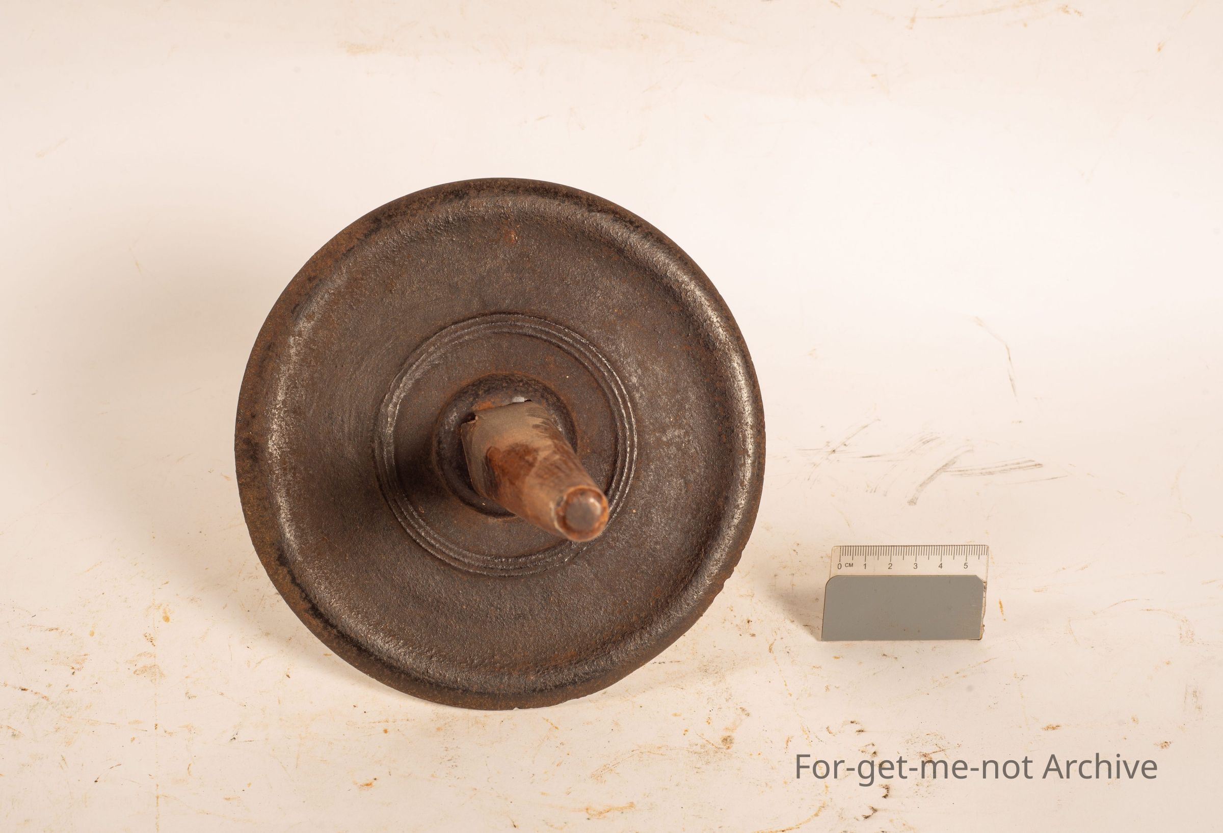 This has a metal disc, wooden handle either side, quite a sharp edge on the disc, meant to be or believed to be of chinese origin used to crush herbal medicinal products. would have been used in a V shaped trough.Collection