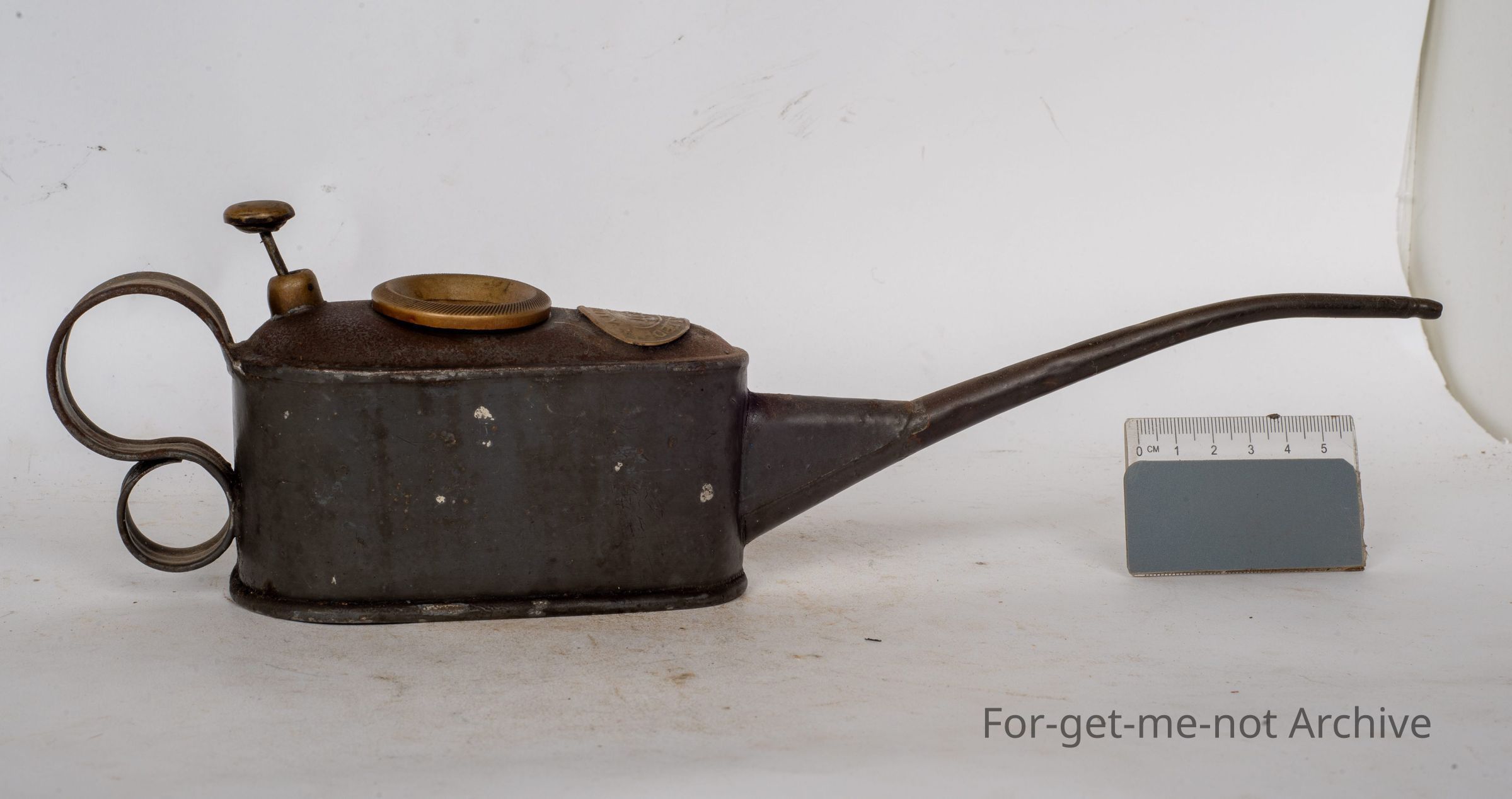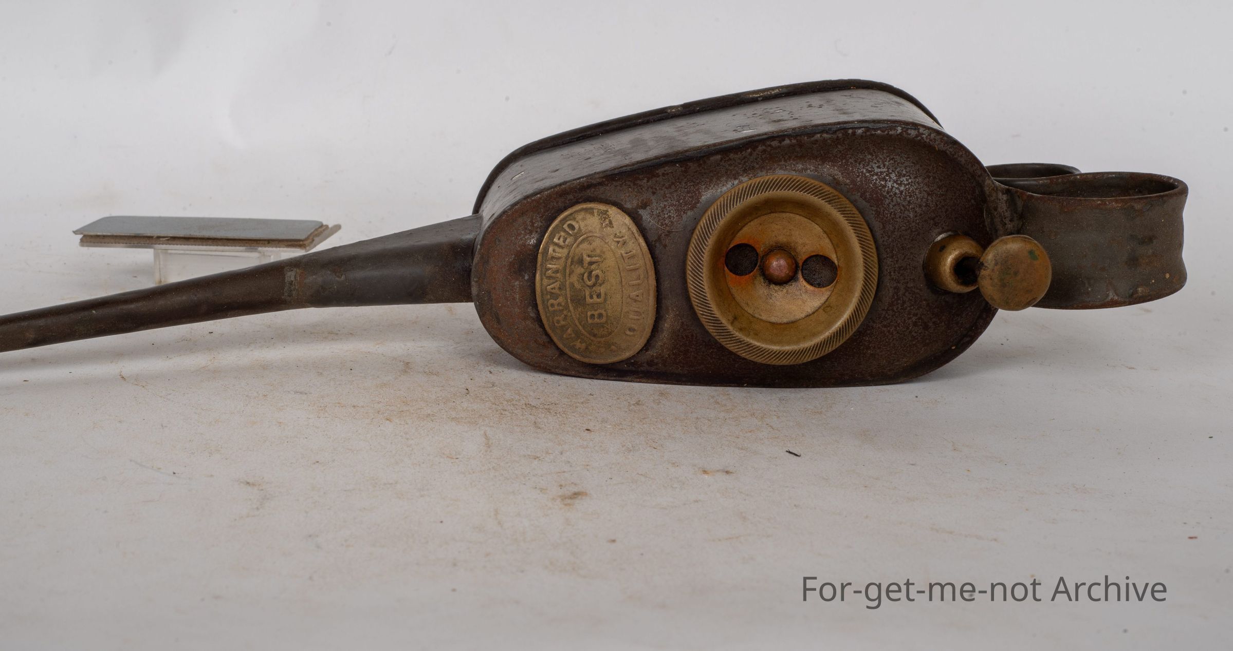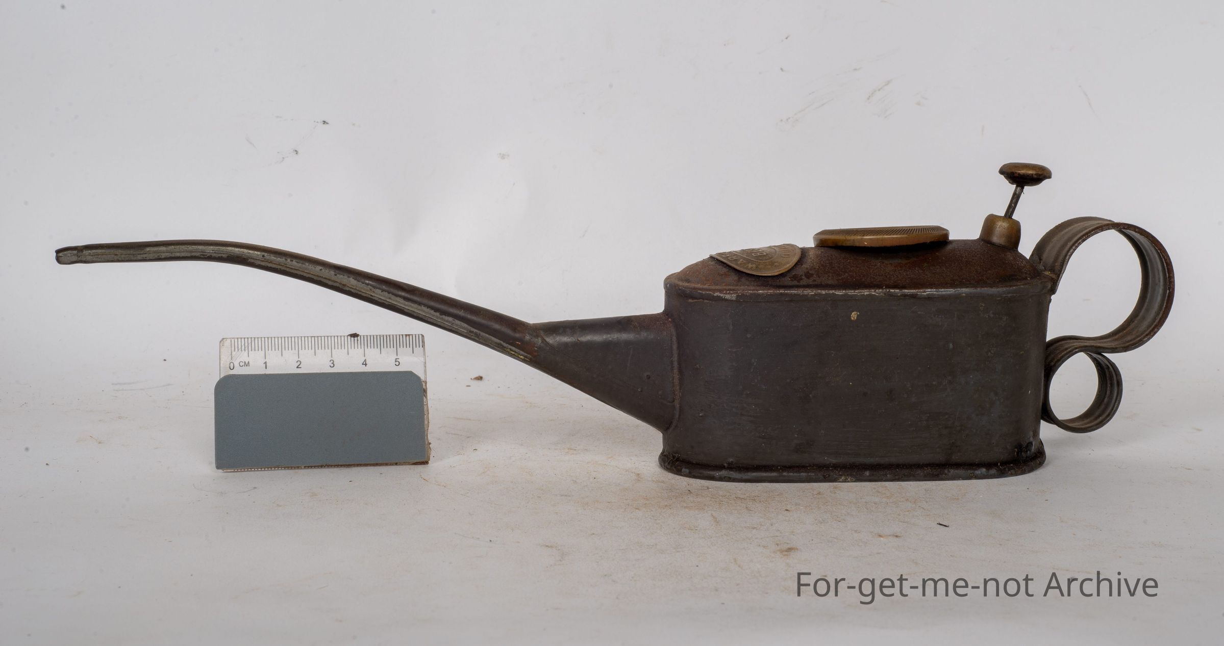 This is a neat little metal oil can. Beautiful filler, brass a brass finger pump. Has a, a little plaque on the top, warranted best quality