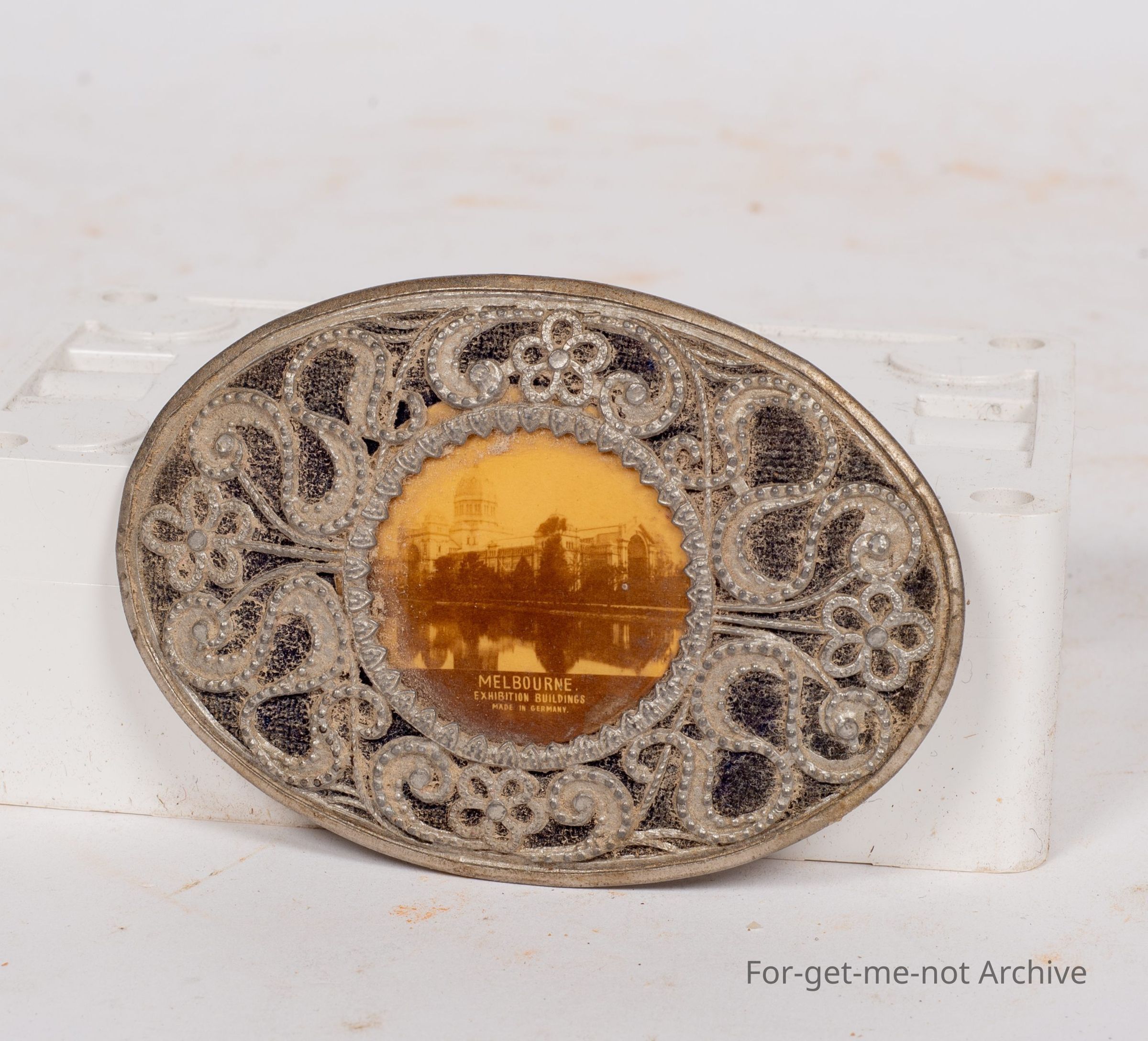 Is a wonderful little plaque, very intricate metalware, has a photo in the centre of Exhibition Building Melbourne. This would be, once again, a very early piece,