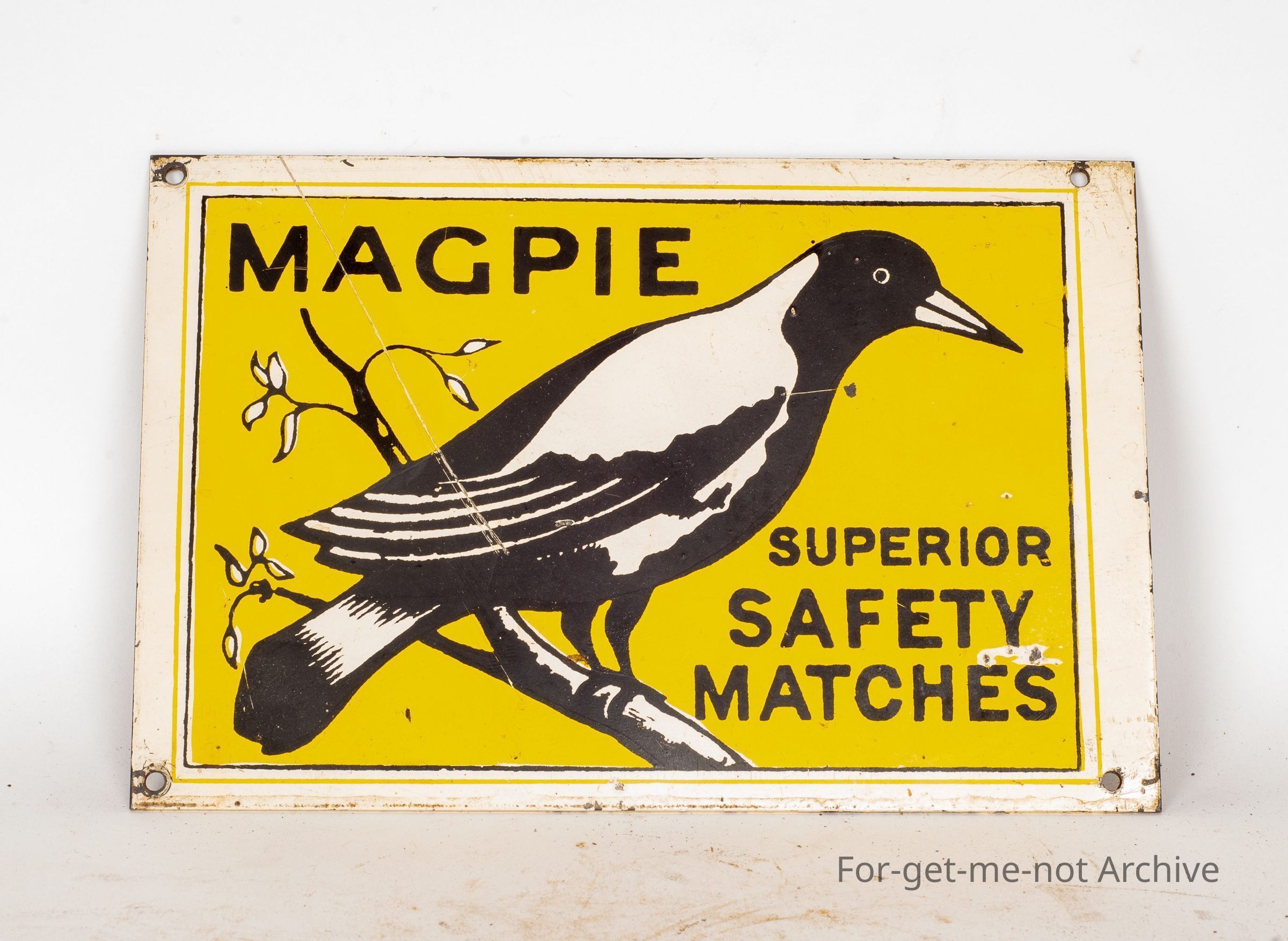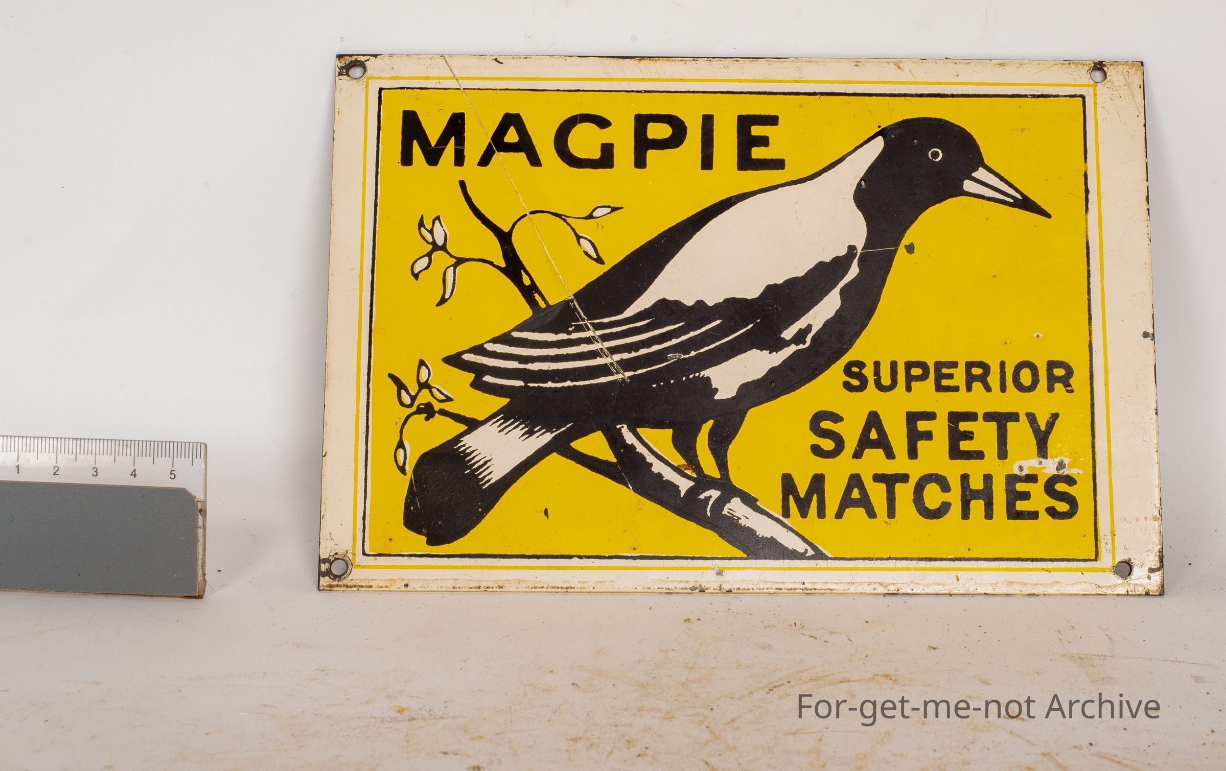 This is a rectangular, quite heavy metal plate, advertising magpie, superior safety matches with a painted image of a magpie.