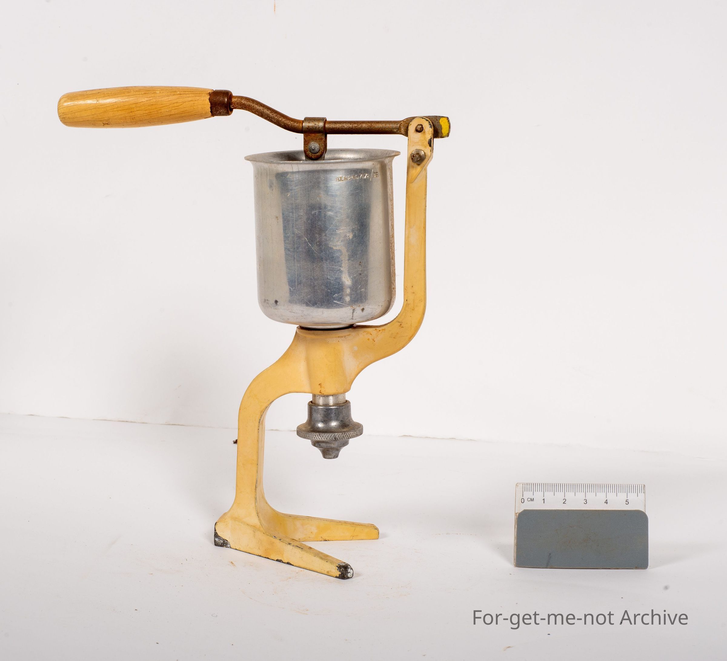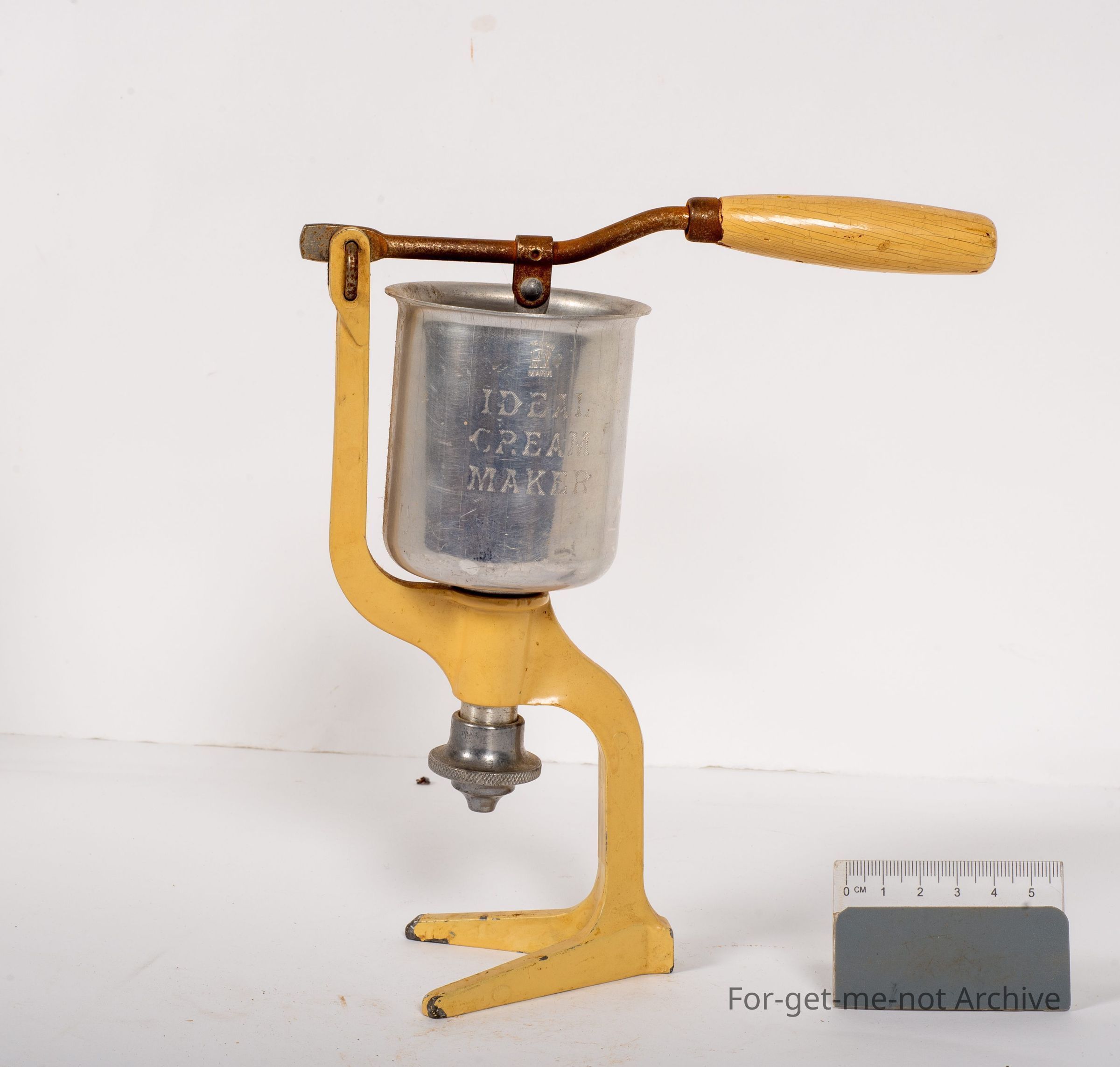 This is, a cream thickener, I think you'd call it. Have a little aluminium tub on the, it's called the Ideal Cream Maker. It's got a stamping of FAX trademark, Patent, 1933, on a little metal stand with a handle to push the cream through, through a cup or something below.Collection
