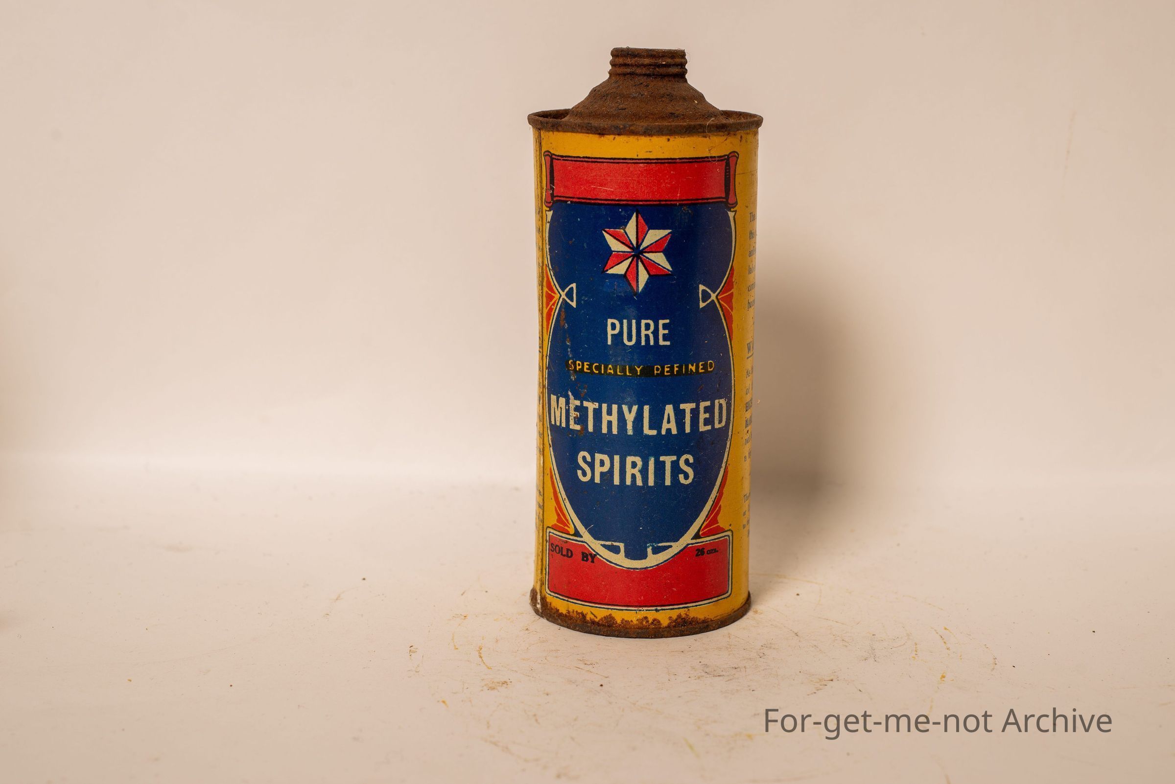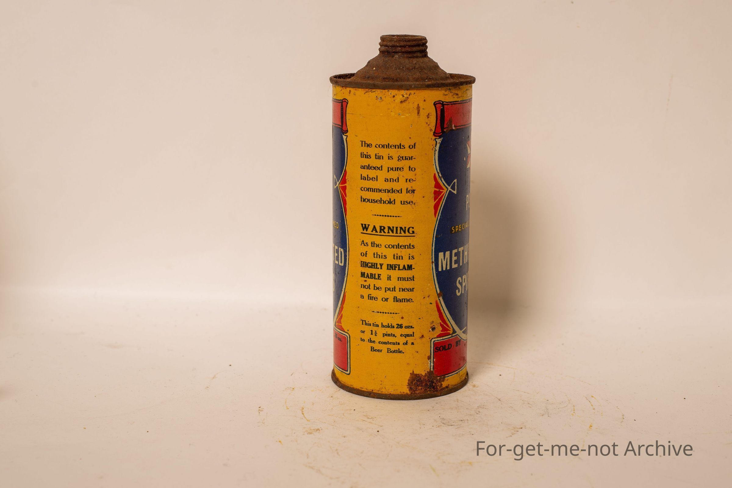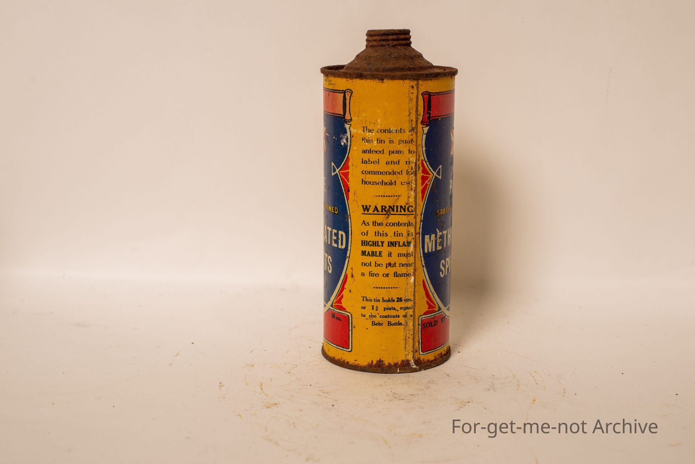 This is a methylated spirits tin. Not in bad condition. This tin holds 26 fluid ounces. No lid. Graphics, quite good. No branding