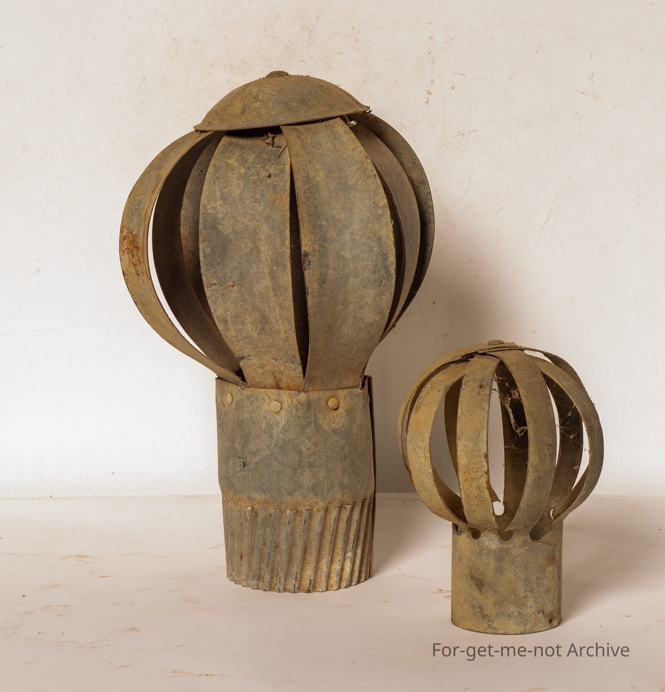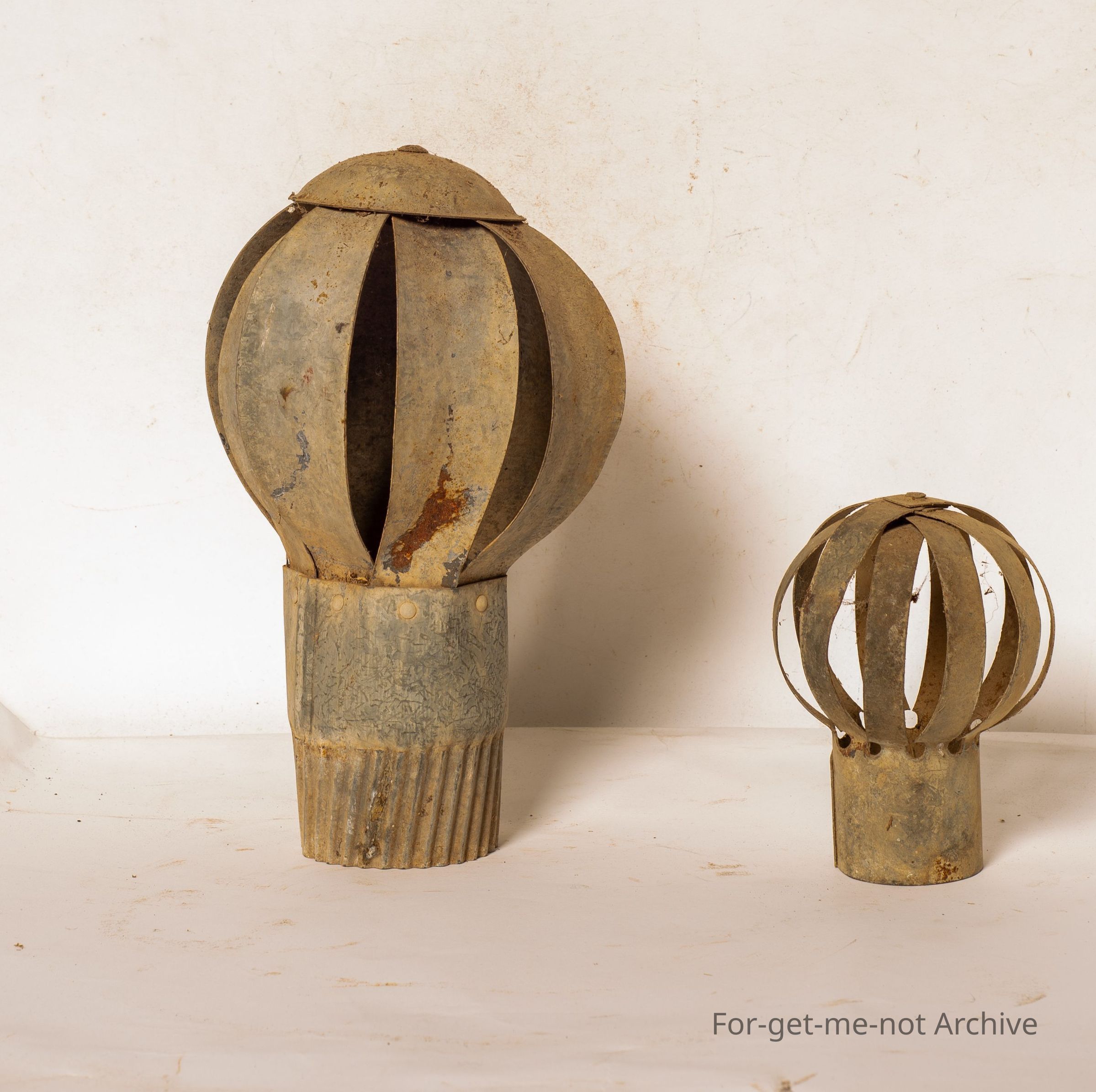 These are beautifully made Stink pipe vent heads by tinsmiths with folded pieces of tin. As a vent, these are built to keep birds from nesting or falling down the pipes.