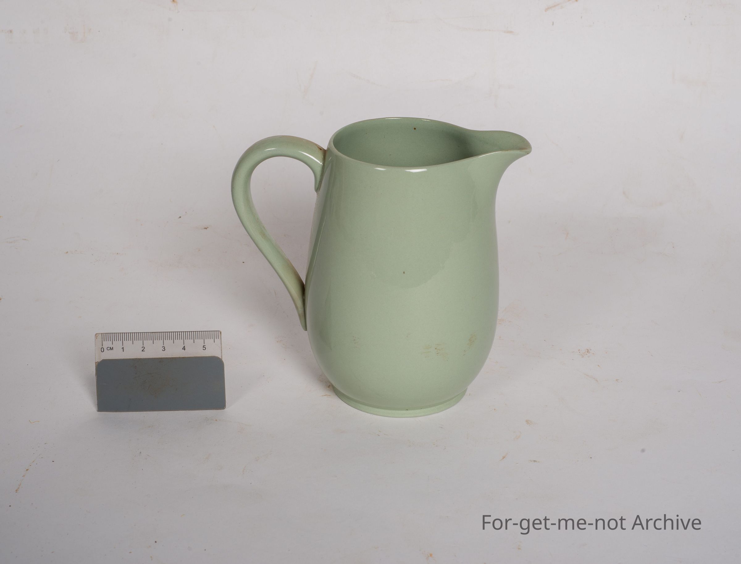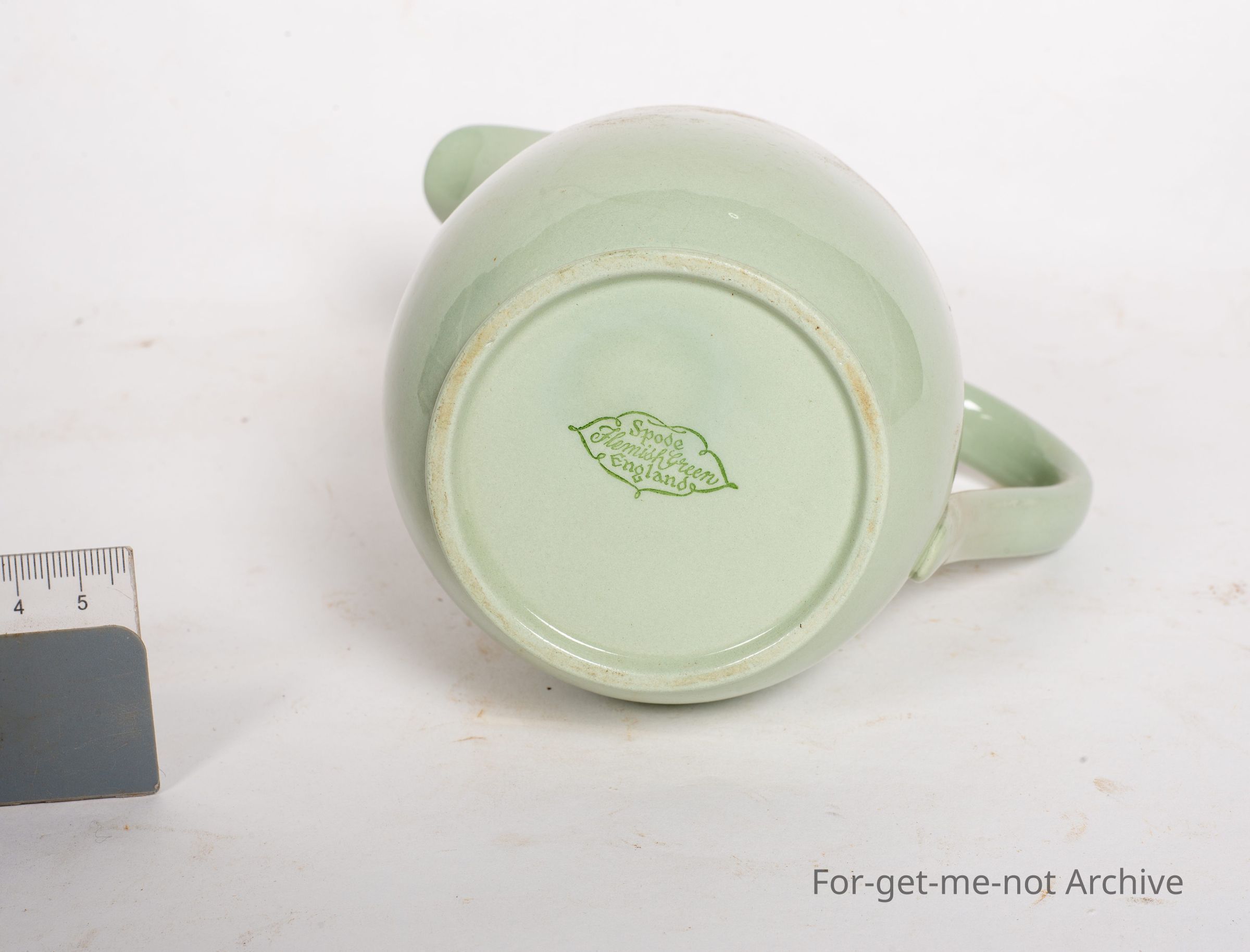 This is a lovely simple, like a milk jug, lightly made, light green glaze, stamps, bowed England,