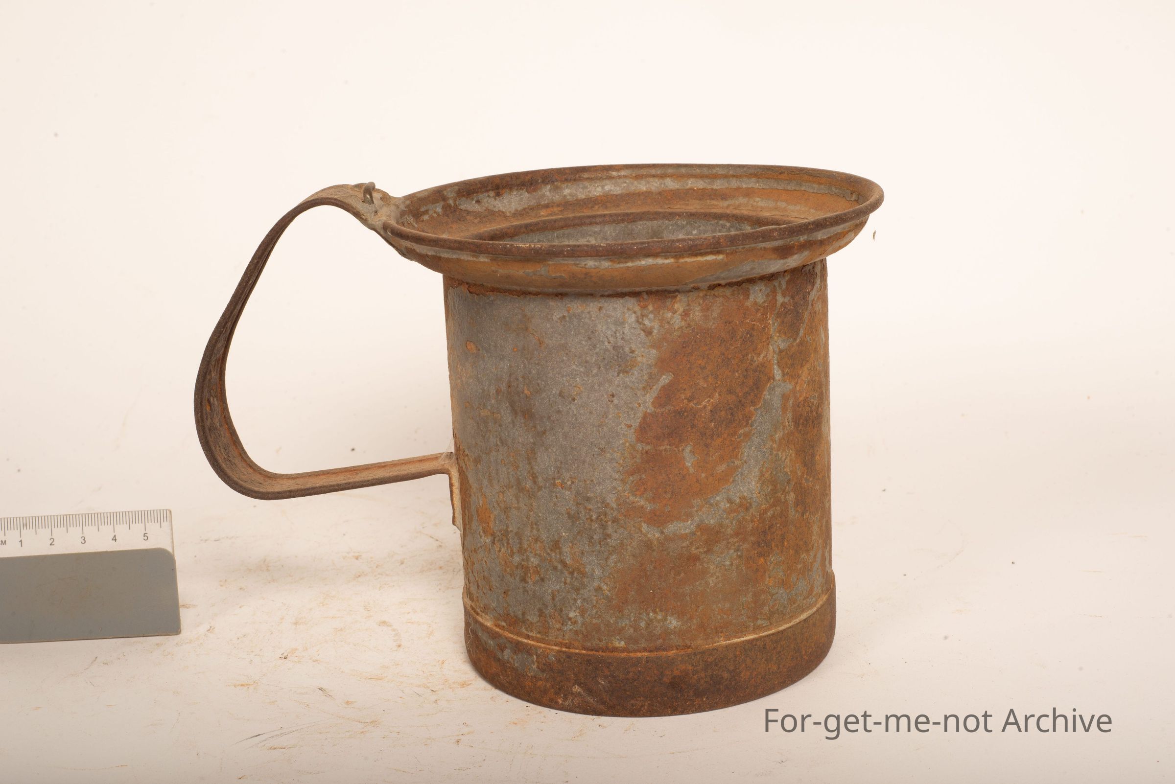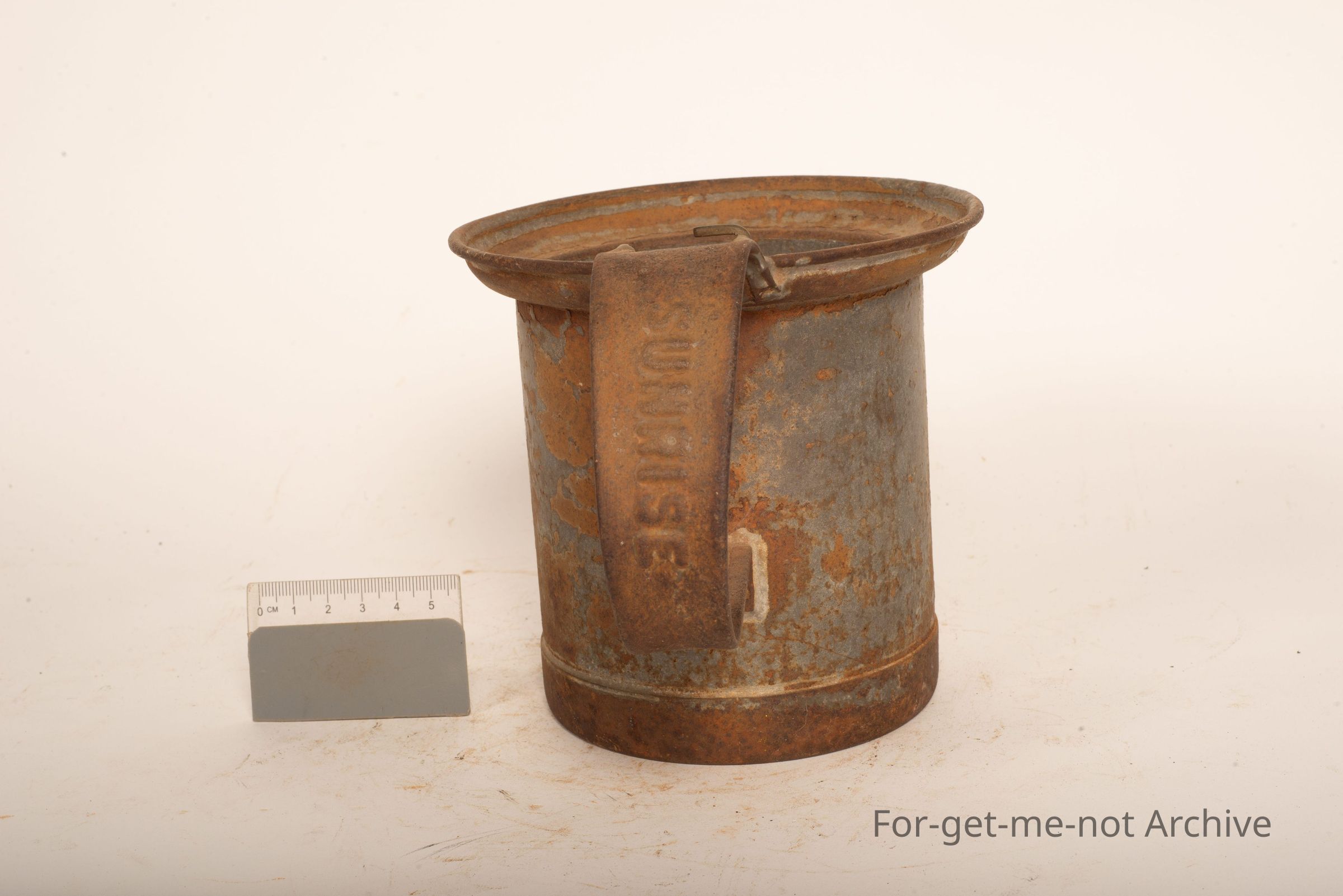 Another milk pail made of tin. This one stamped sunrise on the handle. Once again, the lid is absent