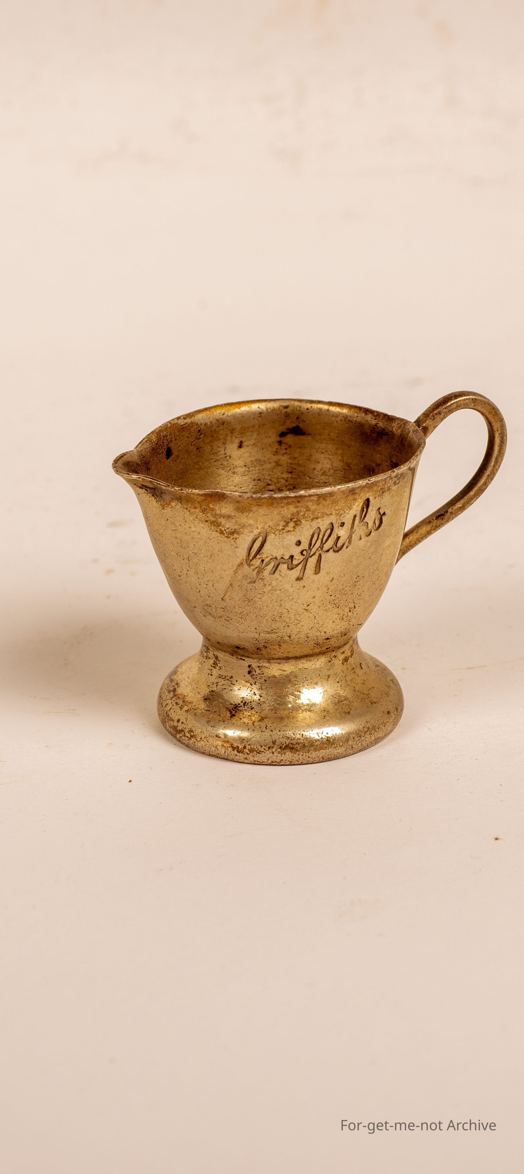 Small milk pour, electroplated and advertising Griffiths Tea. Beautiful little thing