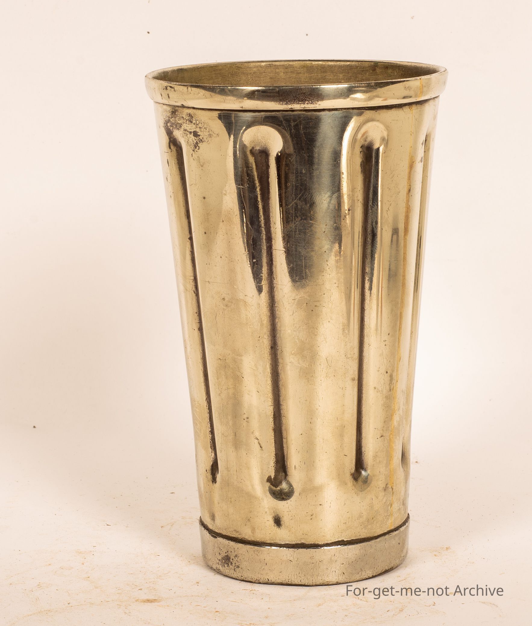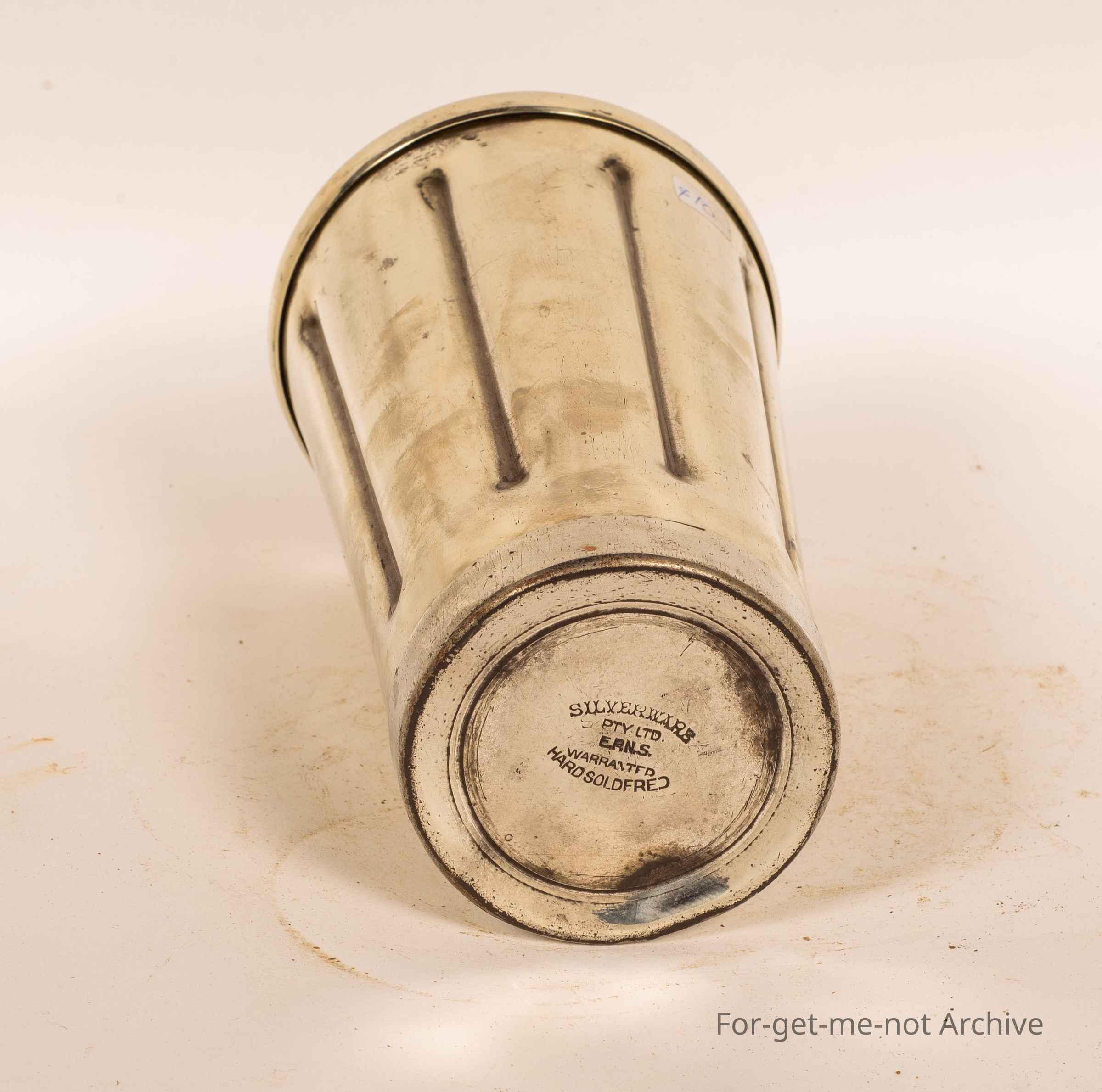This is a glorious milkshake cup that went on to the milkshake machine, fluted all around. This is, stamped on the bottom, Silverware Proprietary Limited, hard soldered. This is the best condition one that we have foundCollection