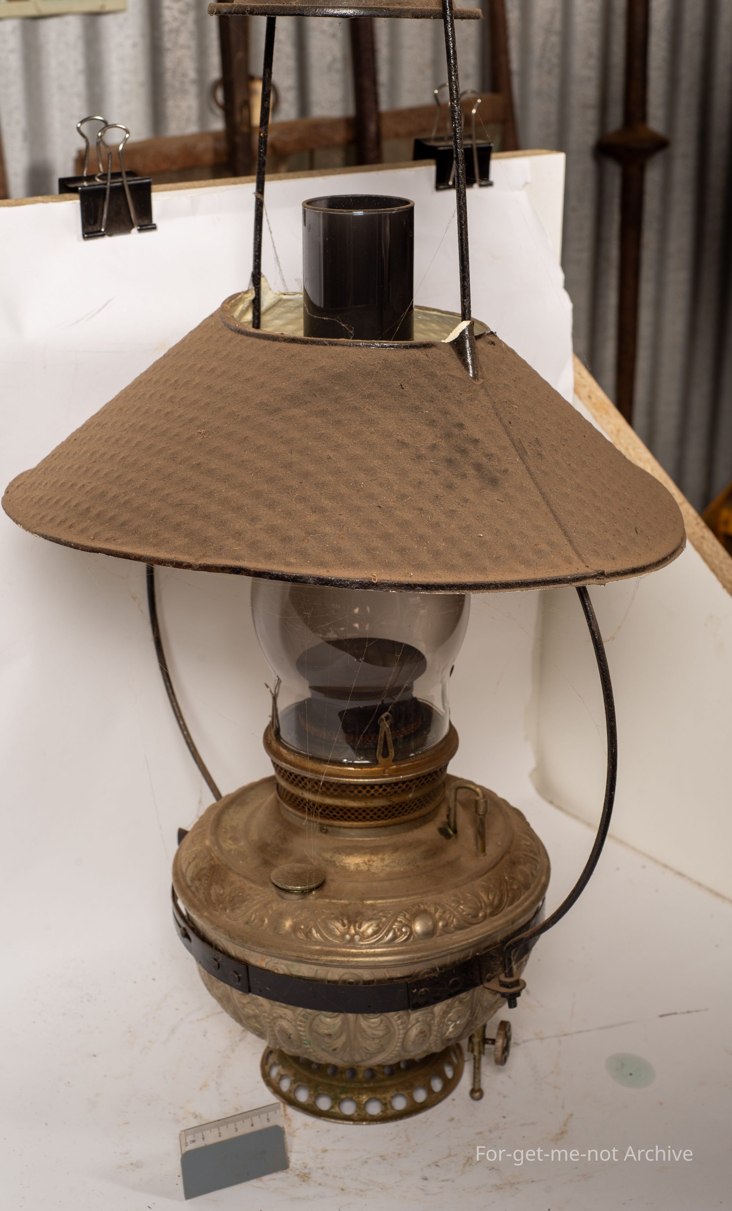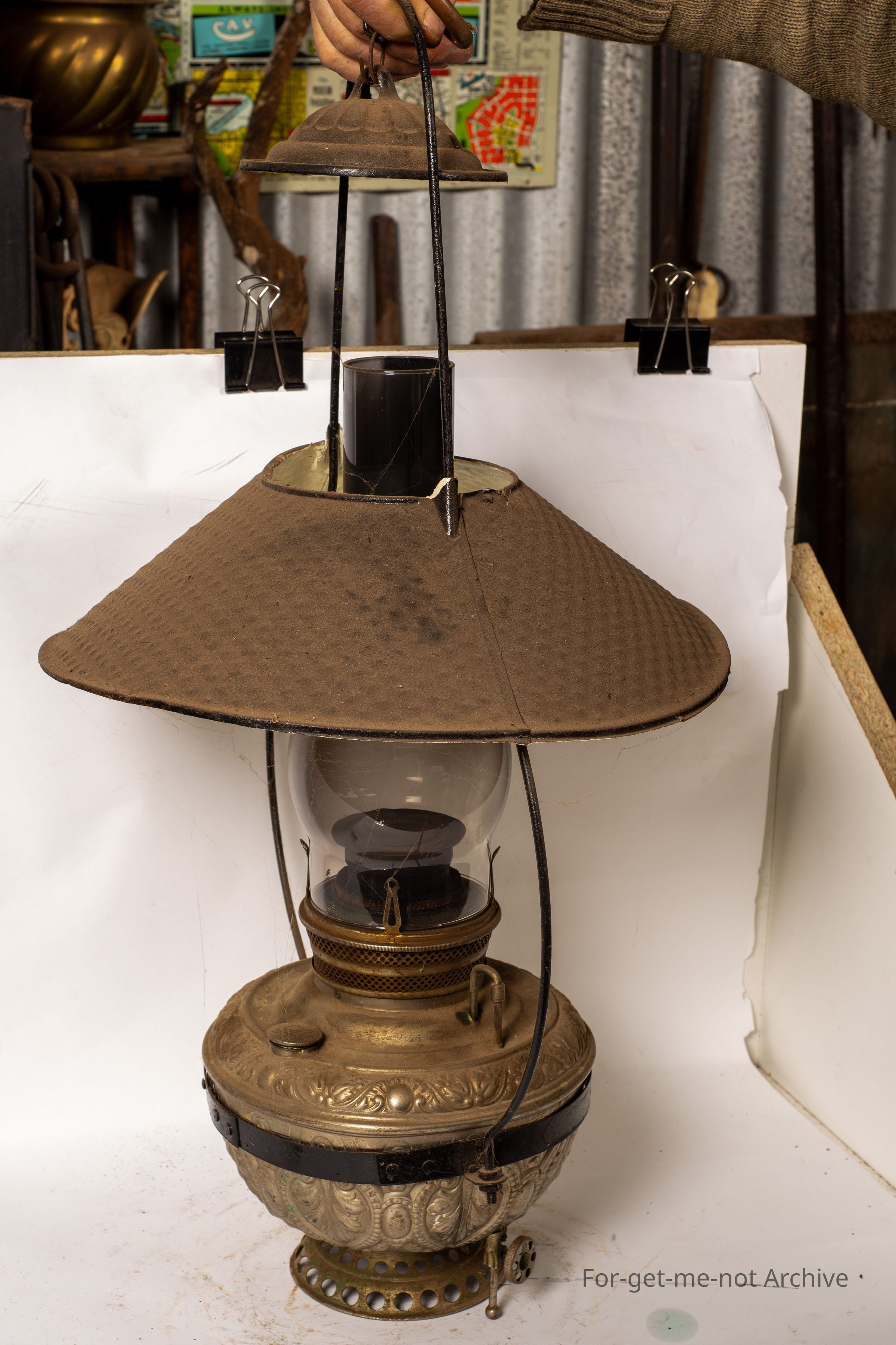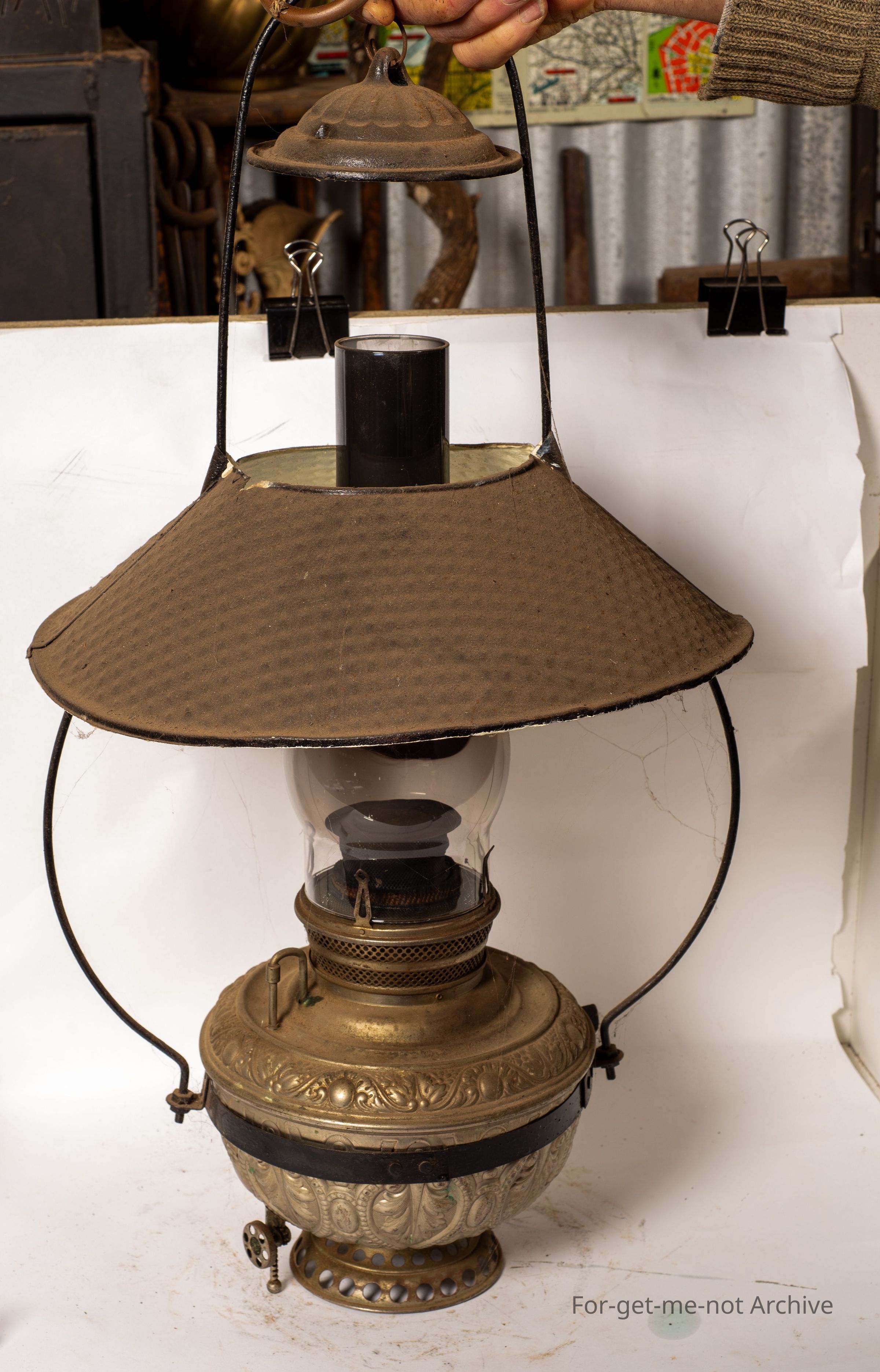 This is the Miller lamp called the Juno, the largest of the Millers. This lamp burns for, 12 hours, at quite high handle candle power. Has a shade. The hanger, so it's definitely hanging, not standing. This lamp, has the proper, chimney.Collection