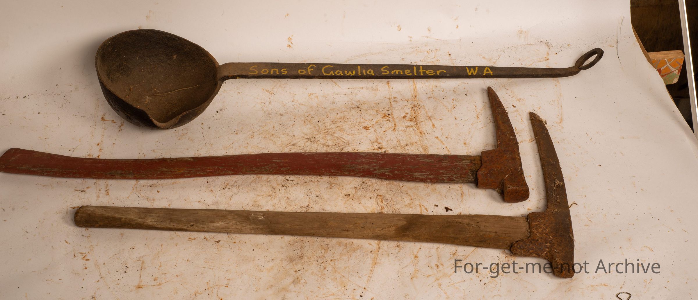 These are 2 miners picks with their wooden handles and a foundry ladle, quite large from Brothers of Gawlia smelter in Western Australia. This the smelter, piece is a lovely piece, from the period before the mine closed and then reopened.Collection