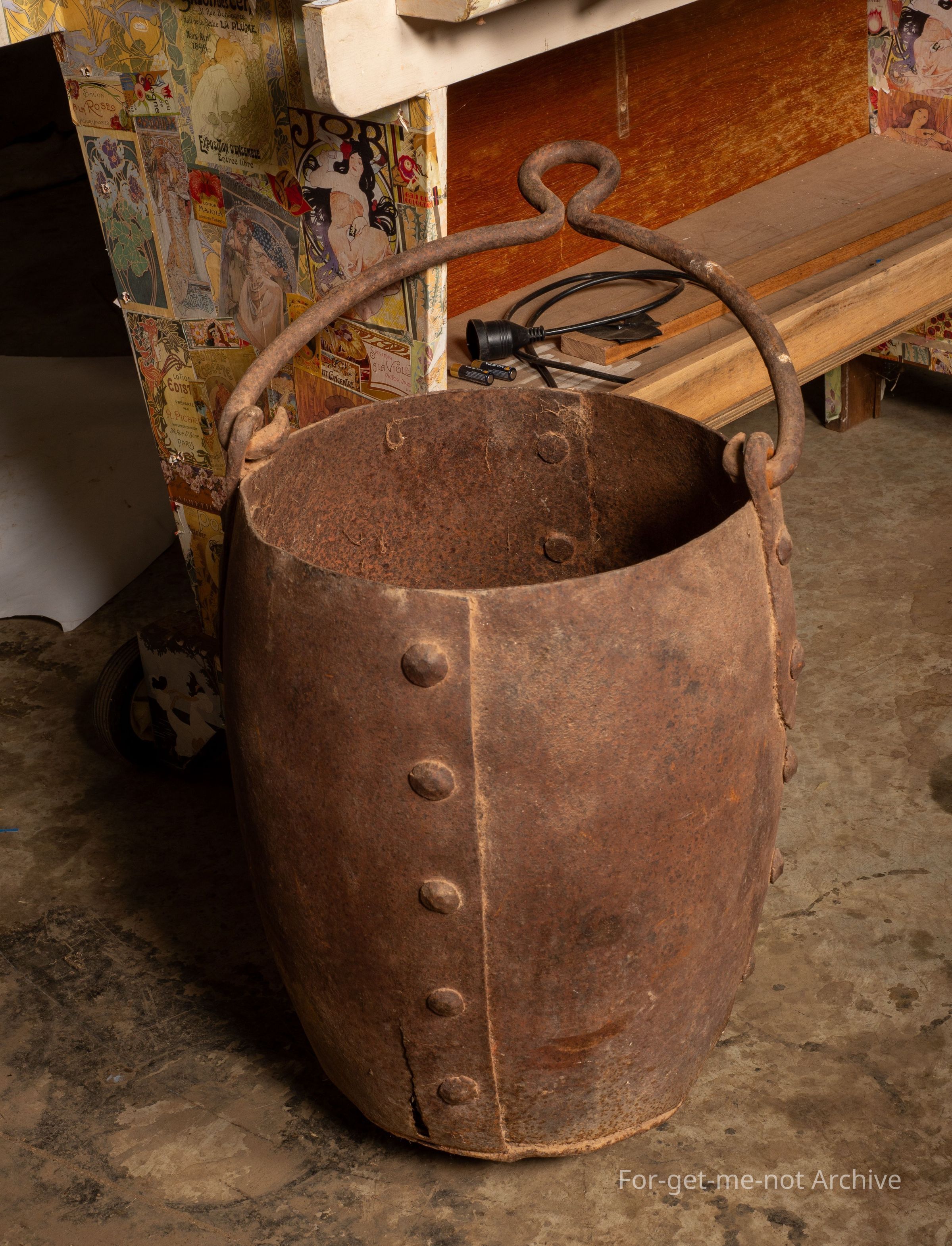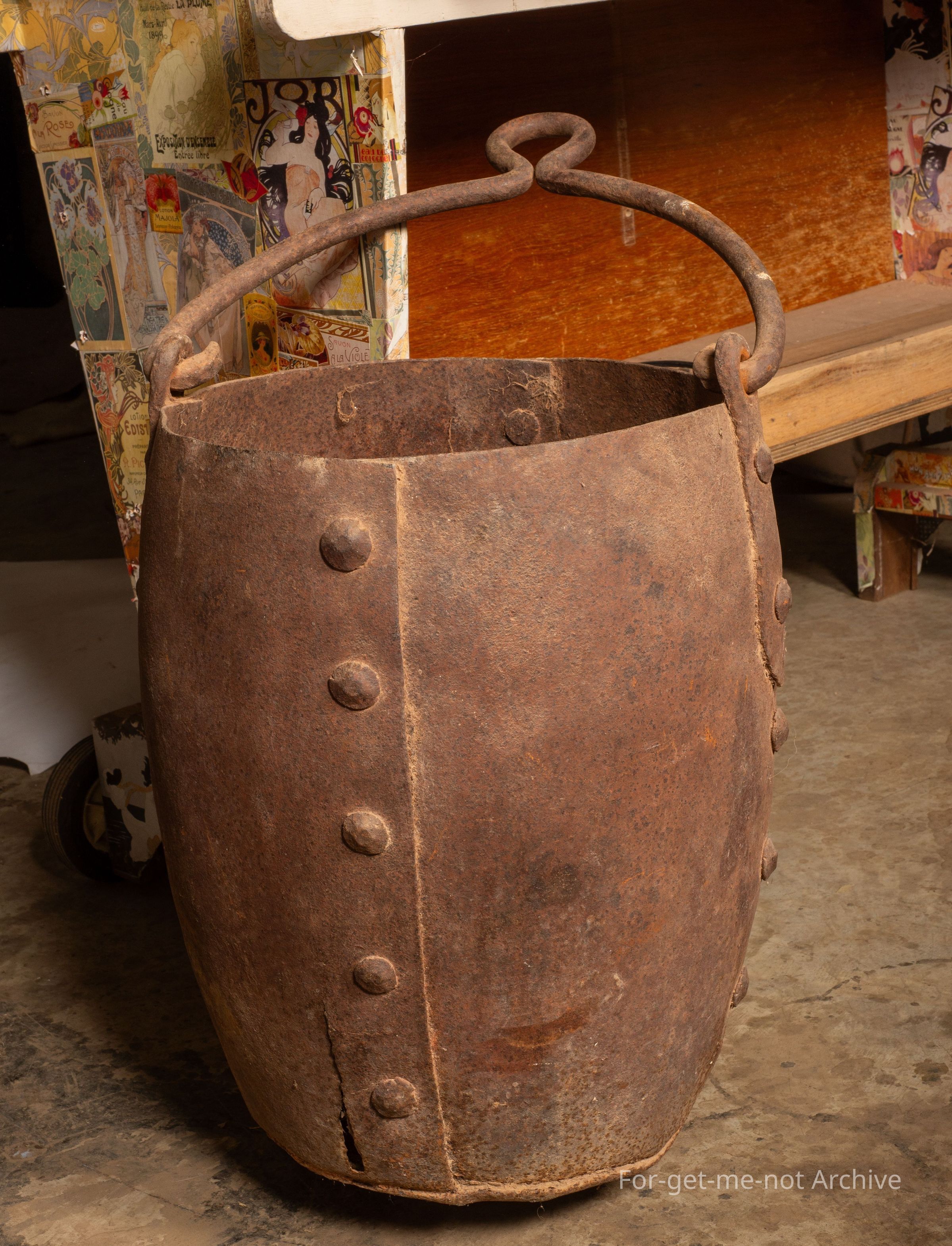 This is a heavy mining bucket, huge rivets, an inch in diameter at the head, a very heavy handle, would have been used with a windlass to lift out of shafting. This bucket was discovered in Northern South Australia. The background is a bit obscure as to where it was used.Collection