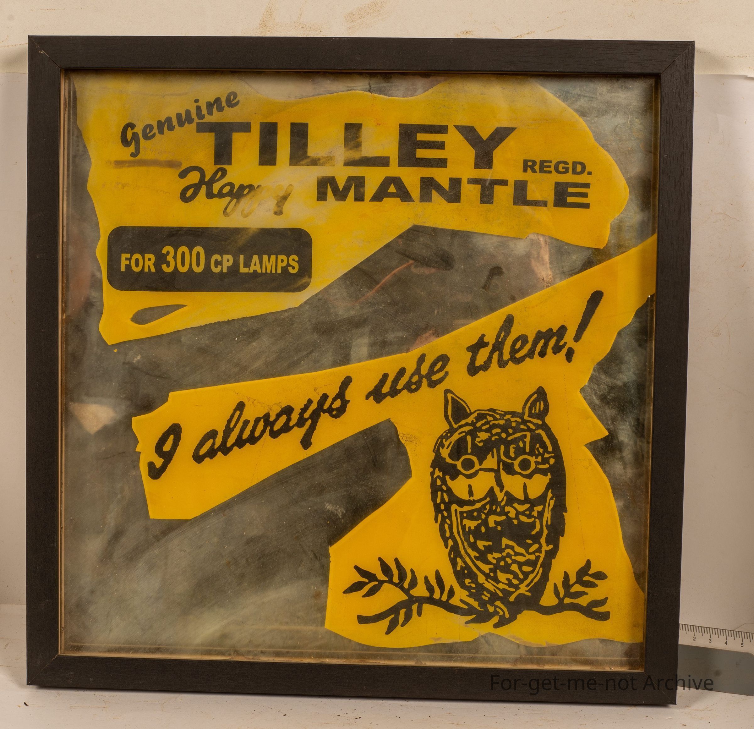 Sangeet Collection. This is a framed glass, mirrored piece advertising " Tilley Happy Mantle. Always use them". Image of an owl, I'm quite good nick.