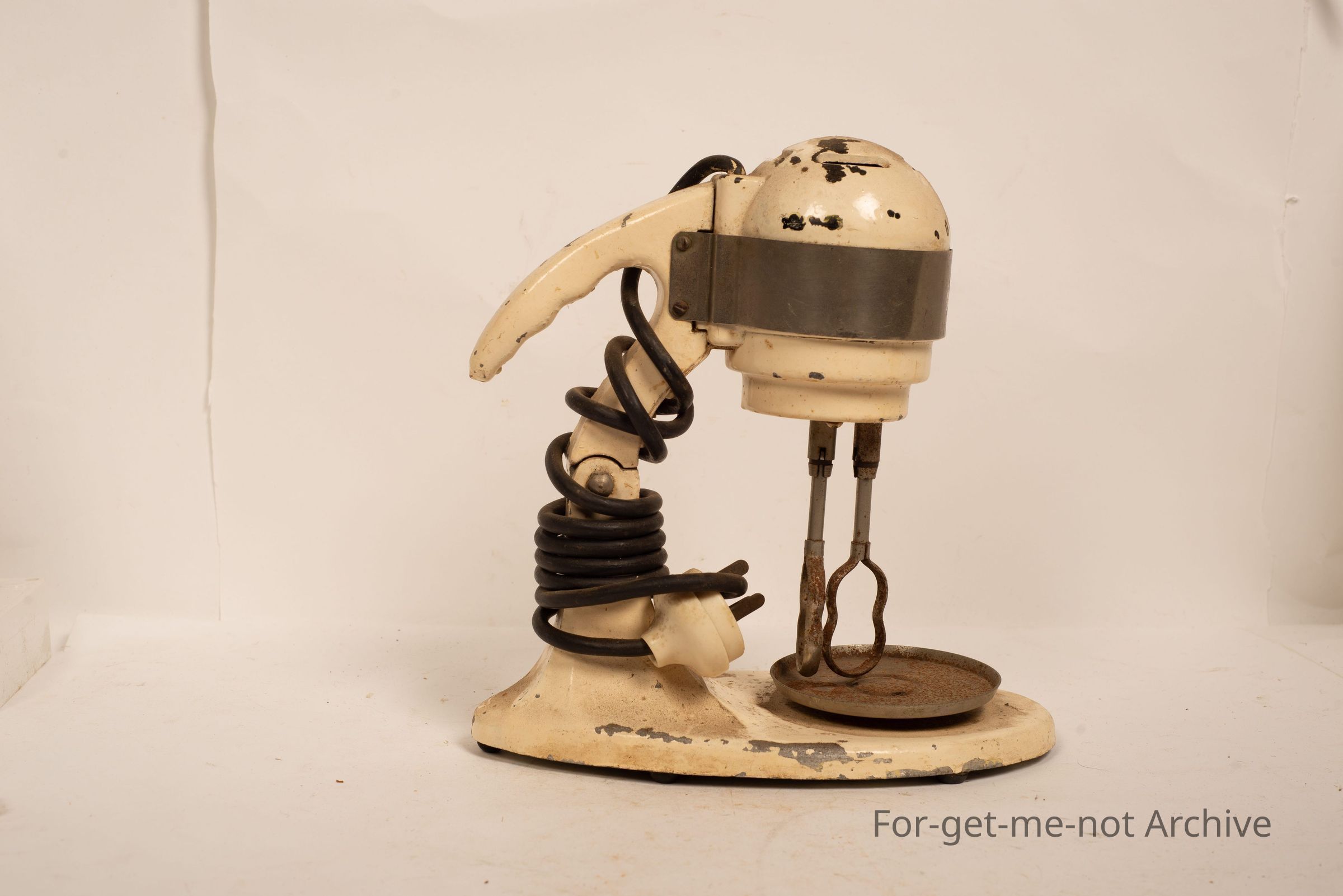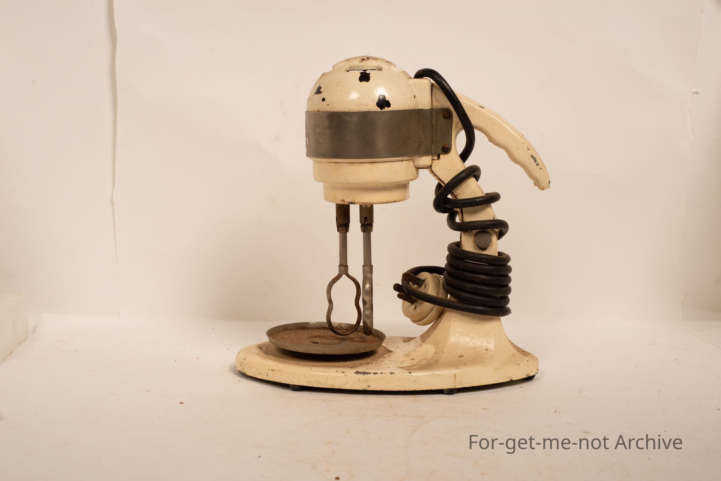 Is a very small compact electric mix master. The name is missing, possibly 19 fifties.