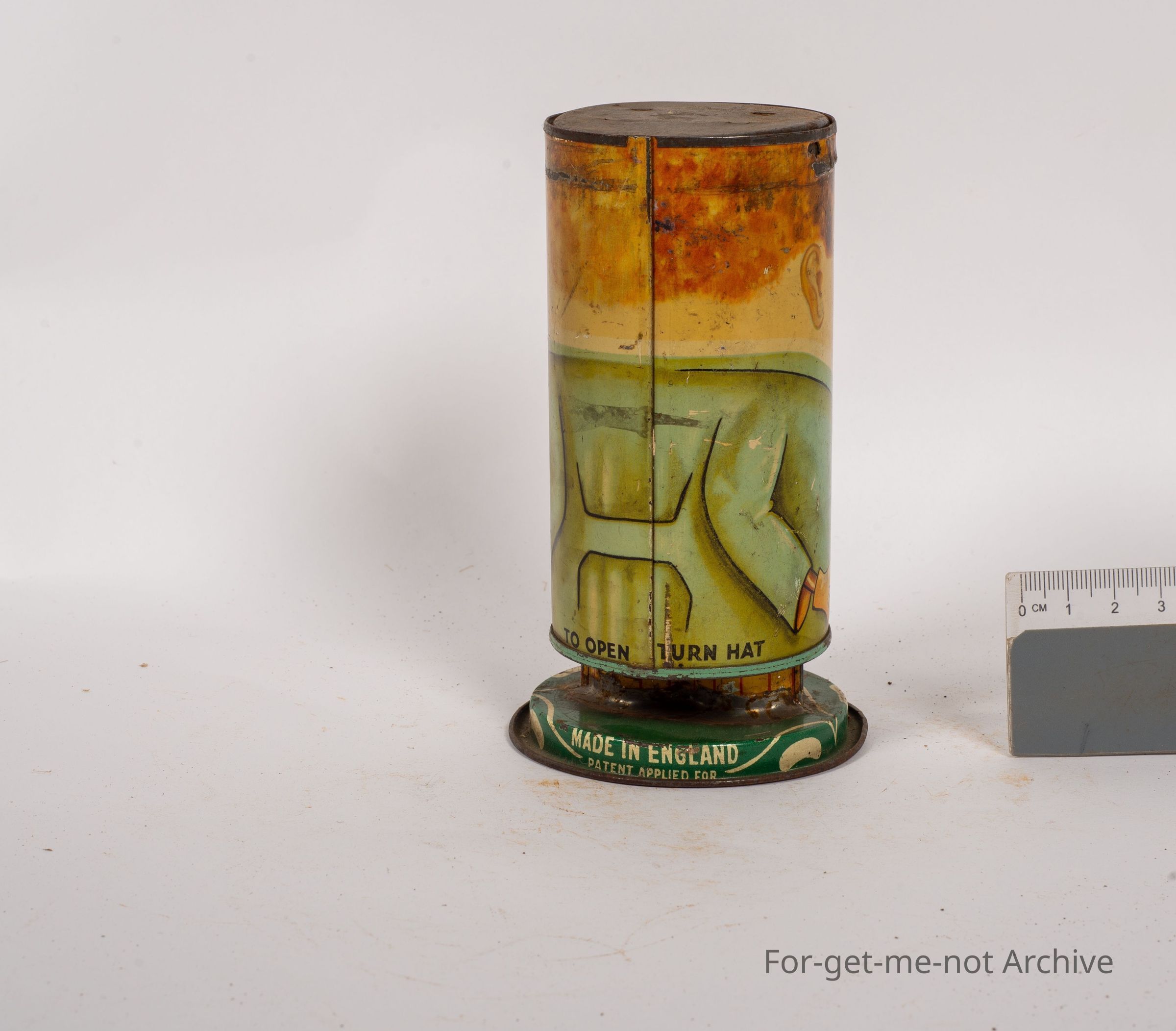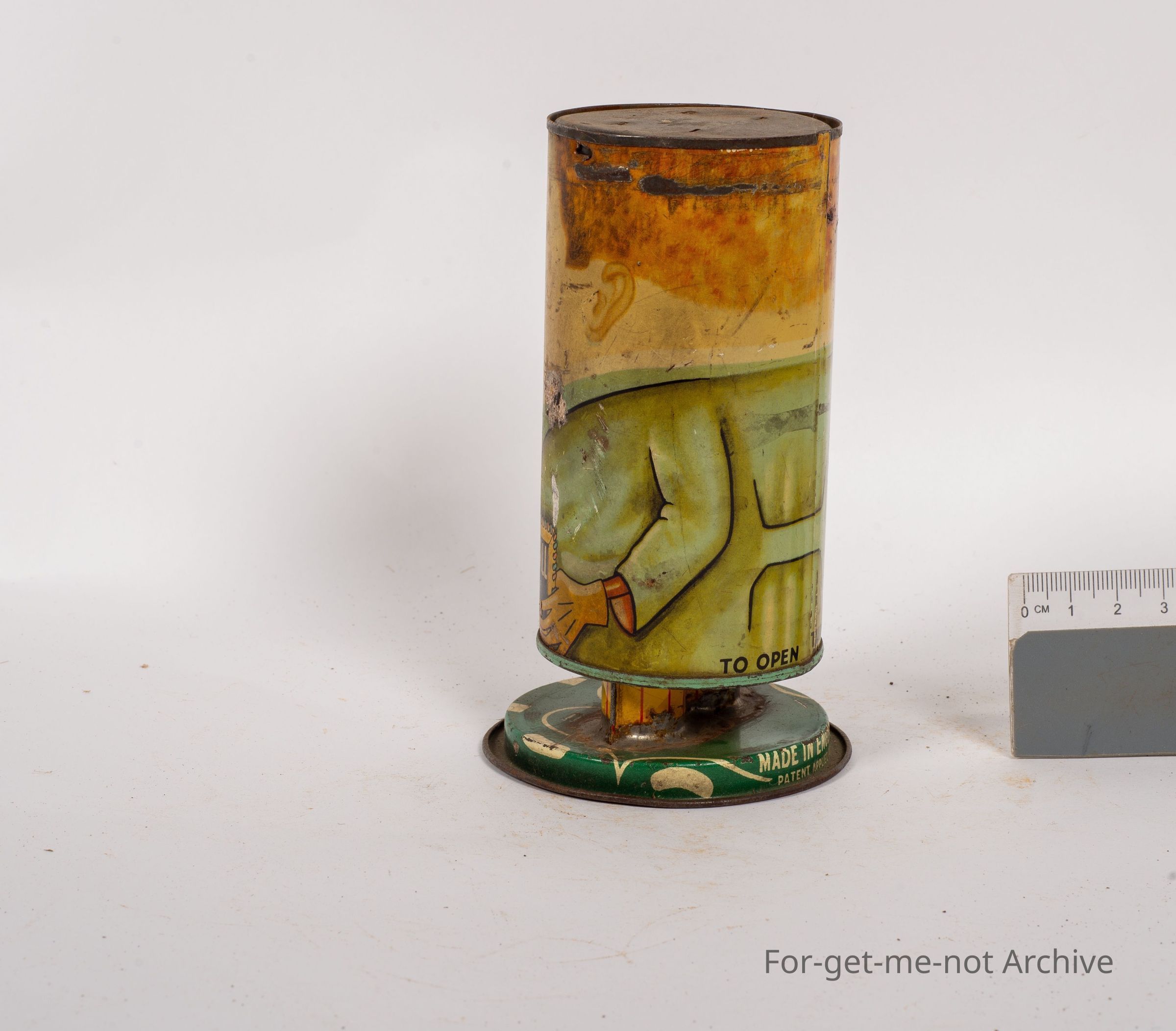 This would have been a collectible money box. This is, a sliding tin with the image of a man on the front with holding a sign. Watch me grow tall with coins large and small. This is quite a rare tin. Unfortunately, missing his hat. Because of that, it's very down in price,Collection