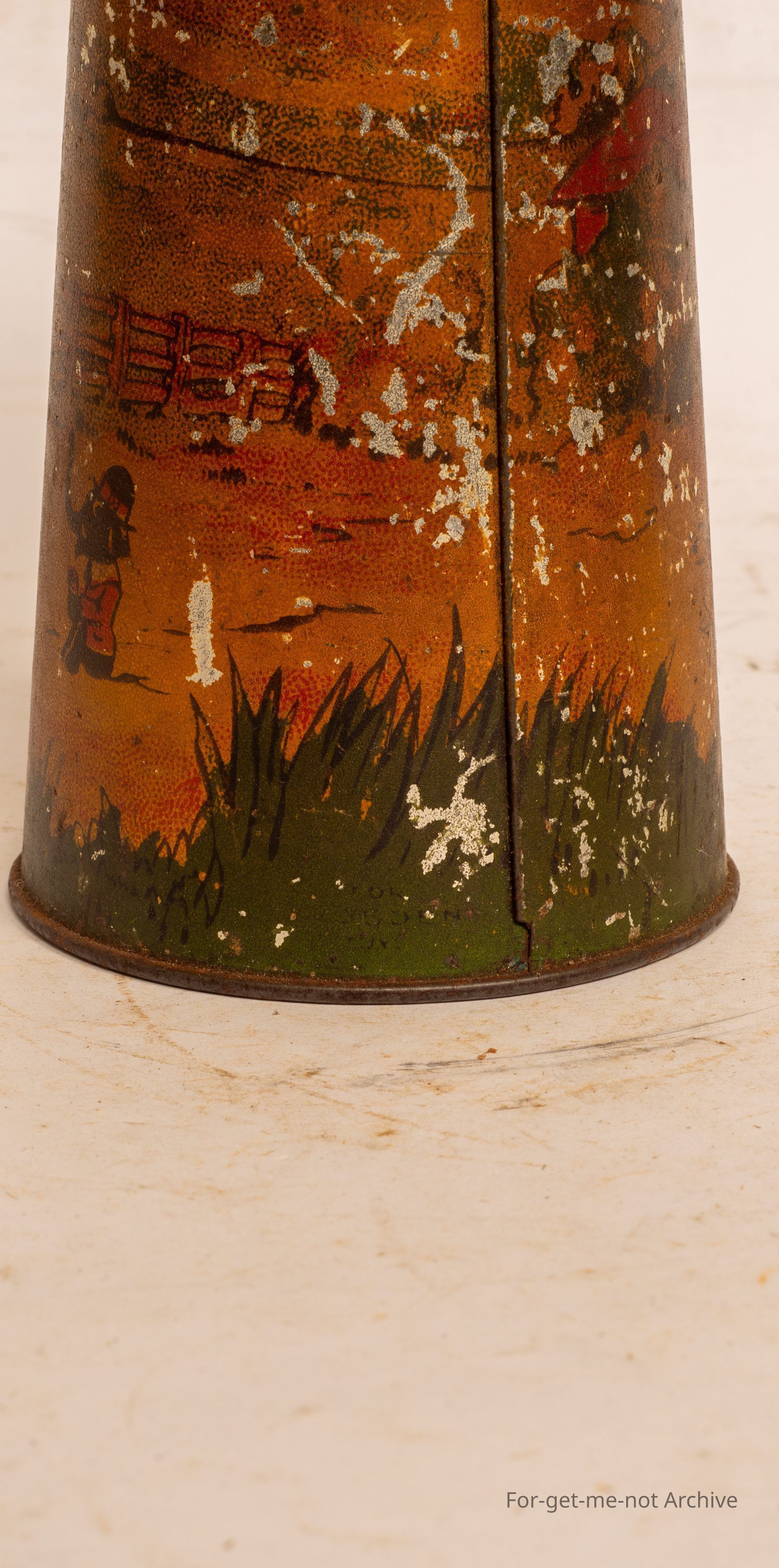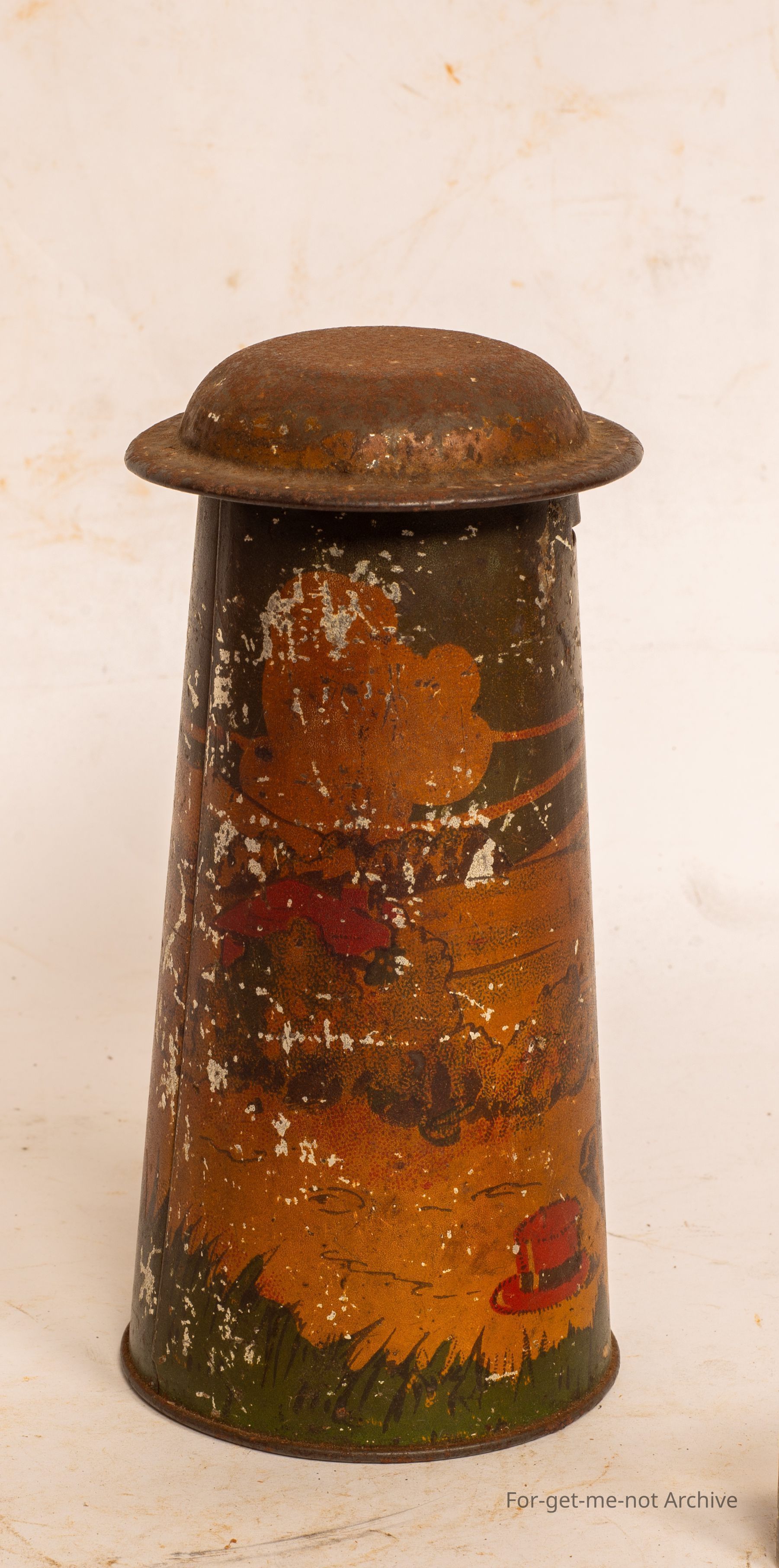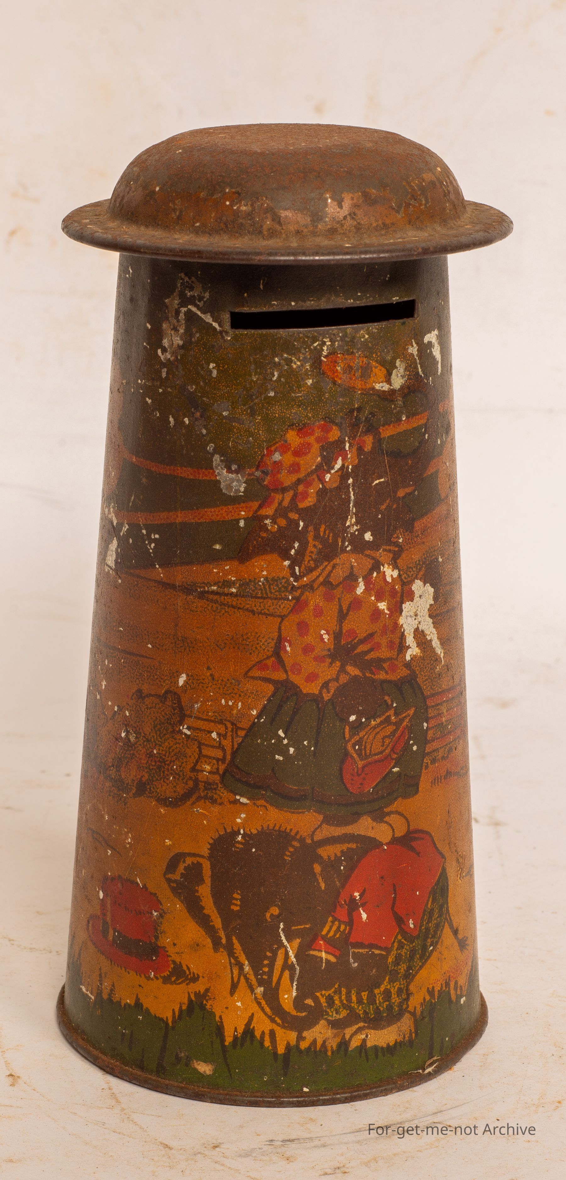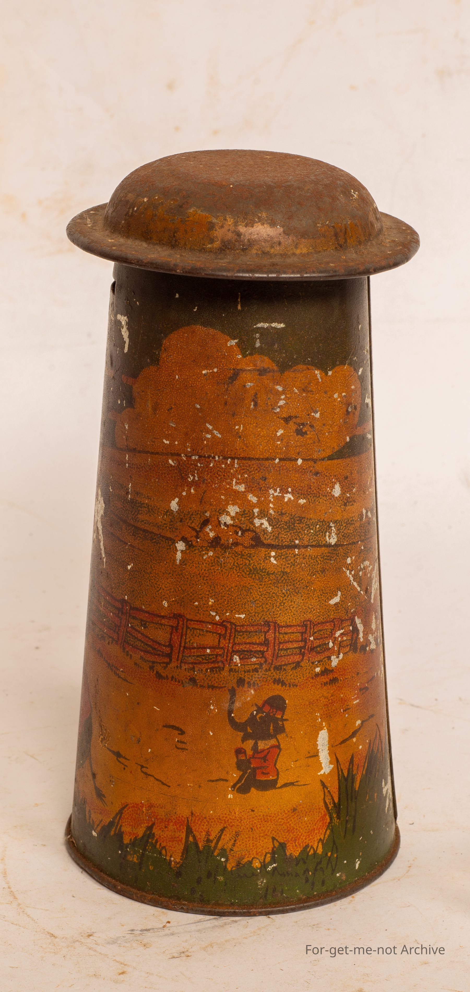 This is a very early, money box in a tapered circular fashion with a lid. Very early scenes around the outside, not in brilliant condition, but made by Gadsden Melbourne. This is a very collectible tint if it was in better order.Collection