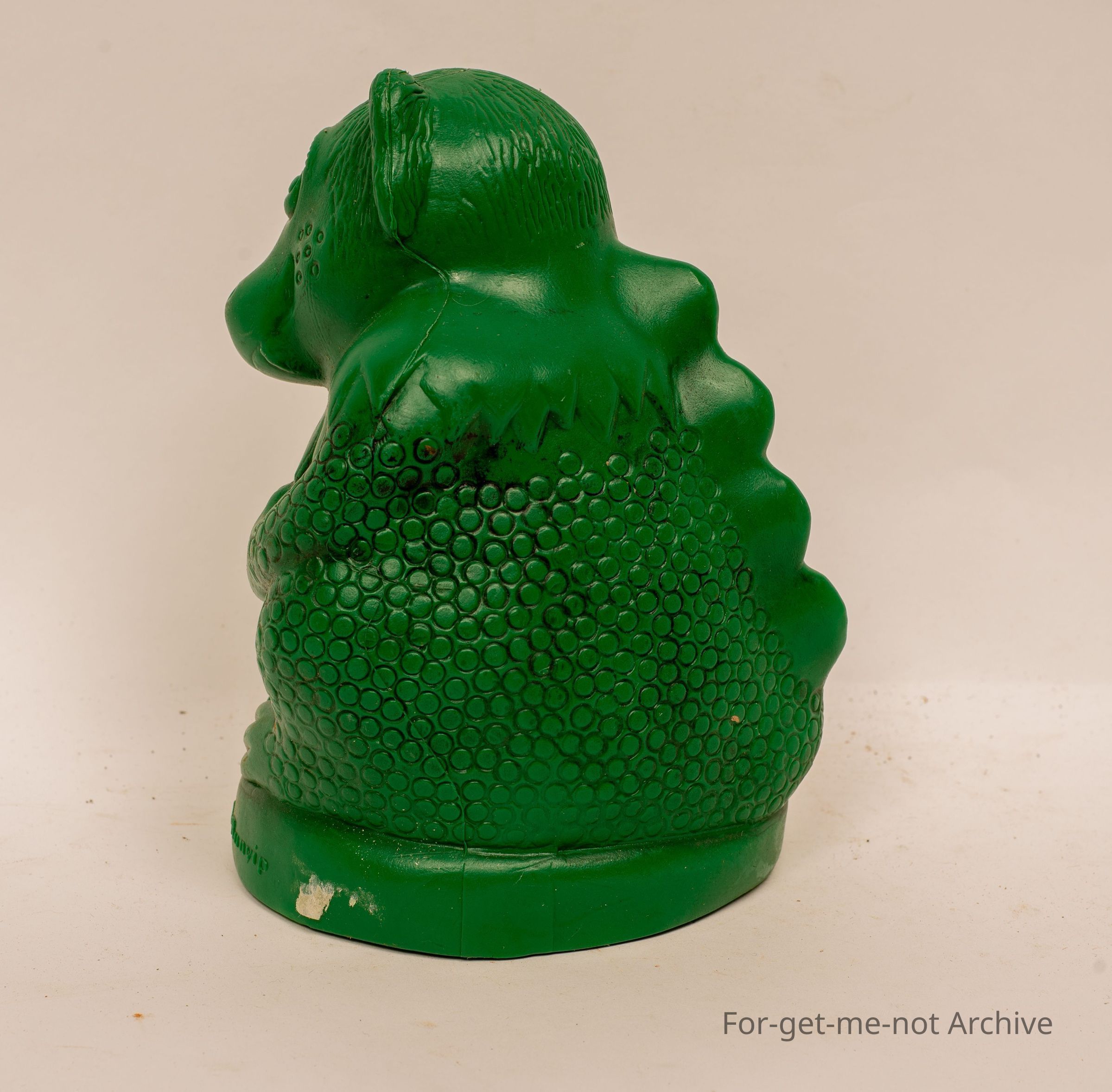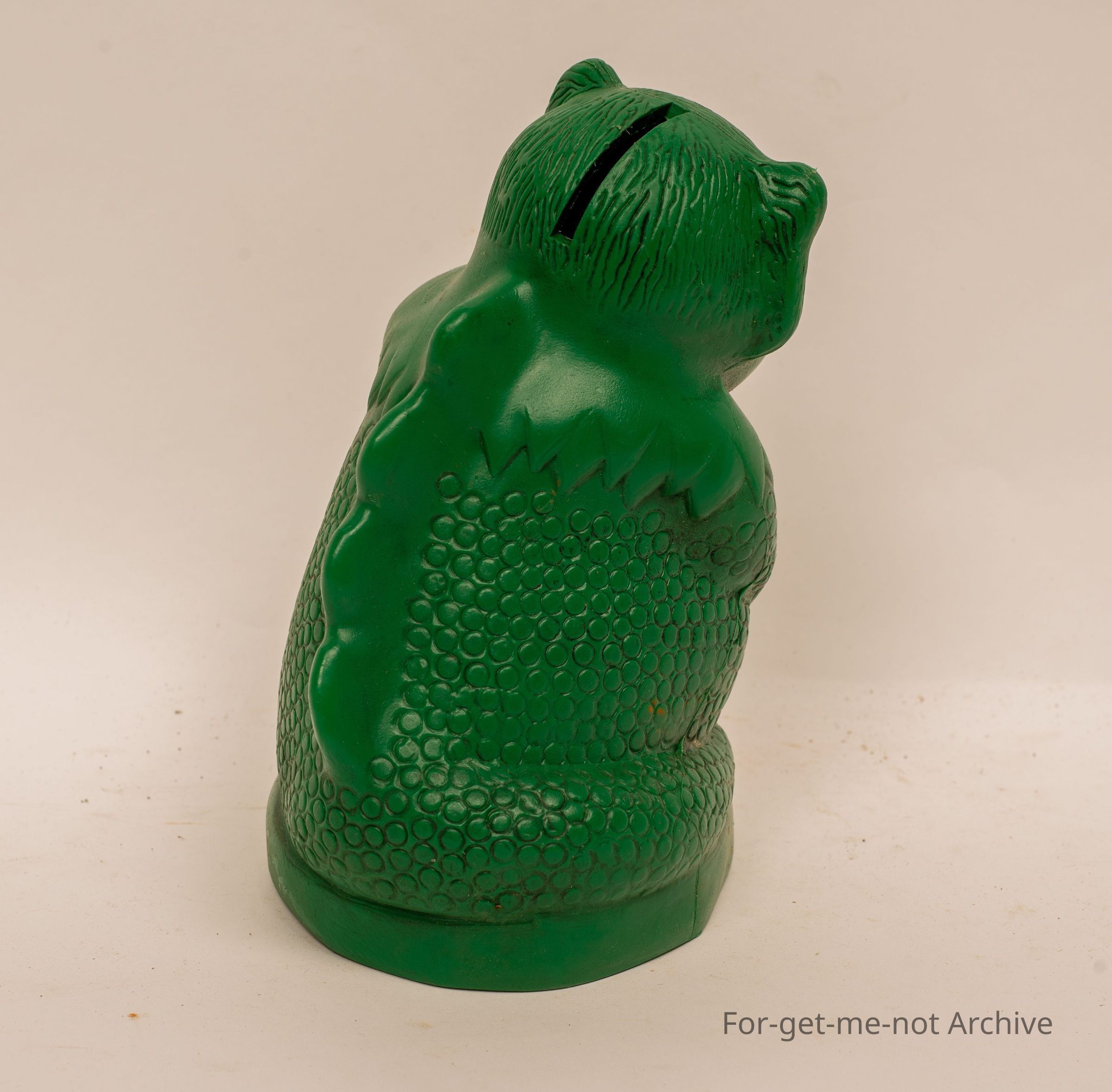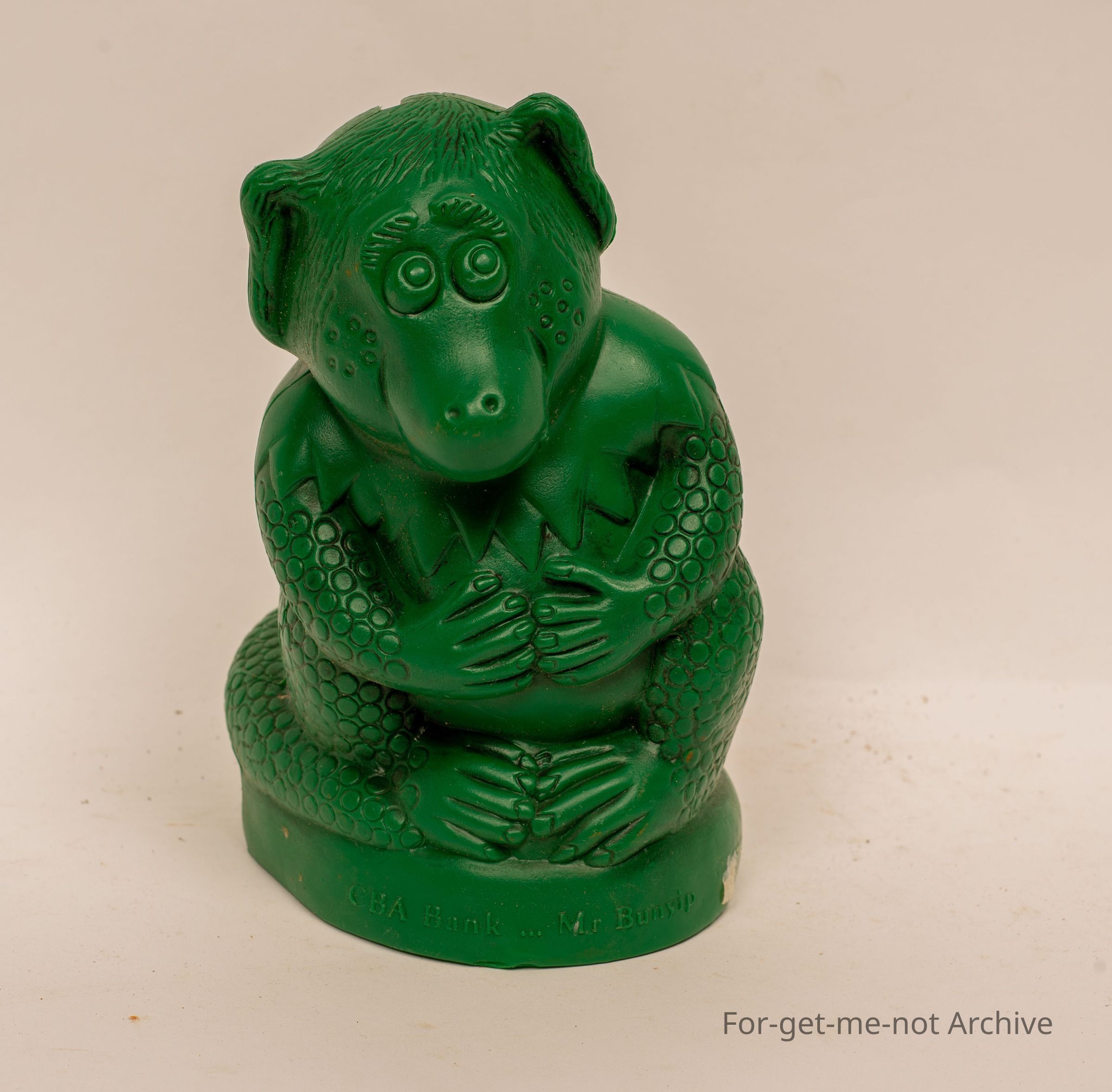 Green plastic figure of Mr Bunyip, CBA Bank money box.