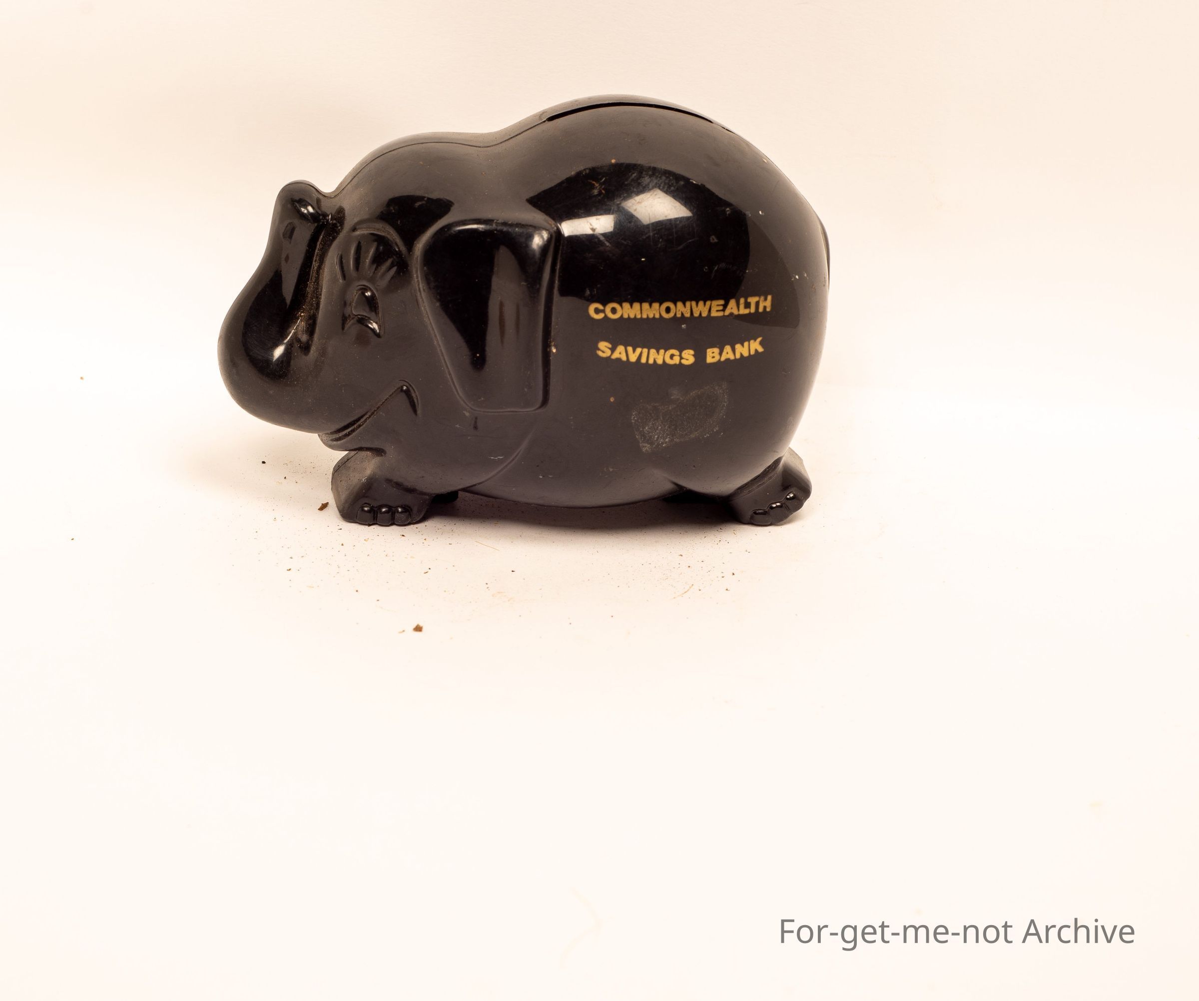 A plastic elephant, which is a money box for Commonwealth Savings Bank.