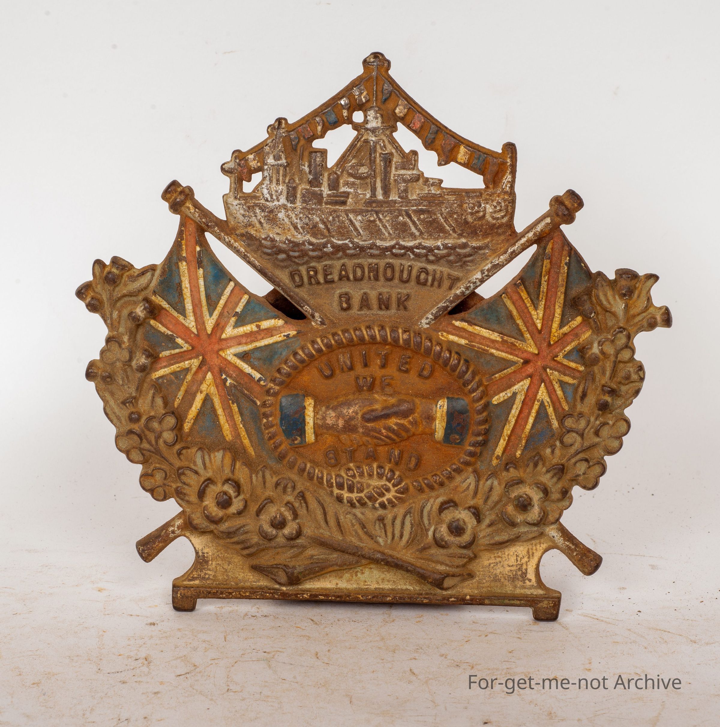 This is rather an ornate casting in the form of a money box featuring the Dreadnought Bank, United We Stand.