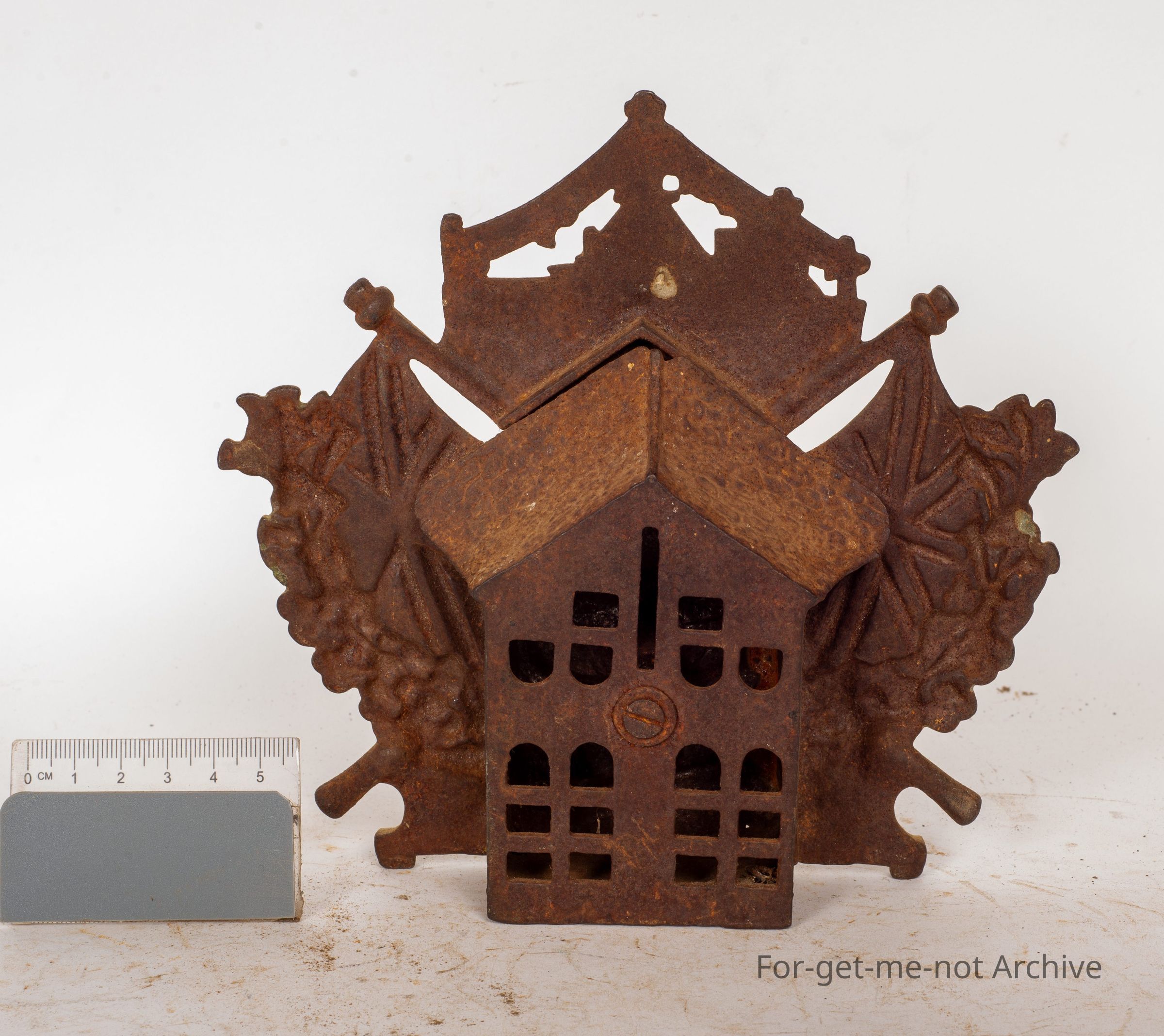 British flag either side, clasped hands in the middle of a circular rope with floral decorating around the outside. The money boxes in the back, with the slot. In very good order, this is one of the rarer money boxesCollection