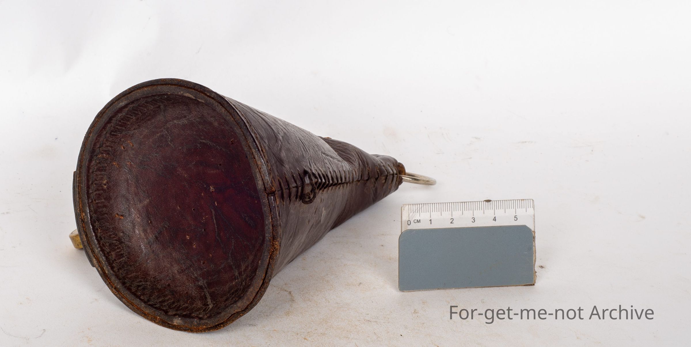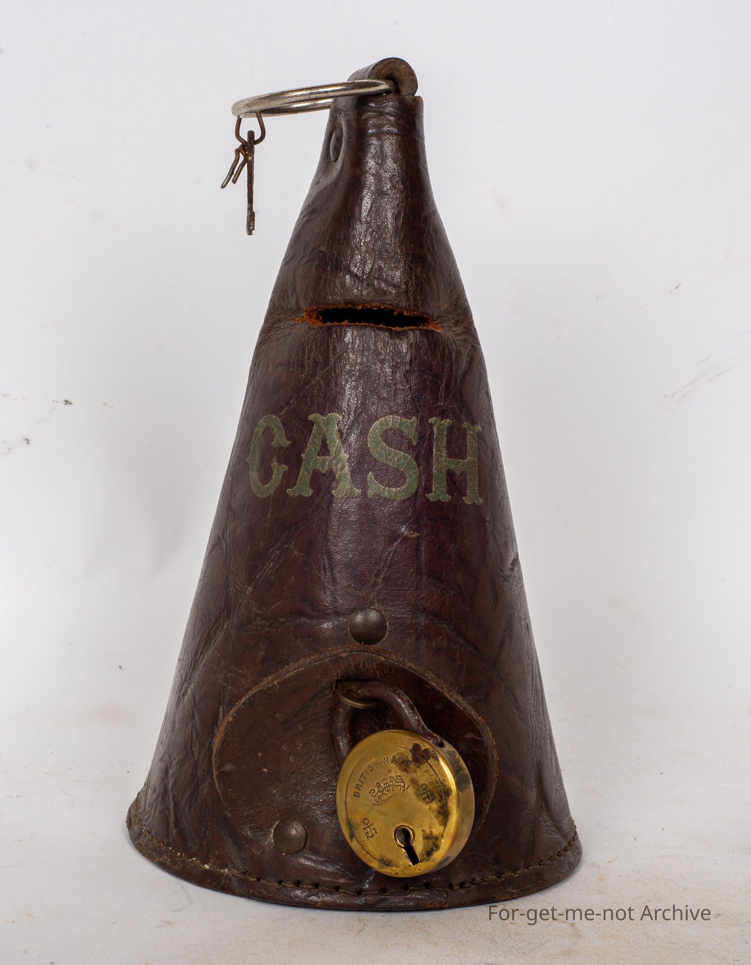 This is a leather cone. Hole in the top. The, text on the side says cash. The little bottom flap has a, a lock on it. These were used for fundraising efforts, all run through service stations many years ago. This would be one of a very few survivors from that era, time. The little brass lock even has its key, because of the rarity of itCollection