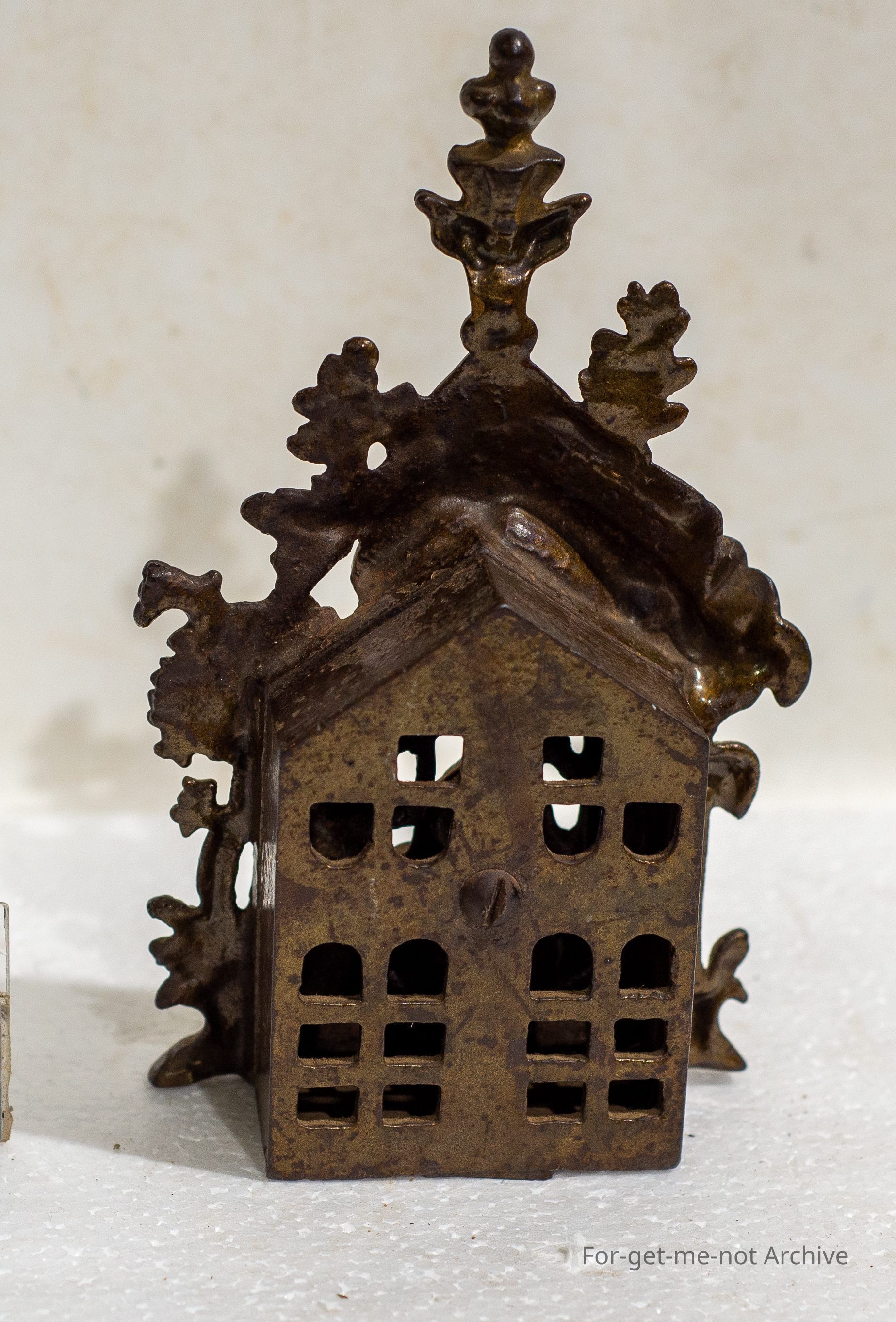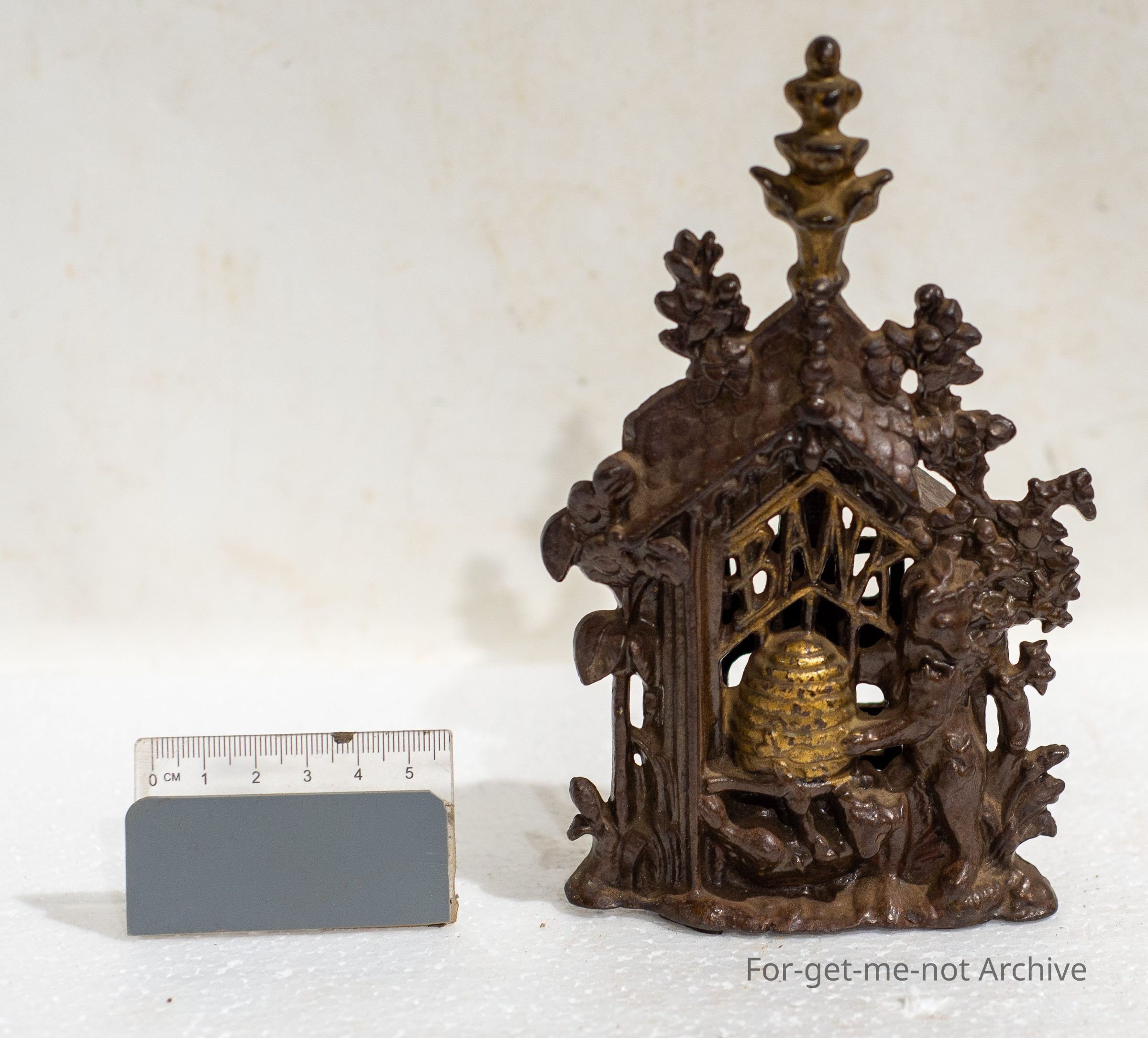 Early cast iron bank featuring two bears raiding a honey pot in the woods, AESOP fable, excellent order and patina, registered design no.s