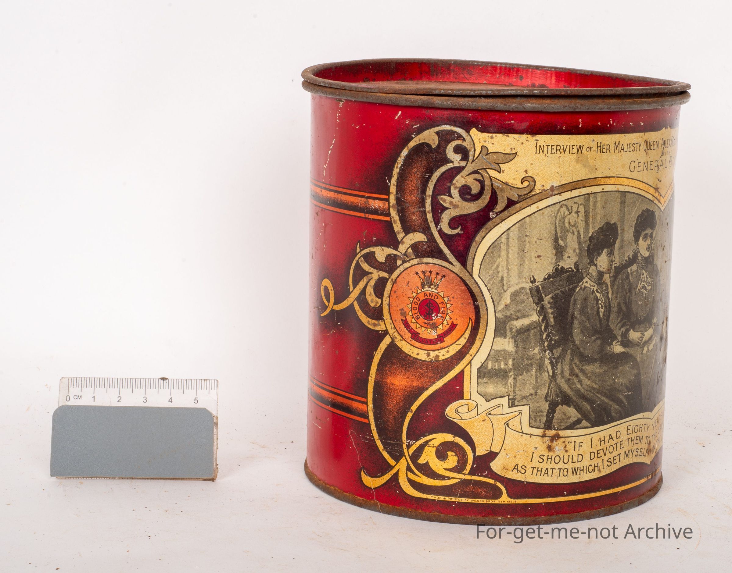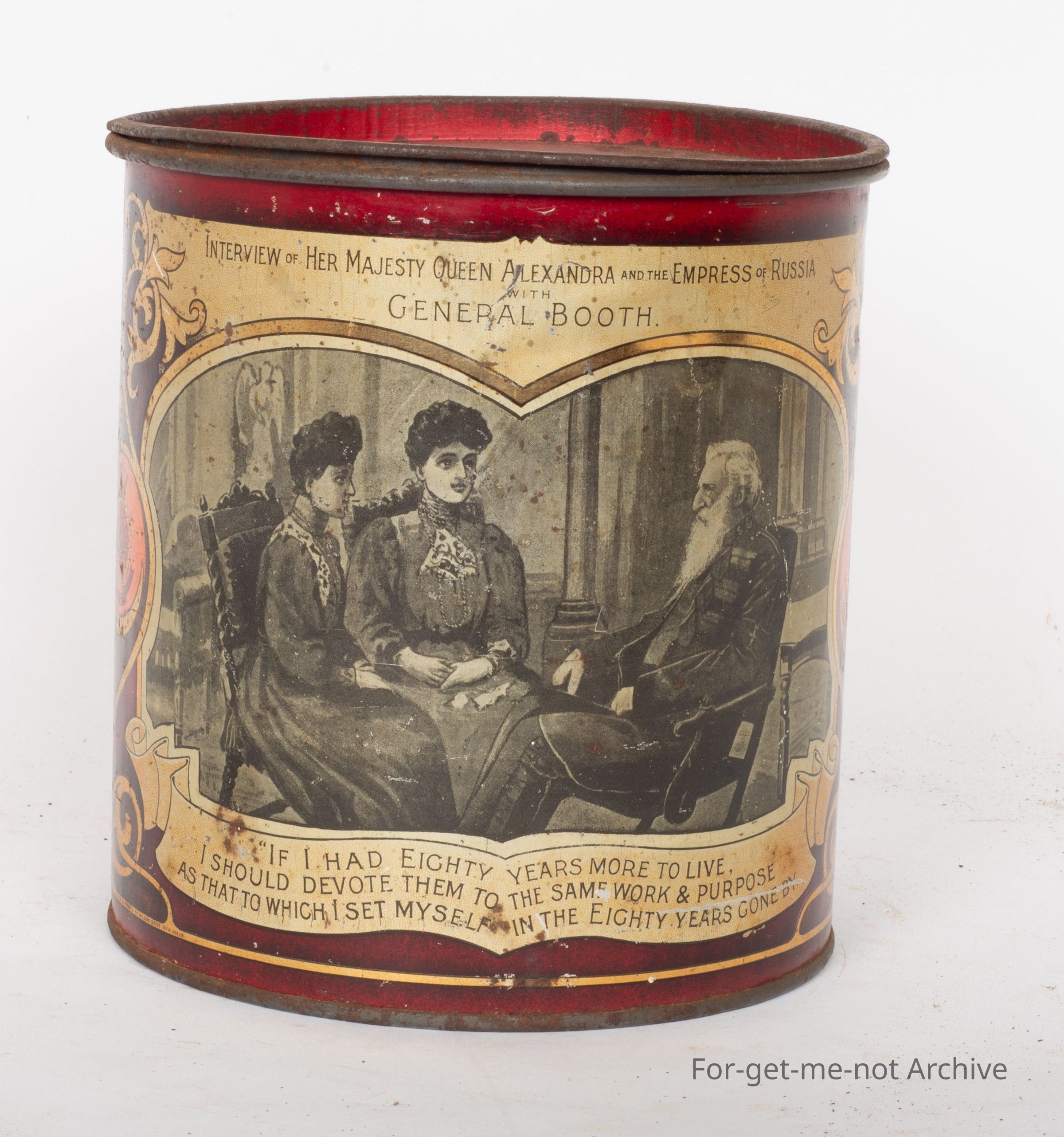 This tin is, to commemorate the visit to Russia by General Booth with the idea of setting up the equivalent of the Salvation Army in Russia. The, diagram on the front is smooth talking to Her Majesty, Queen Alexander, Alexandra and the Empress of Russia.