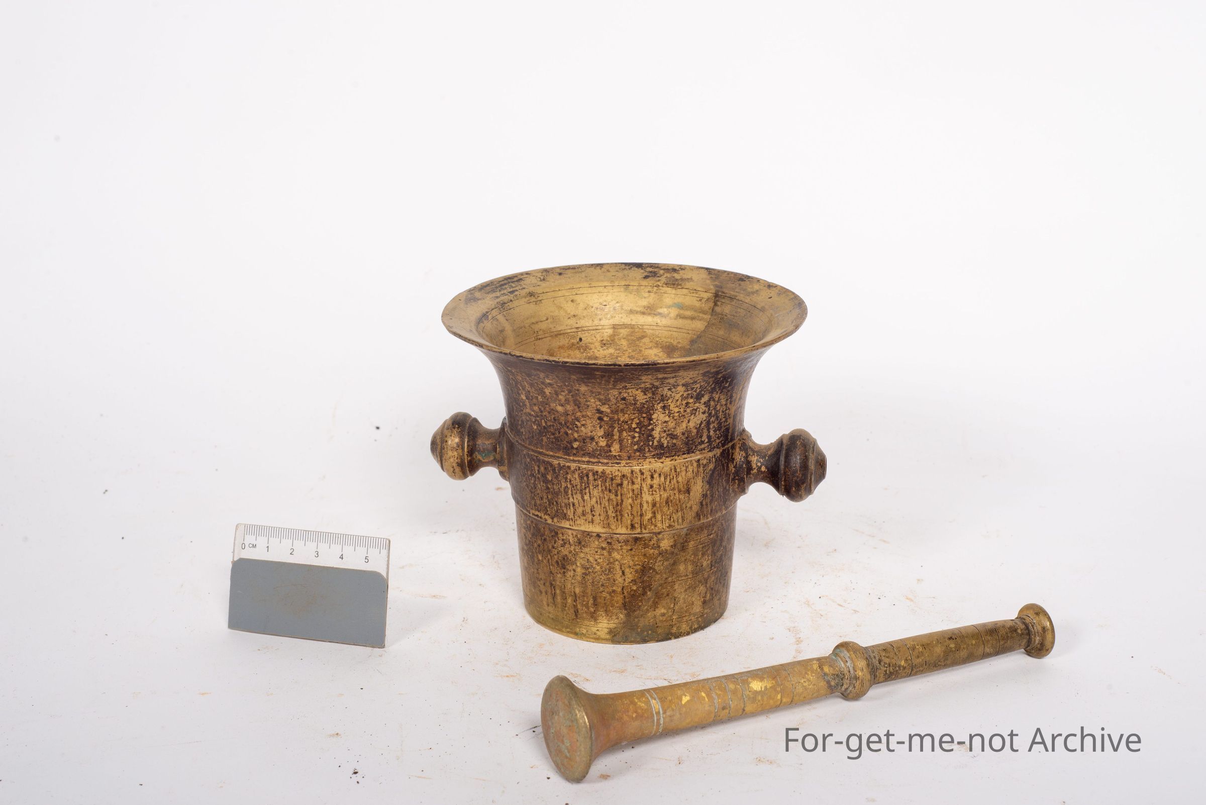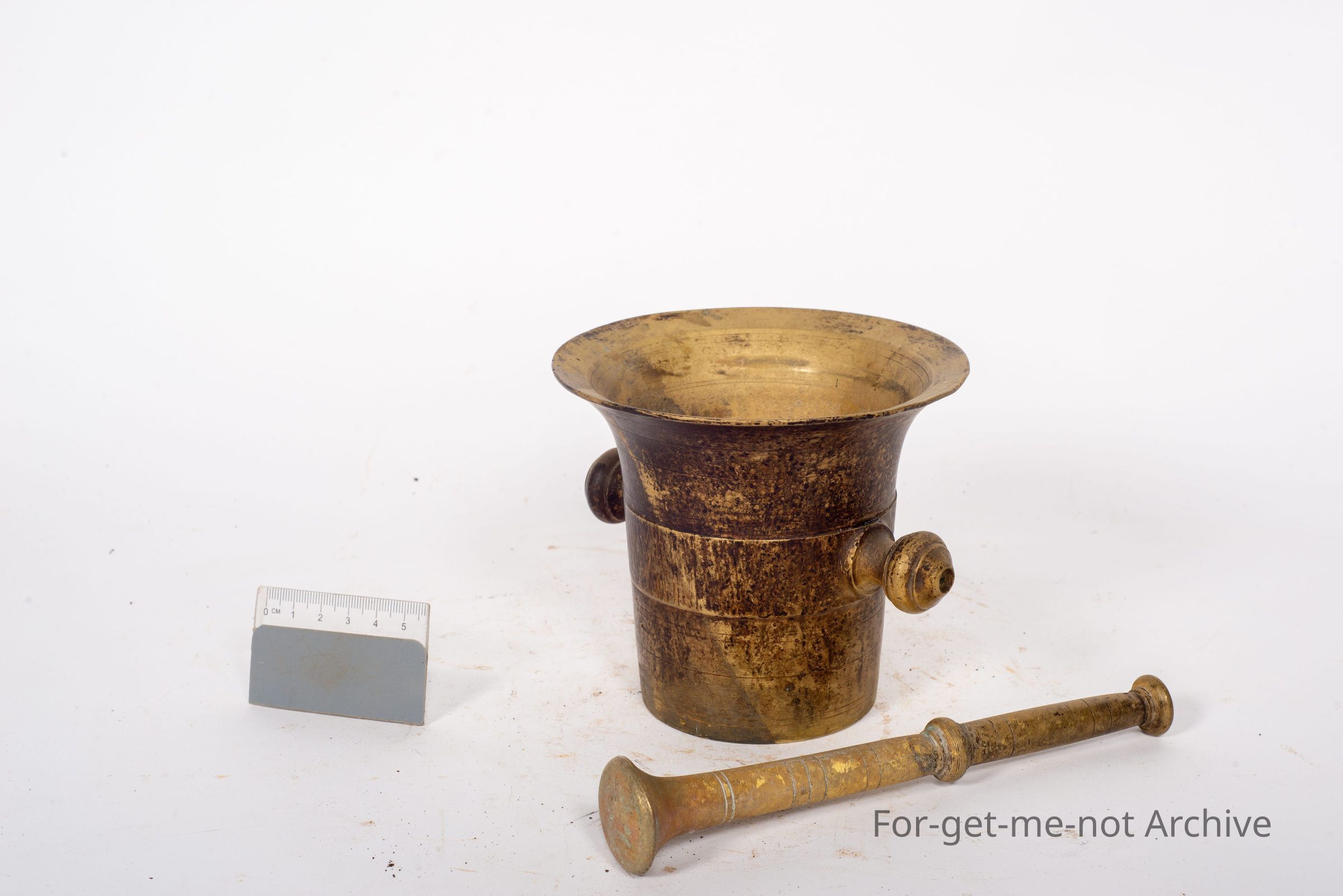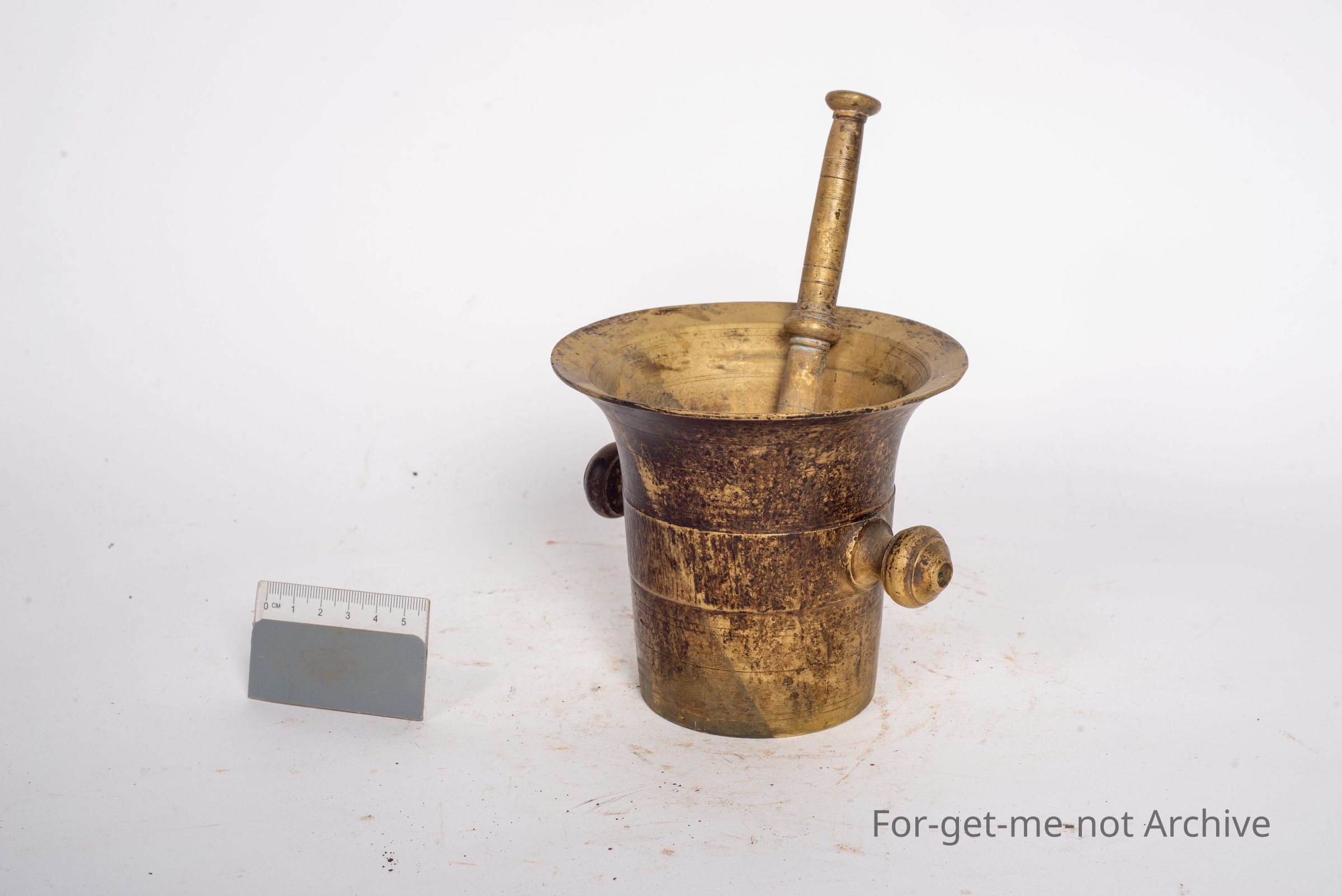 This is a cast brass mortar and pestle. This is a very attractive one with outside, knobs for lifting. Obviously, with a lot of age and, possibly a wonderful story.