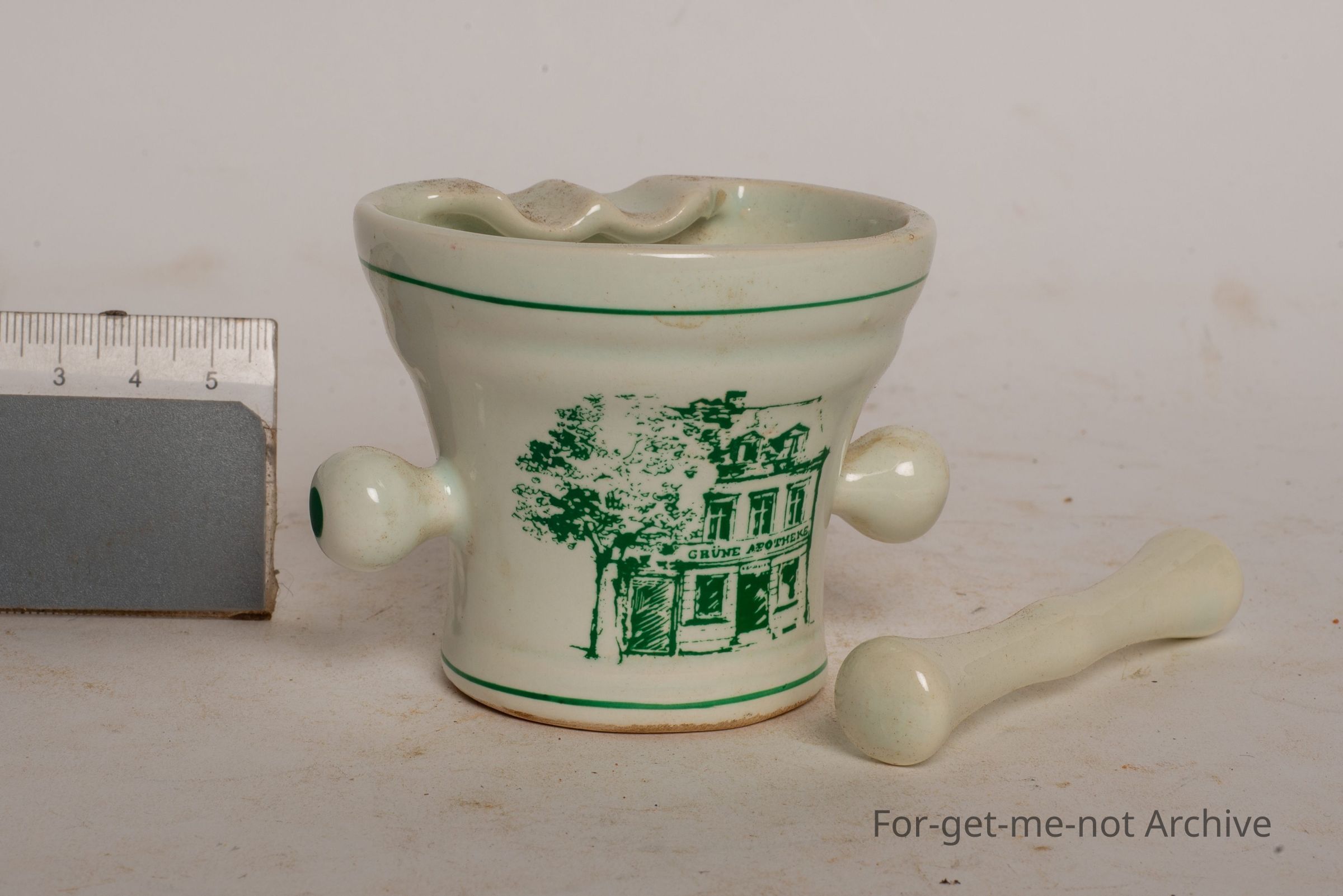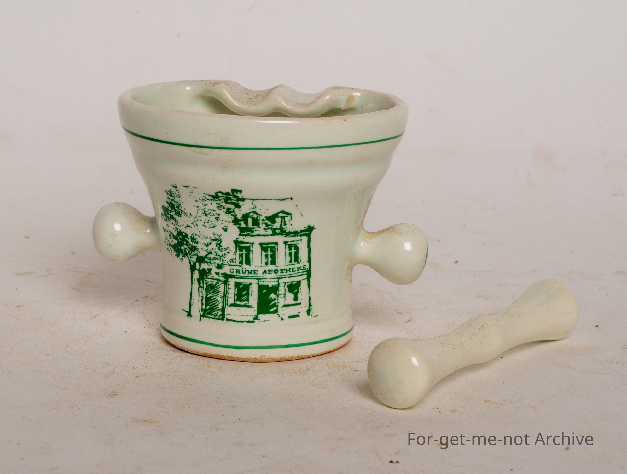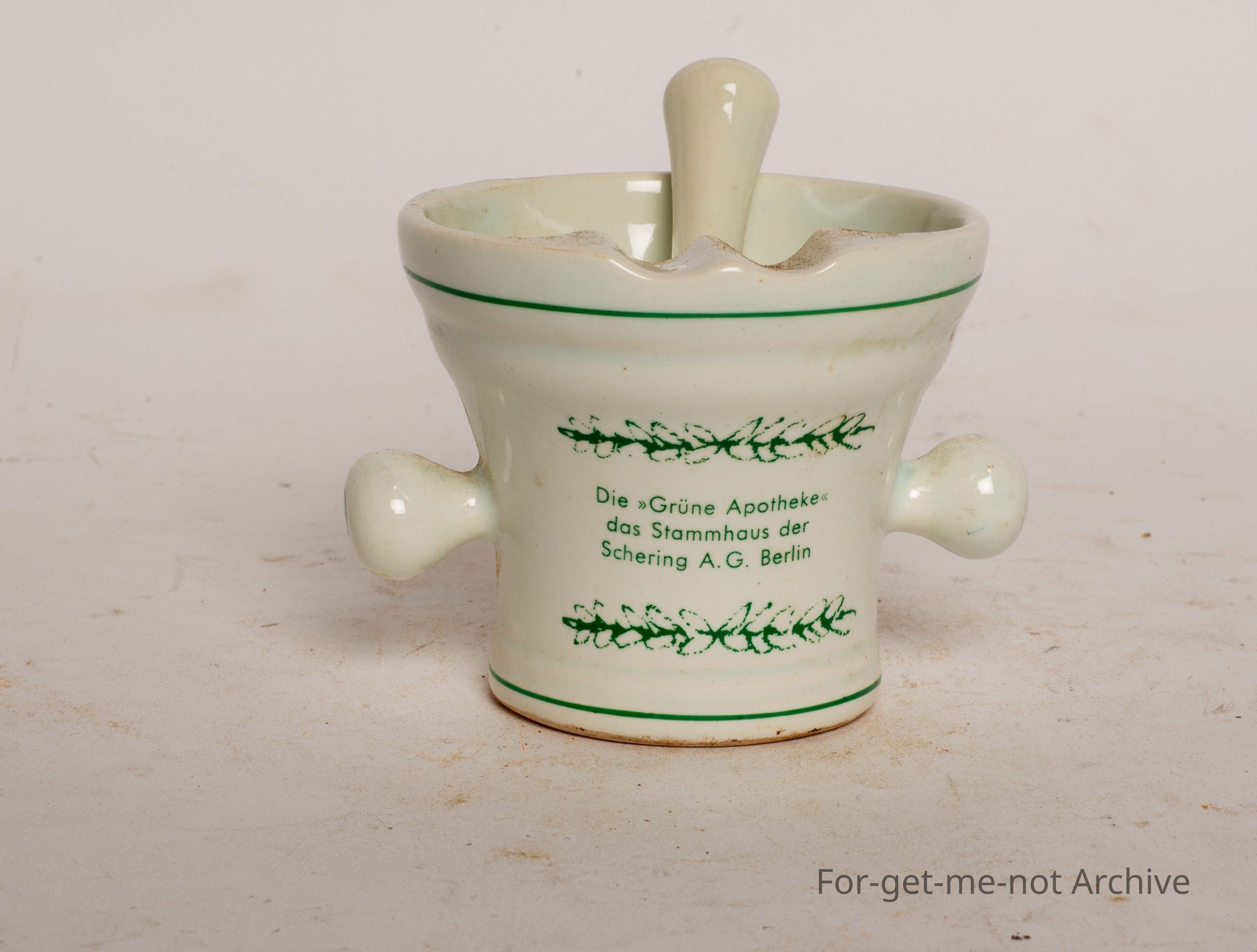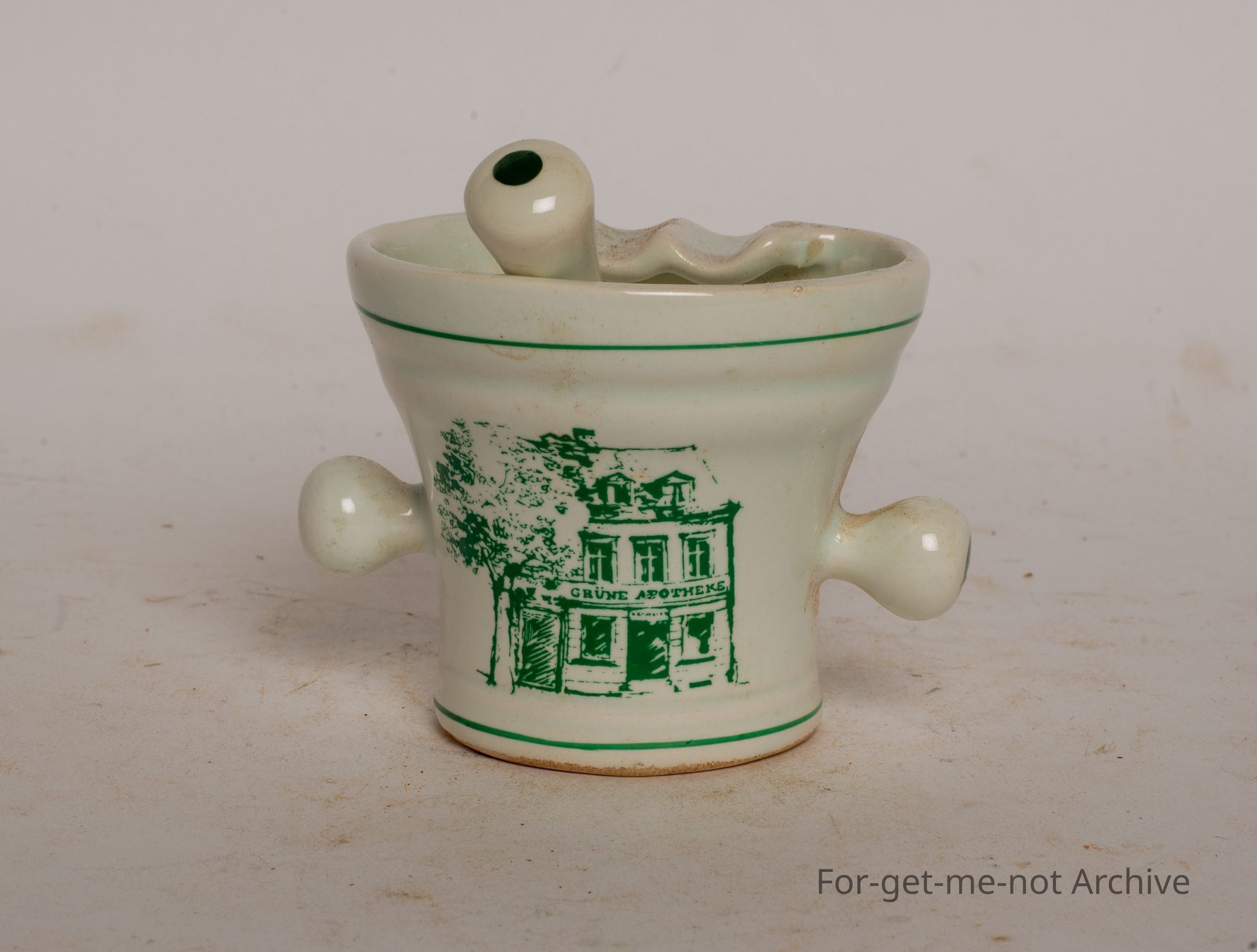This is an advertising piece, from a chemistry based shop. 2 little knobby pieces on the side with the pestle.