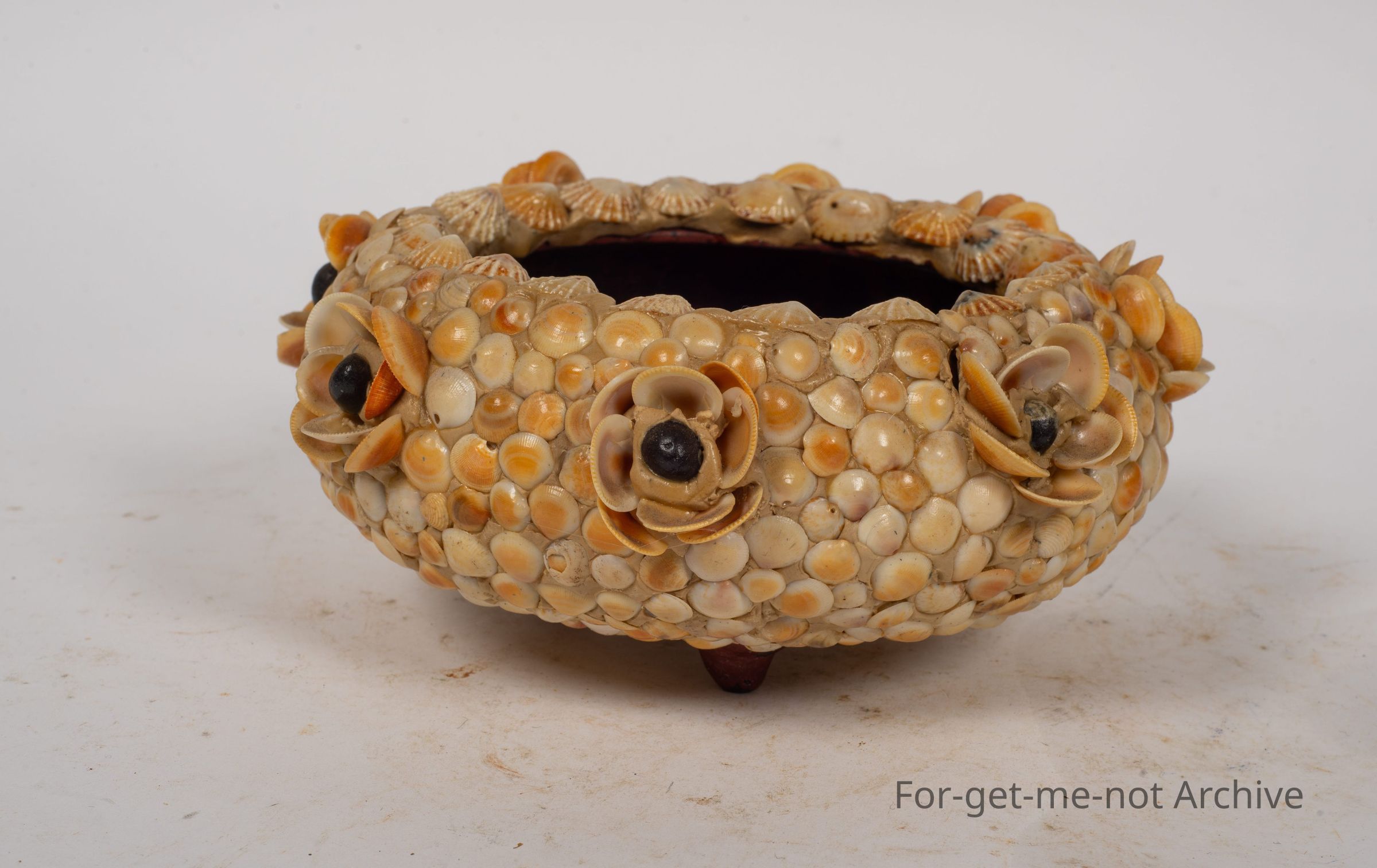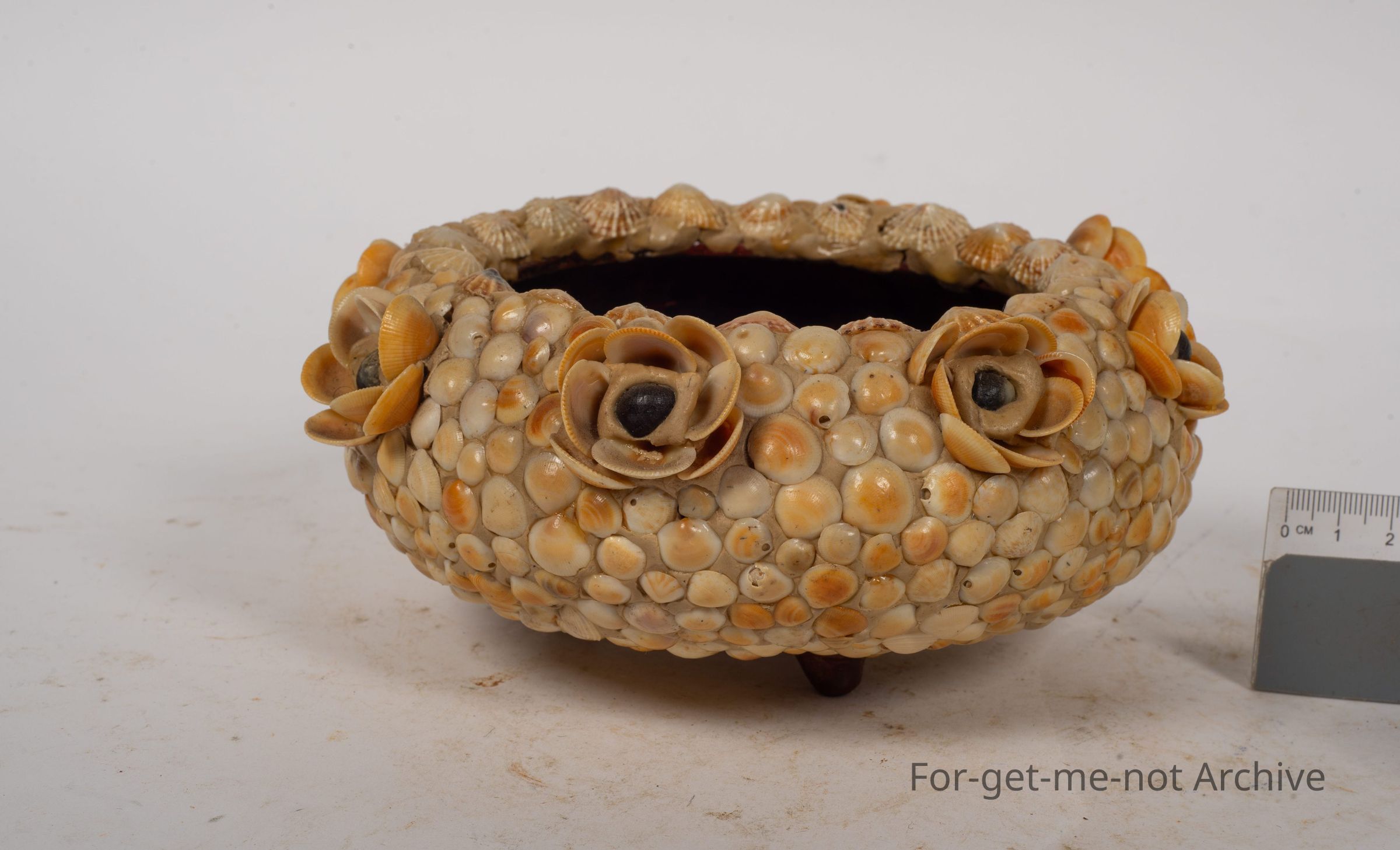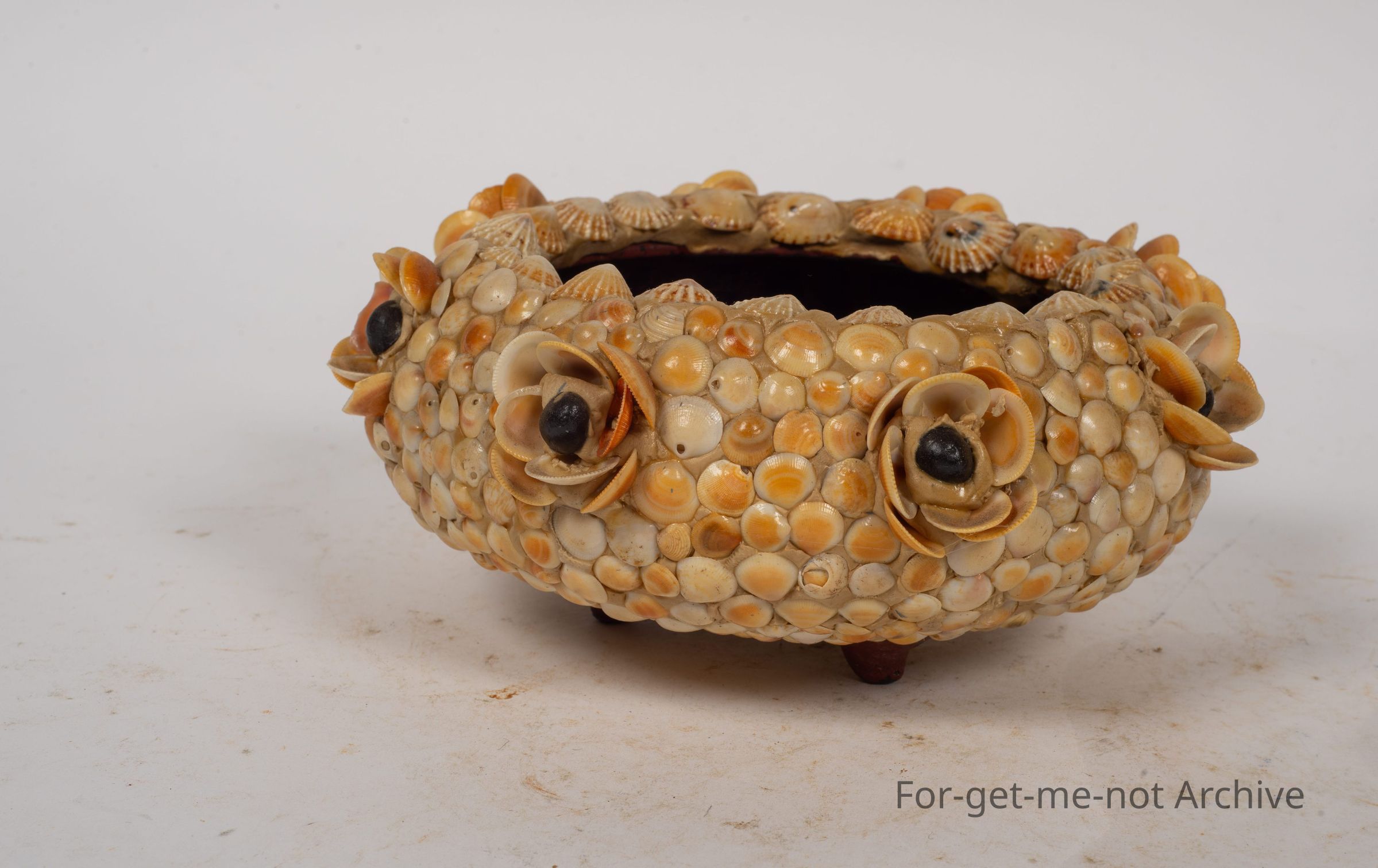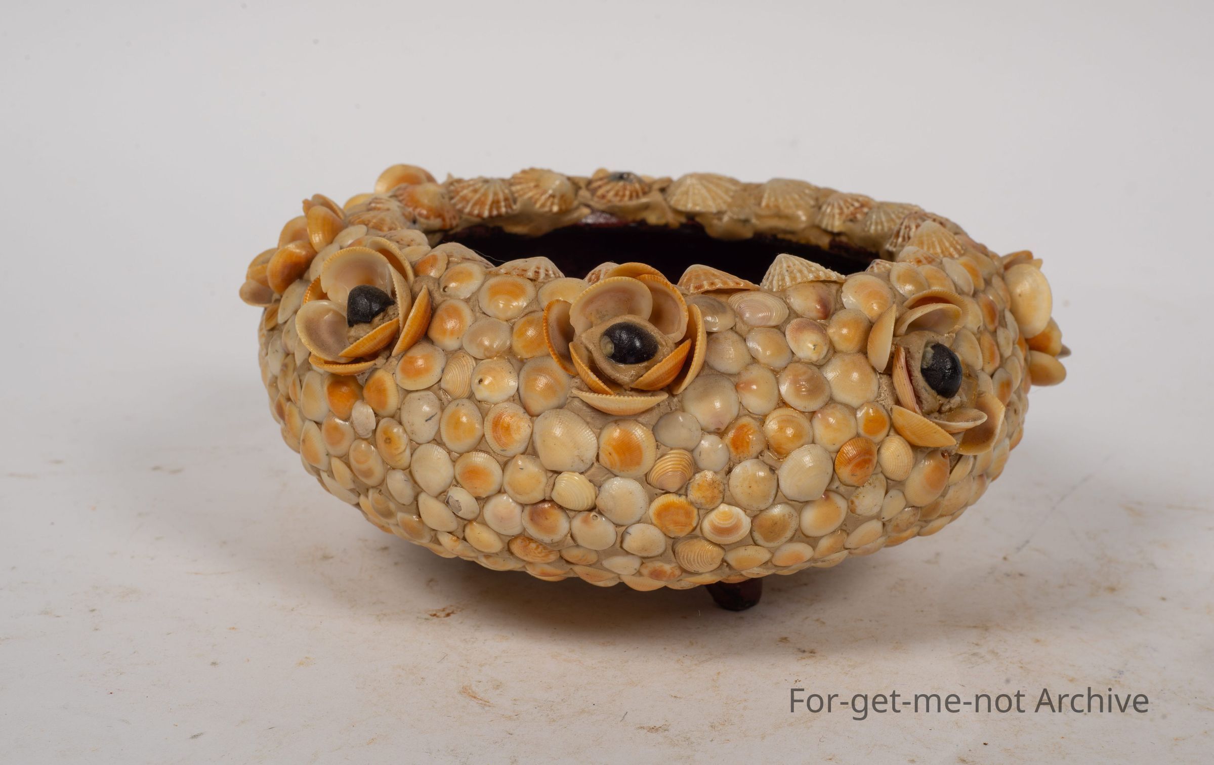 This is a bowl, once again, used for mosaic of seashells, even, little legs, flowers around the outside. Someone's put a lot of time into this.