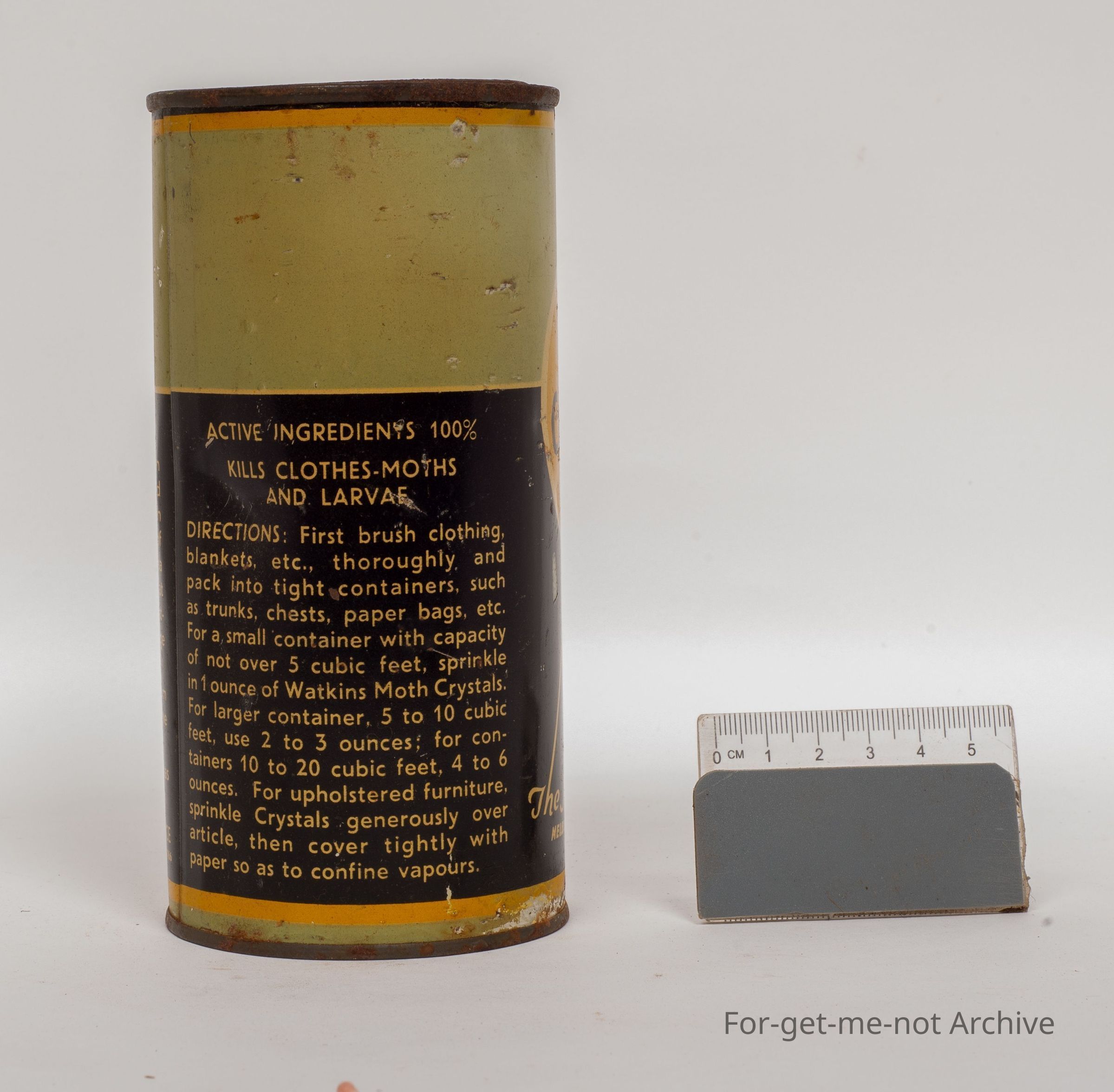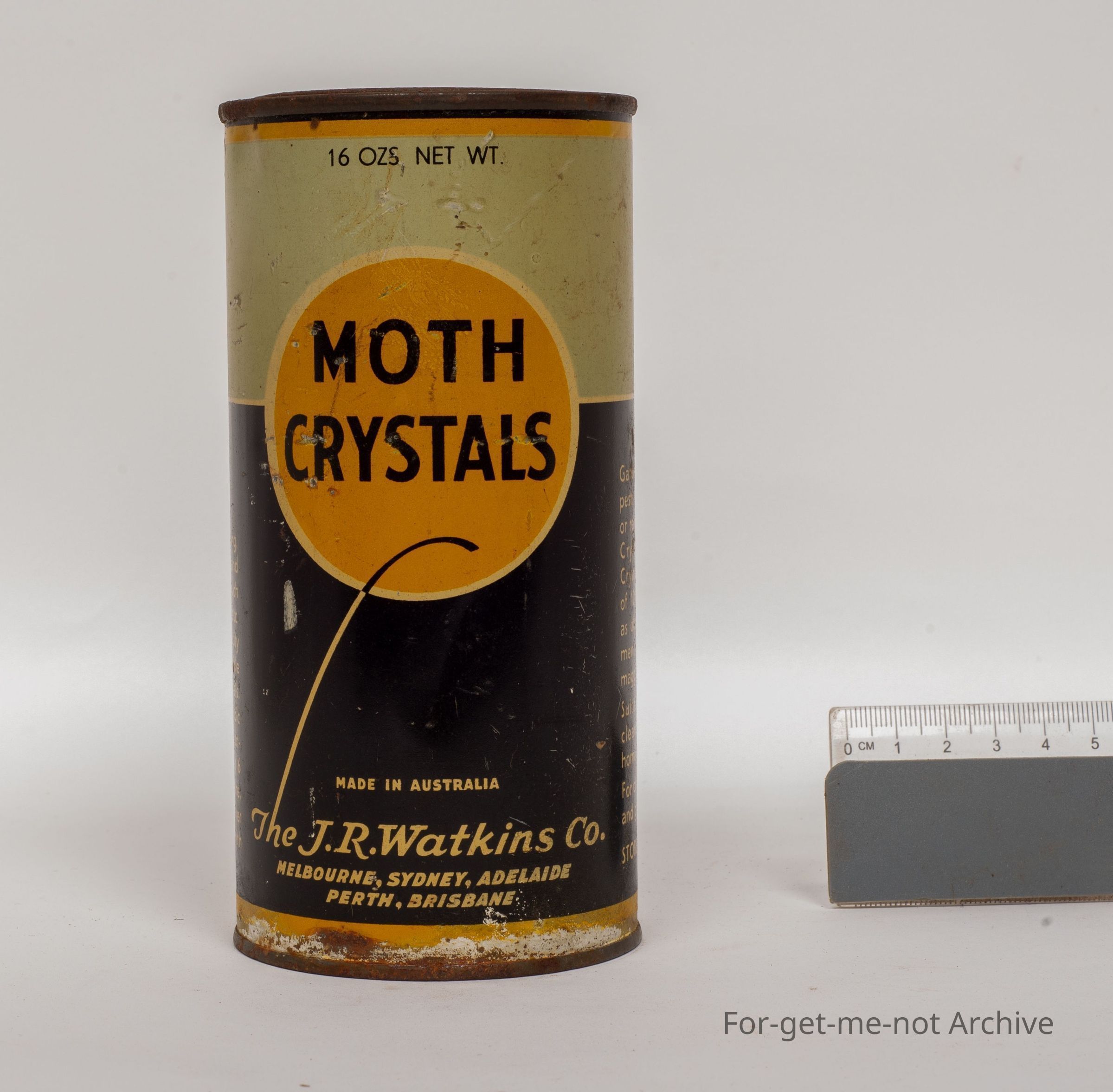 This is a tin of moth crystals for getting, clothes moths eradicated, made by or packaged by JR Watkins and Co Melbourne, Sydney, Adelaide, Perth, 16 ounce net weight, in very good condition for a tin that's rarely ever seen.Collection