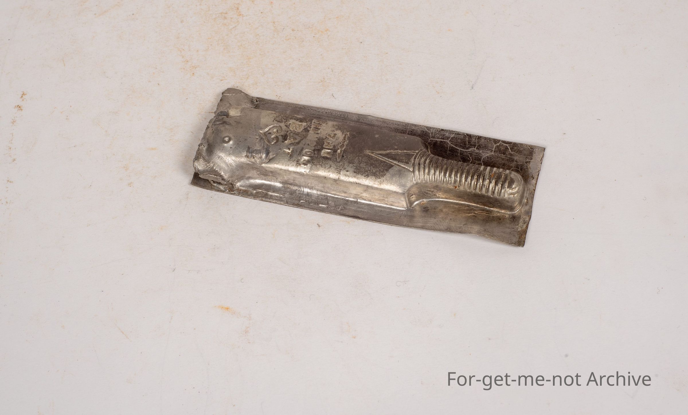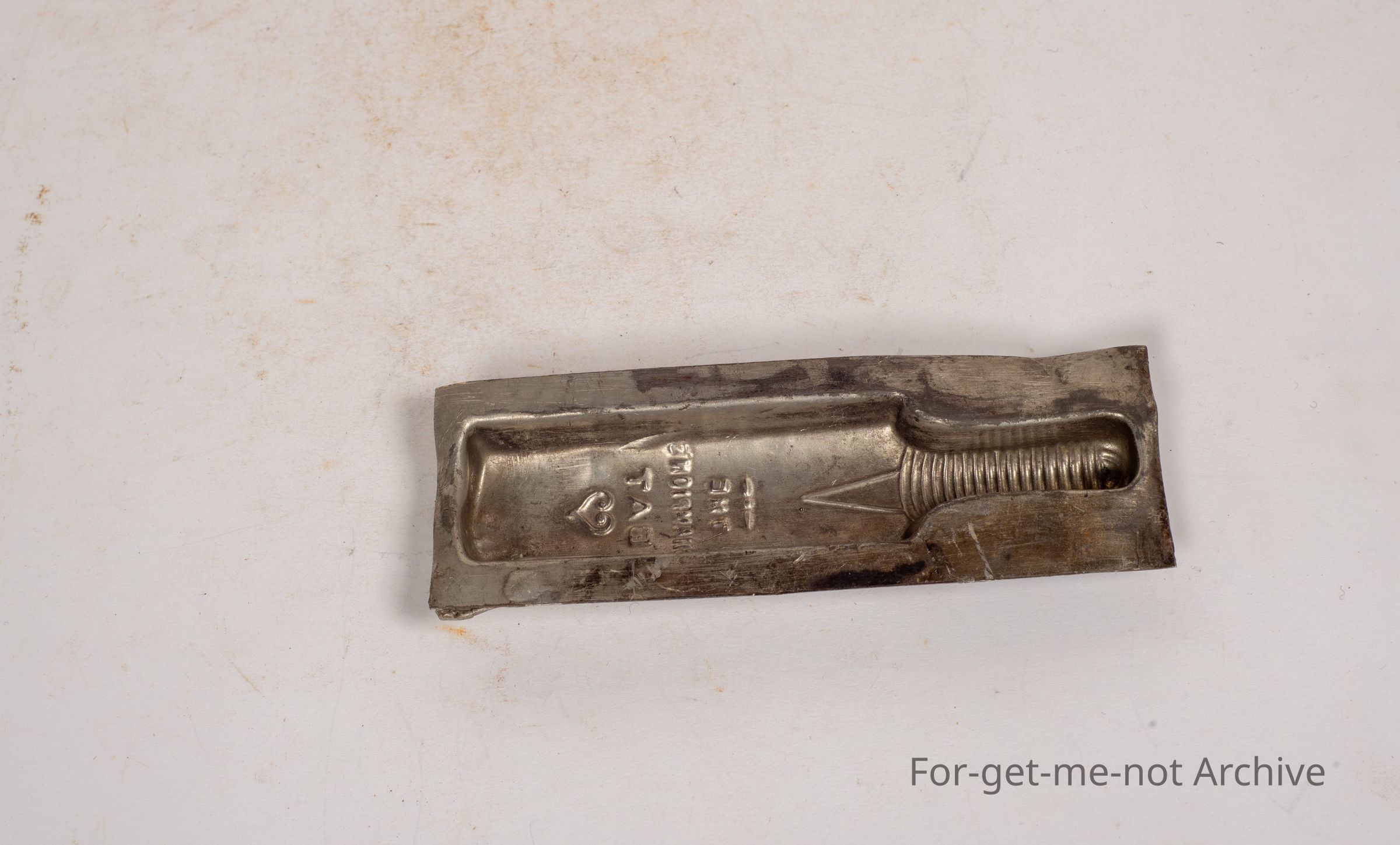 Tin chocolate mould for a cricket bat, this little mould in the shape of a bat would end up with a bat, " the champions bat" would be printed into the chocolate, probably a scarce item.Collection