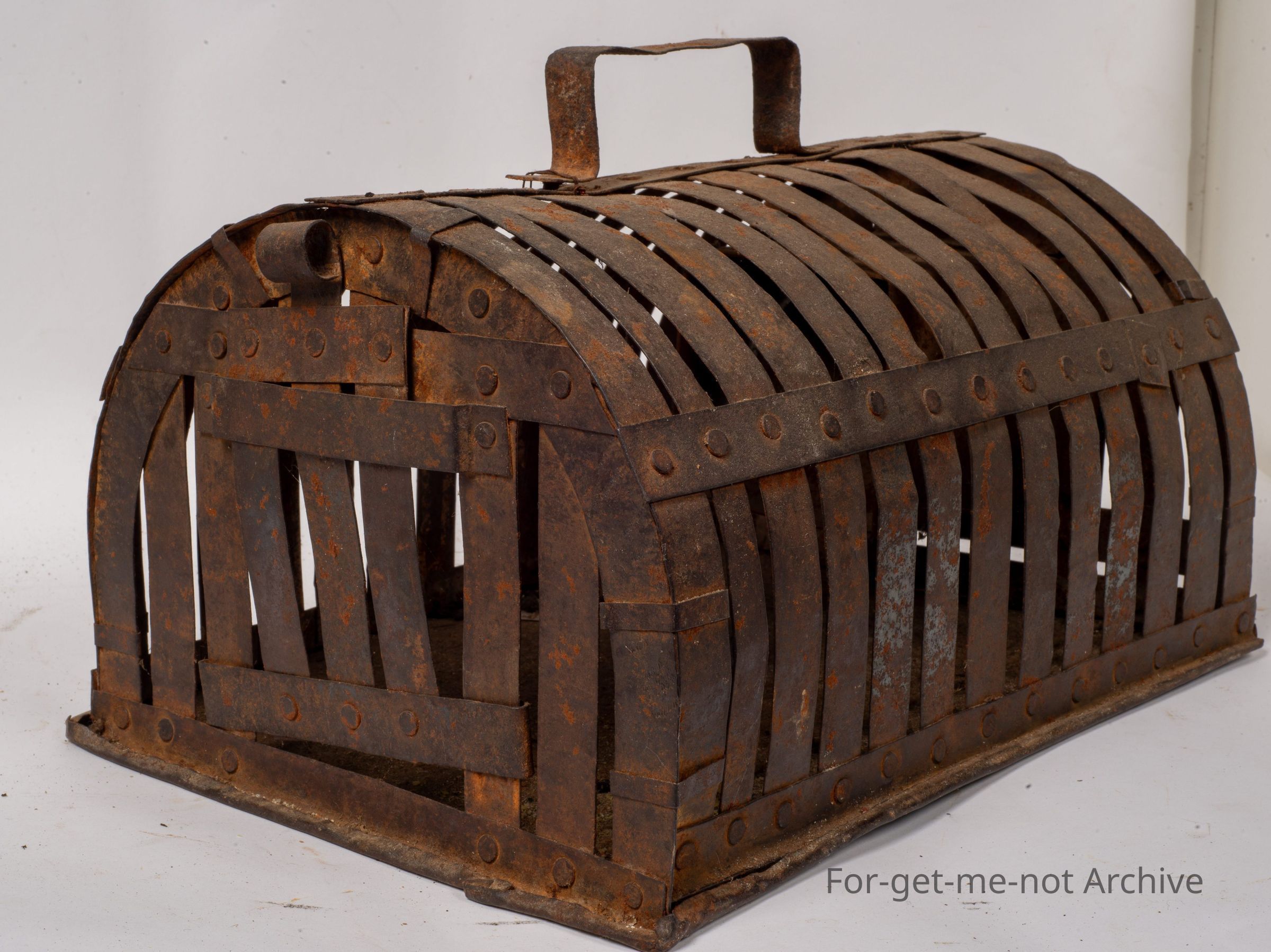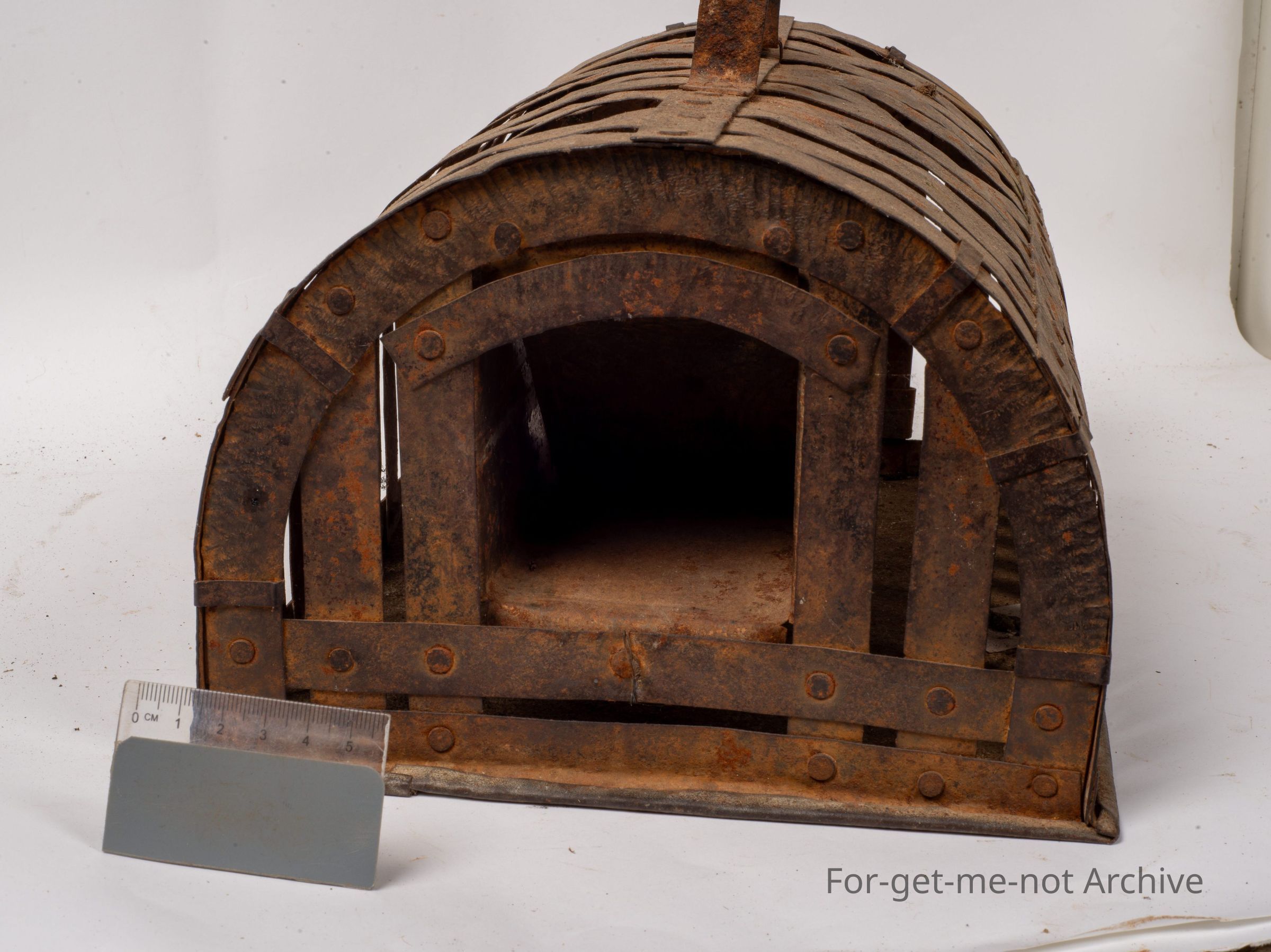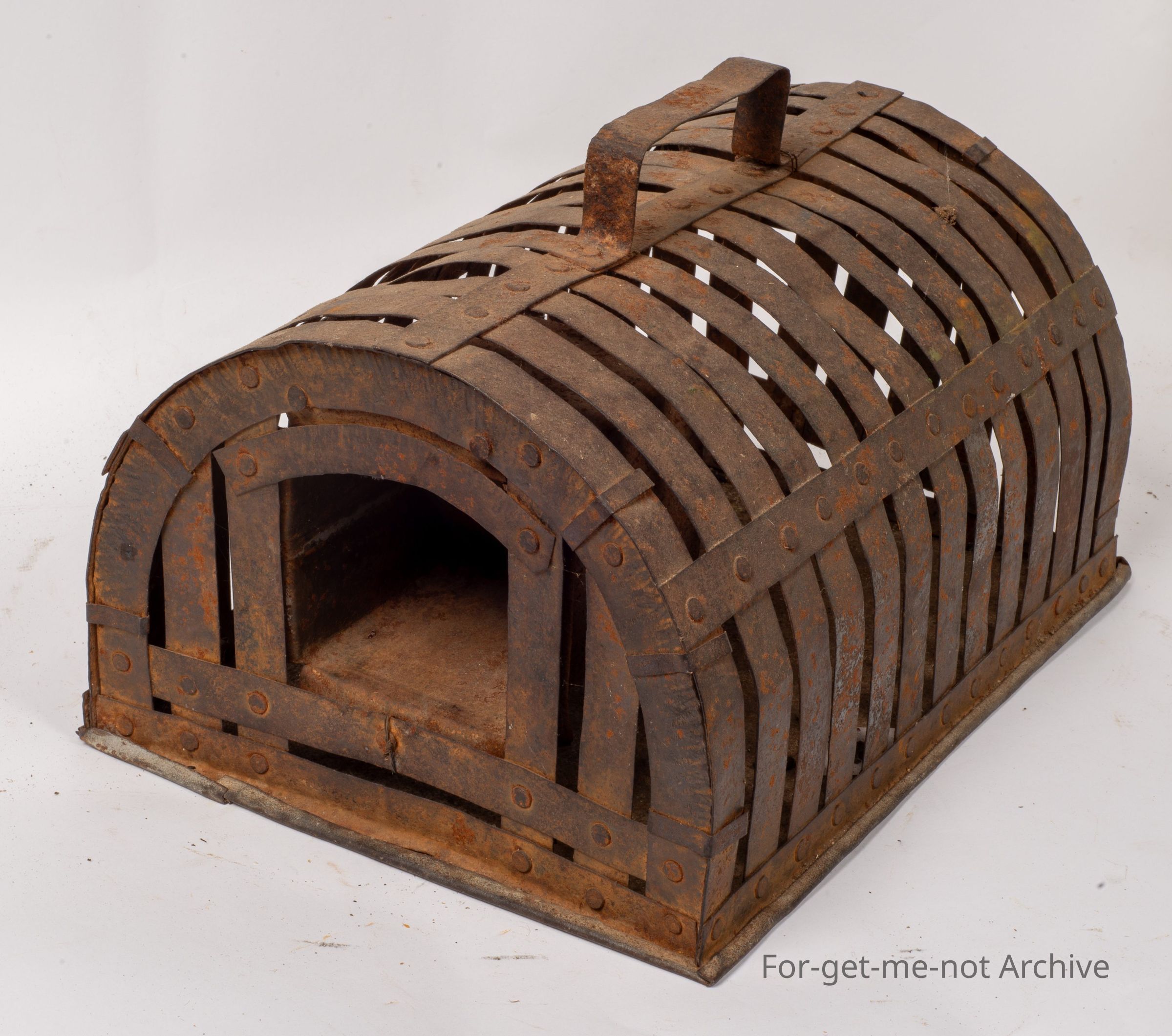 Is a classic piece of improvisation. This is a rat trap completely made from hoop iron with a tin base. It has a very clever trap door for the rack to go in, but he can't get out. A sliding door at the back to get the victims away. This is a very interesting piece.Collection
