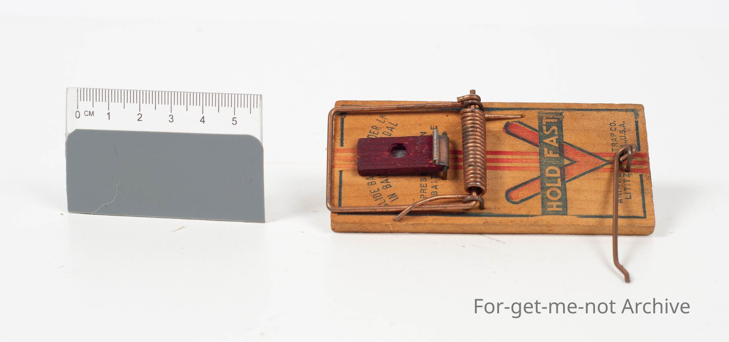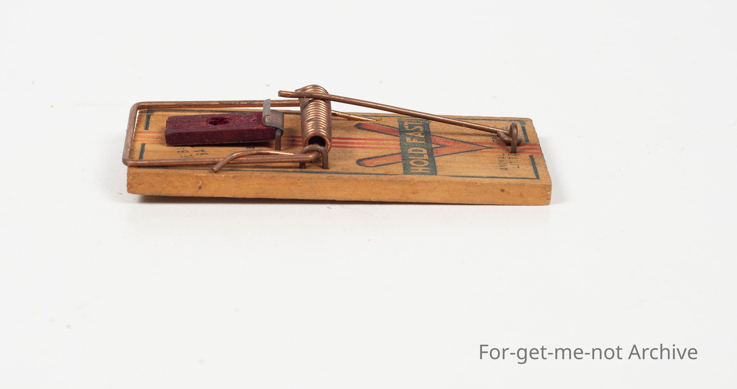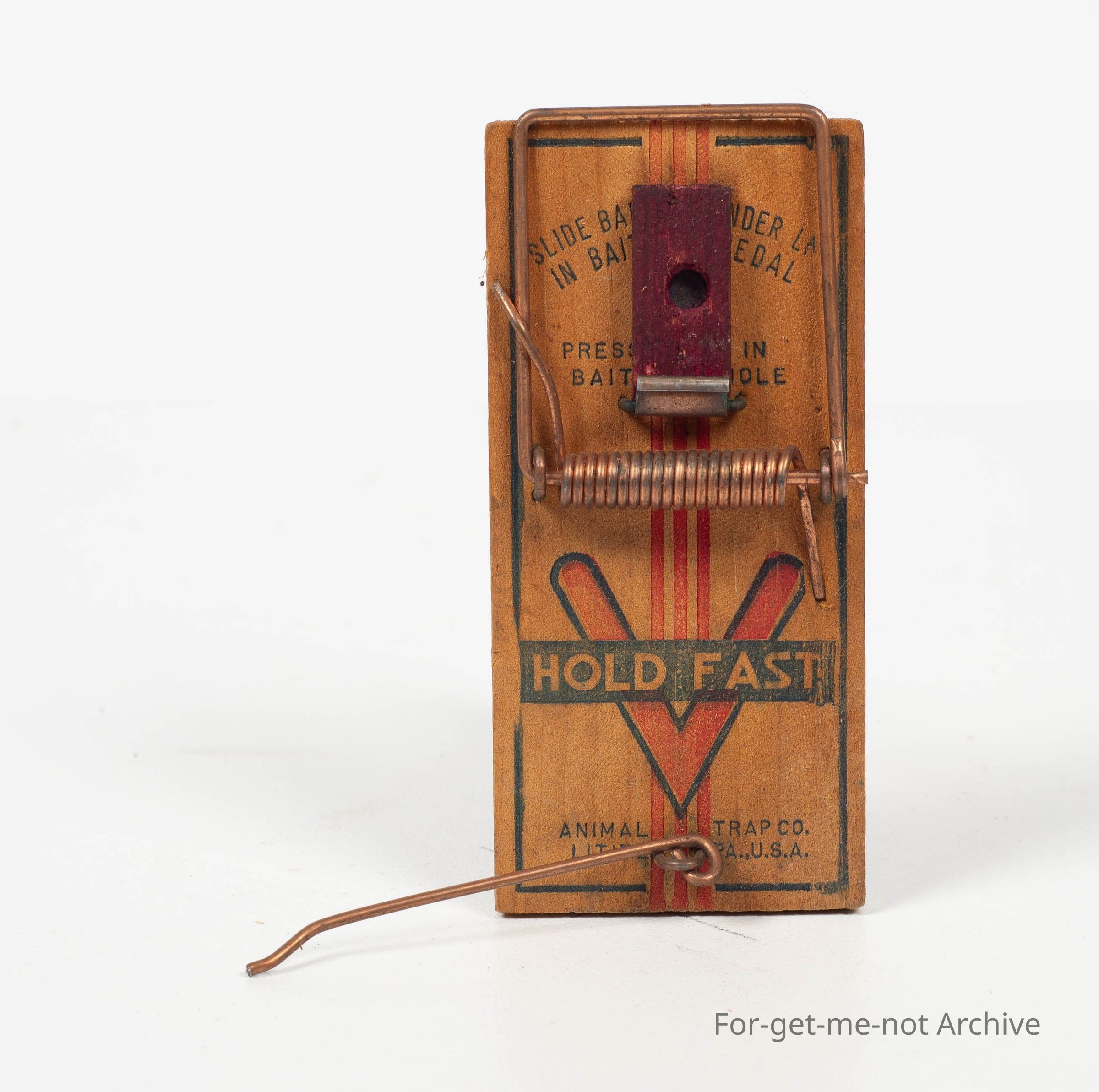Wooden base mousetrap. Stamped: 'Hold Fast'. Made in USA.