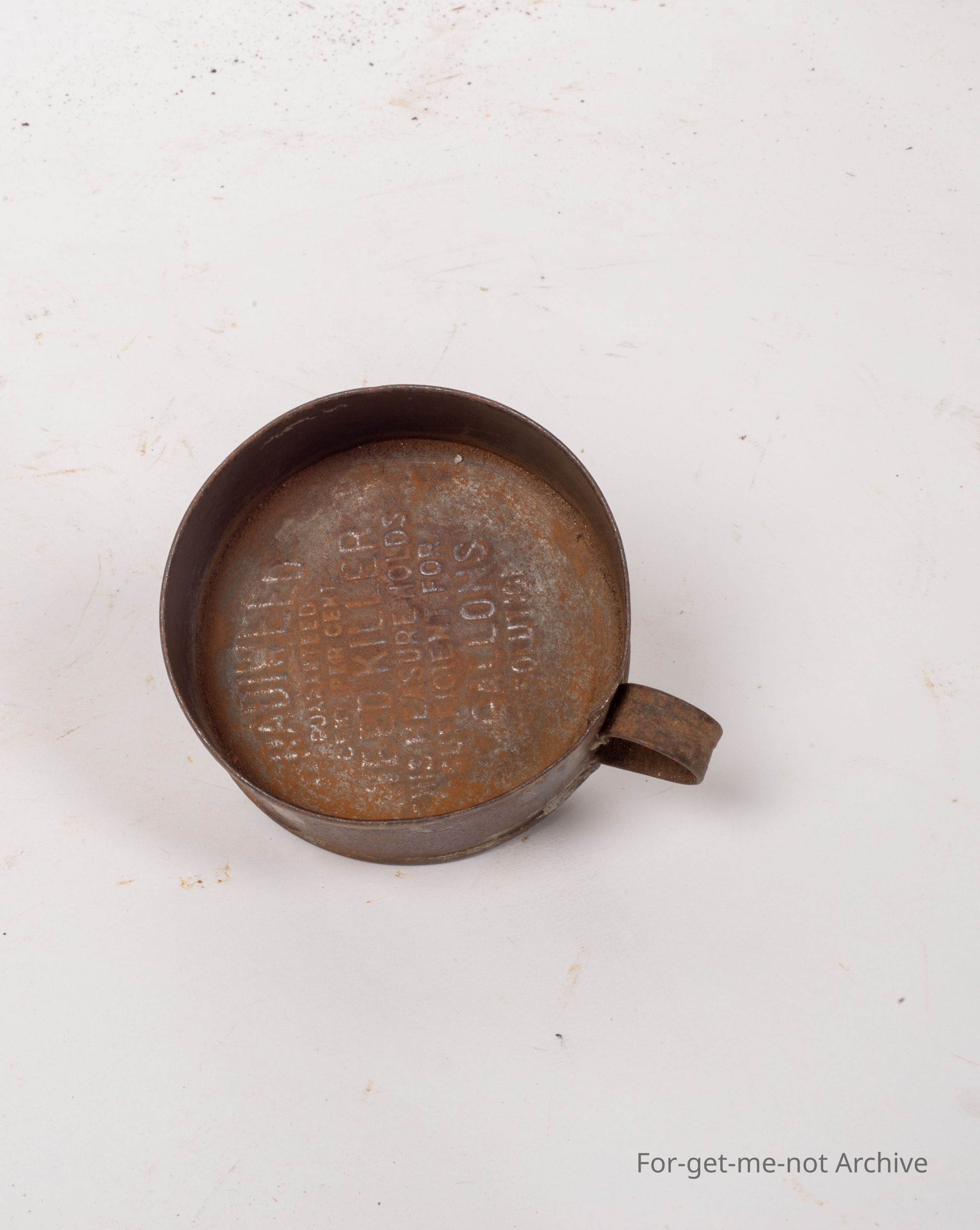 Is a small tin mug, soldered together, embossed into the base, is warty weed, guaranteed weed killer. This measure holds sufficient for 5 gallons. A cute little piece, but it's not homemade.Collection
