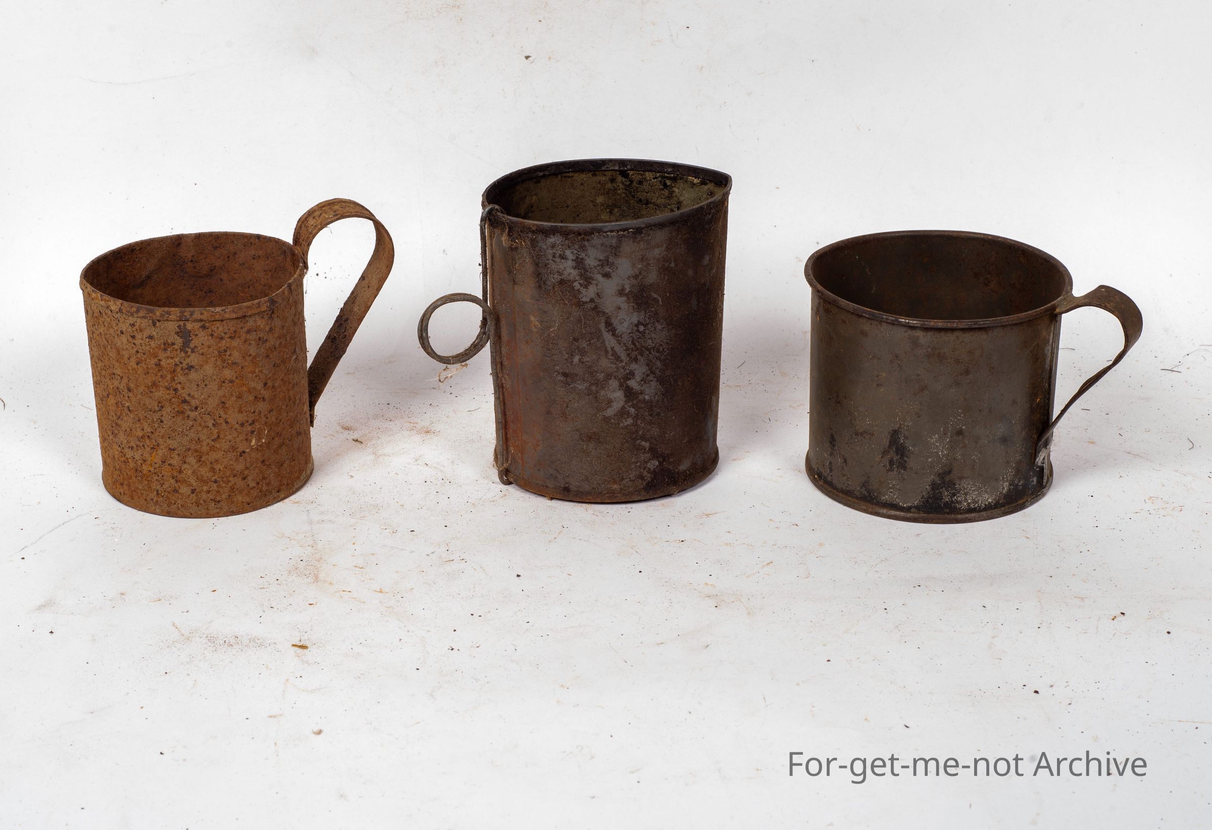 These are 3 mugs all improvised by adding handles to food cans, soldered on a bit of flat tin. One has an improvised handle made from wire which hooks on the top and bottom rim. The third one is another soldered flat piece. These are classic pieces from the depression.Collection
